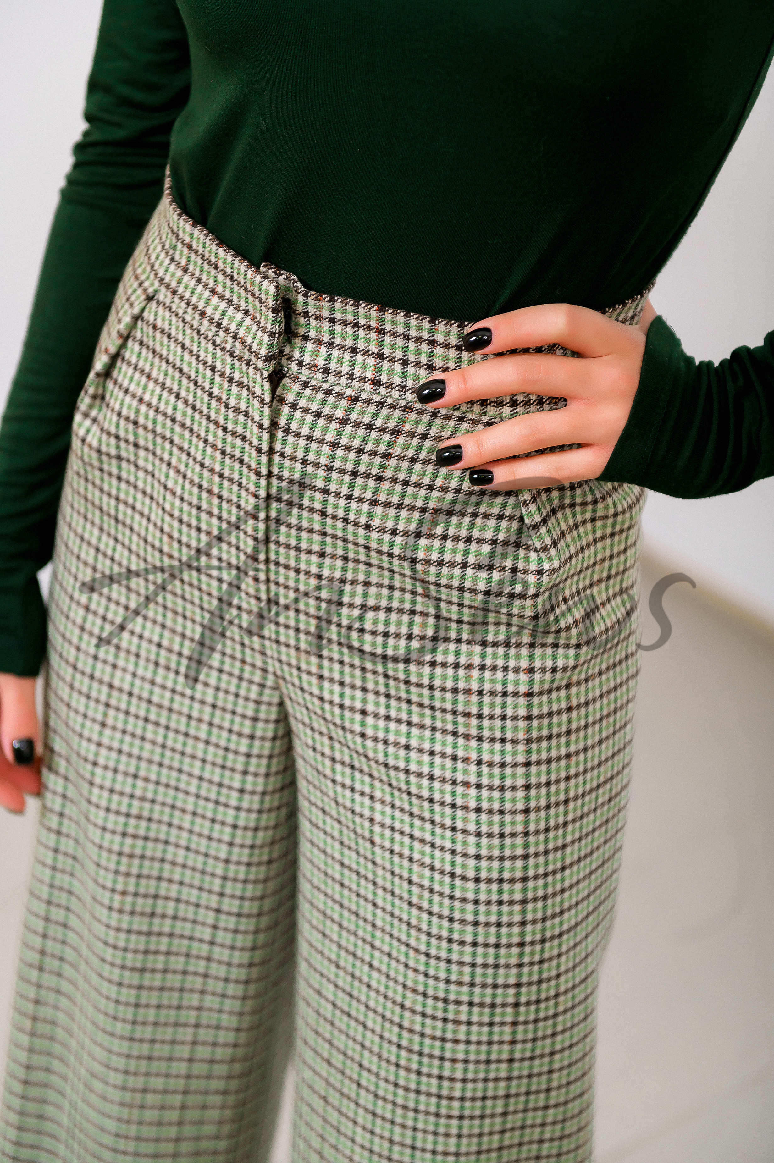 Прямые брюки из костюмной ткани, облегающие по бедрам. Пояс брюк располагается на естественной линии талии. Пояс притачной. По линии банта расположена застёжка на молнию и крючок. На передних половинках расположены защипы, на задних половинках брюк – вытачки.