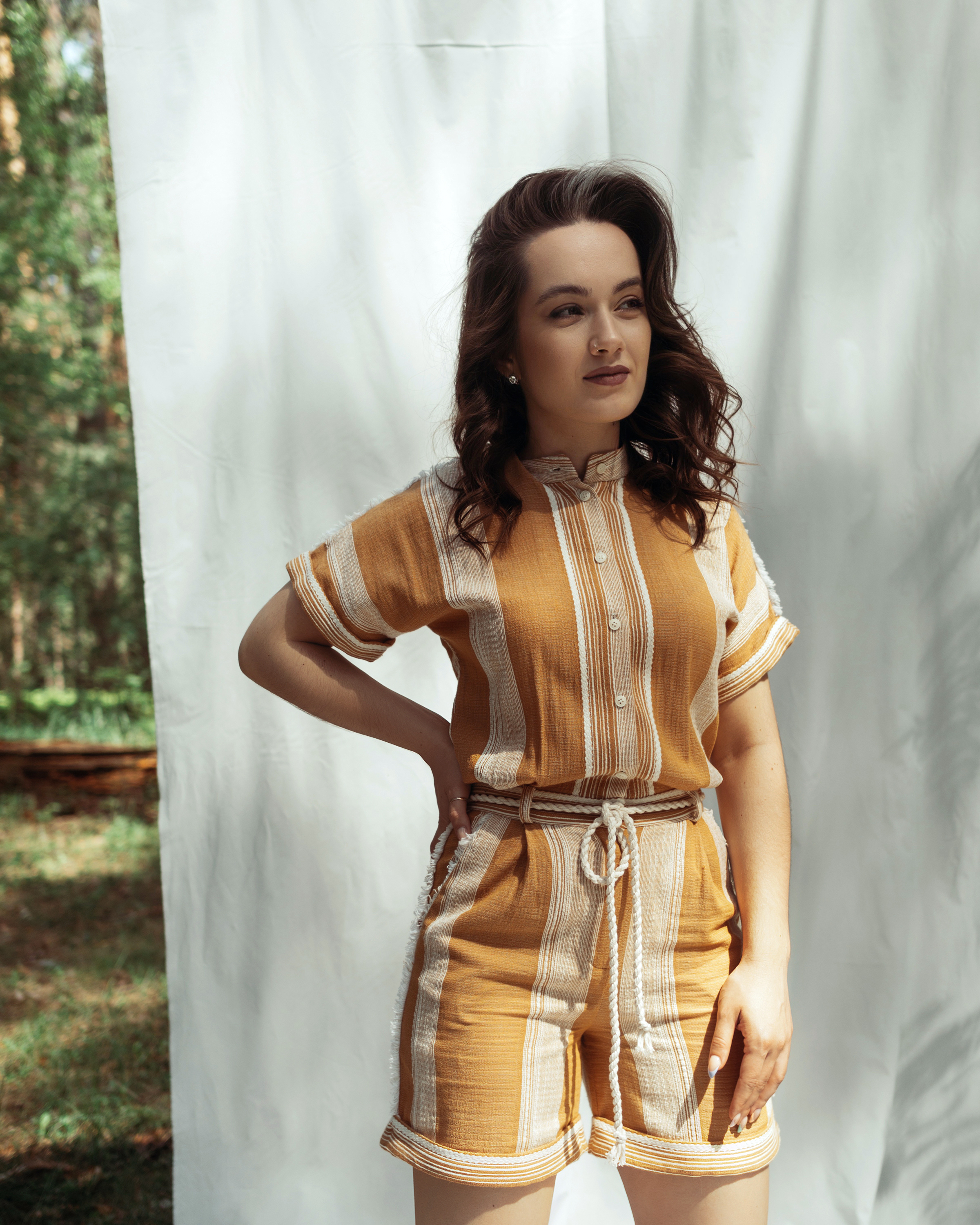Комбинезон летний, из тонкой ткани. Лиф с цельнокроеным коротким рукавом, по низу рукавов – притачные манжеты. Воротник – стойка, застежка на пуговицы. Пояс двойной, со шлевками. На шортах выполнены защипы по передней половинке карманы с подкройным бочком, застежка на молнию. По низу расположены притачные манжеты. В швах вшита декоративная бахрома.