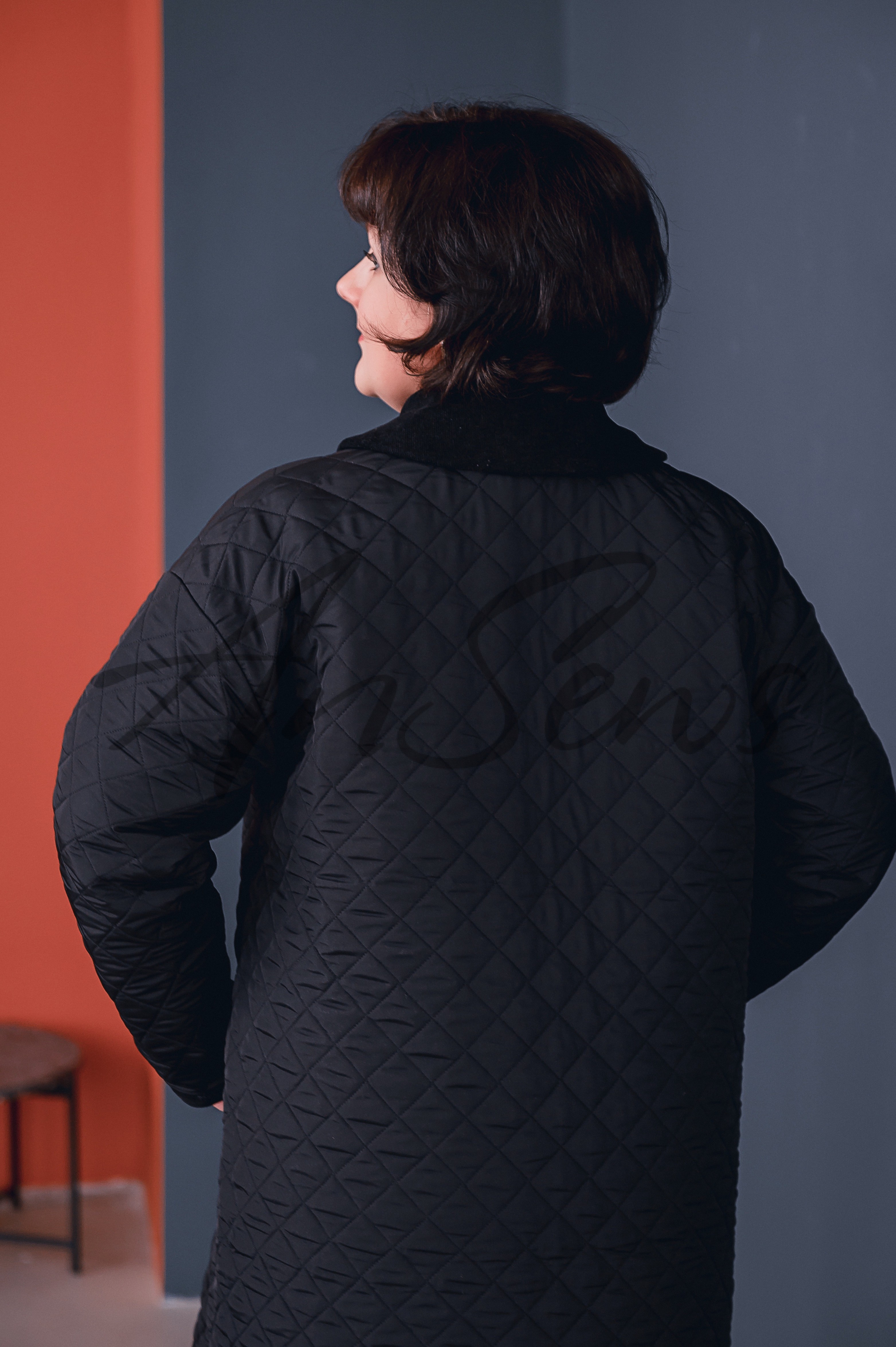 Пальто из стеганой двухсторонней ткани (плащевки) с синтепоном, отделка выполнена из микровельвета, который используется при обработке карманов, припусков на швы, края изделия и воротника. Пальто А-силуэта, со спущенным плечом. Рукав рубашечный, неширокий, зауженный к низу. Карманы прорезные «в рамку». Воротник отложной, с отрезной частичной стойкой. Пальто застегивается на молнию, скрытую под цельнокроеной планкой.