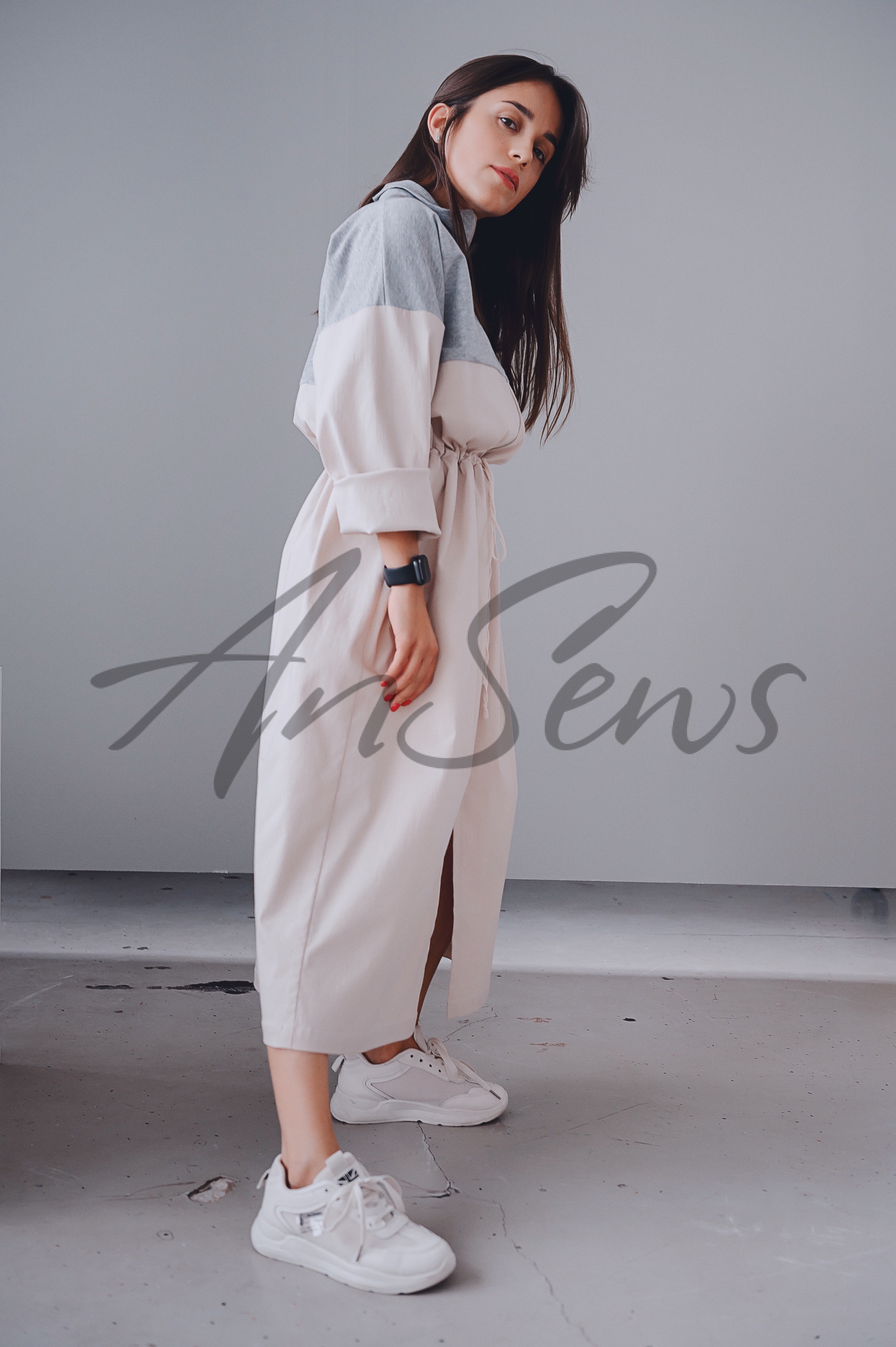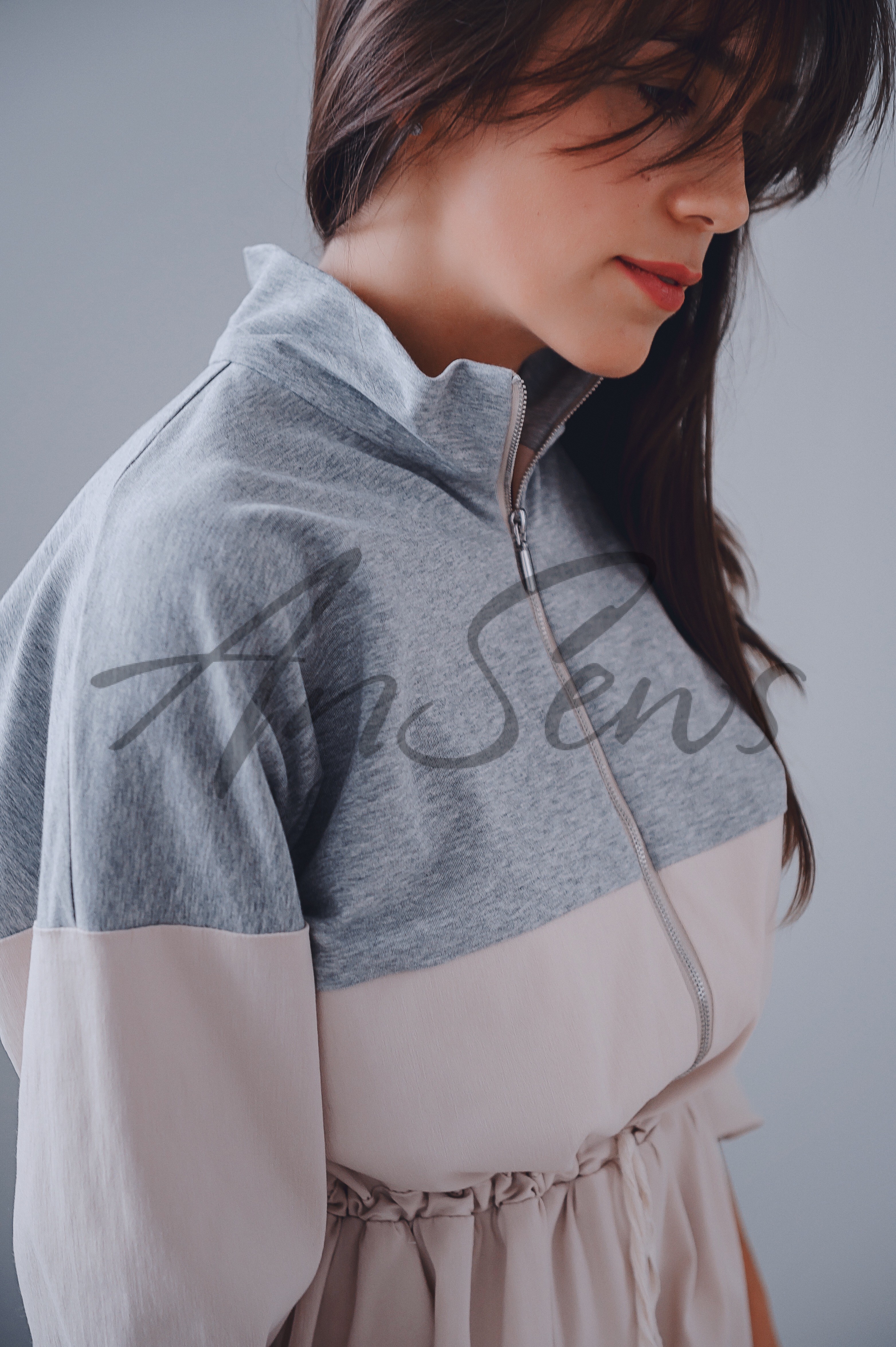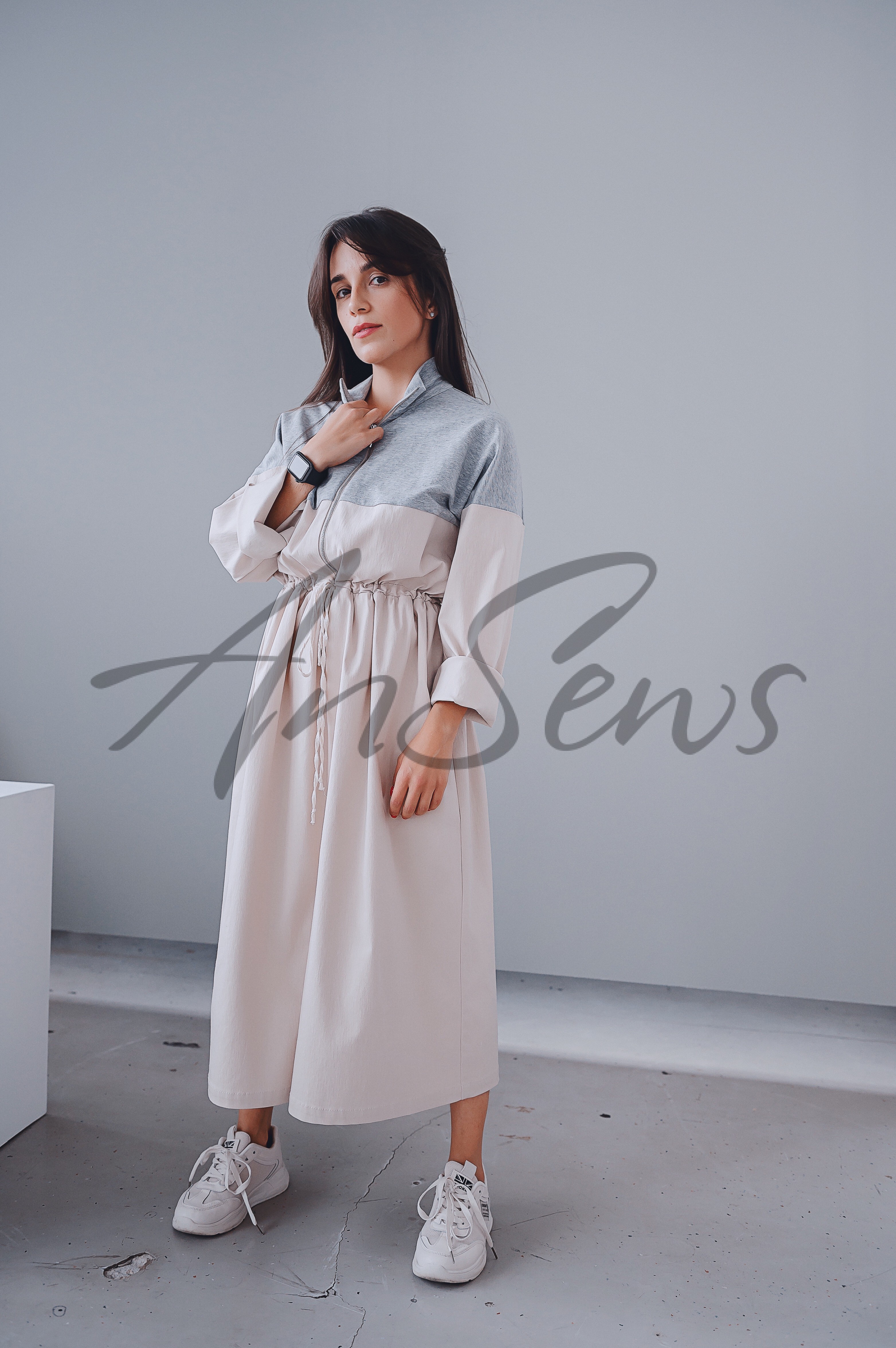 Платье комбинированное из футера и бенгалина, спортивного стиля, отрезное по линии талии. Воротник платья выполнен из трикотажа. Застежка выше линии талии – молния. Рукав рубашечный, прямой. По линии талии – кулиска со шнуром. Нижняя часть платья – прямоугольник со сборками. Спереди на юбке – разрез.