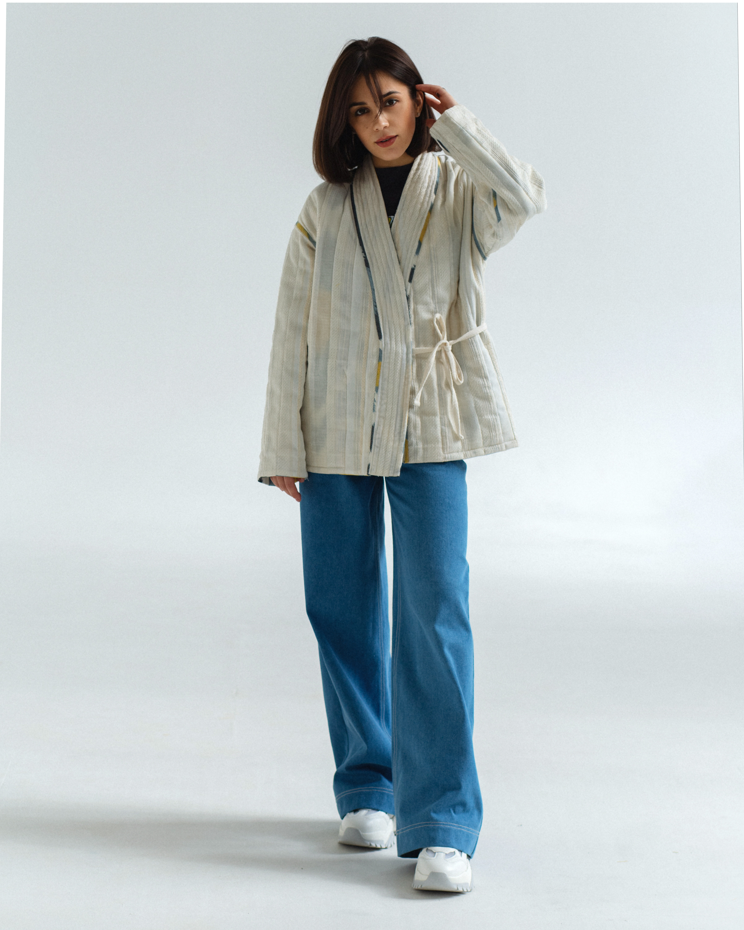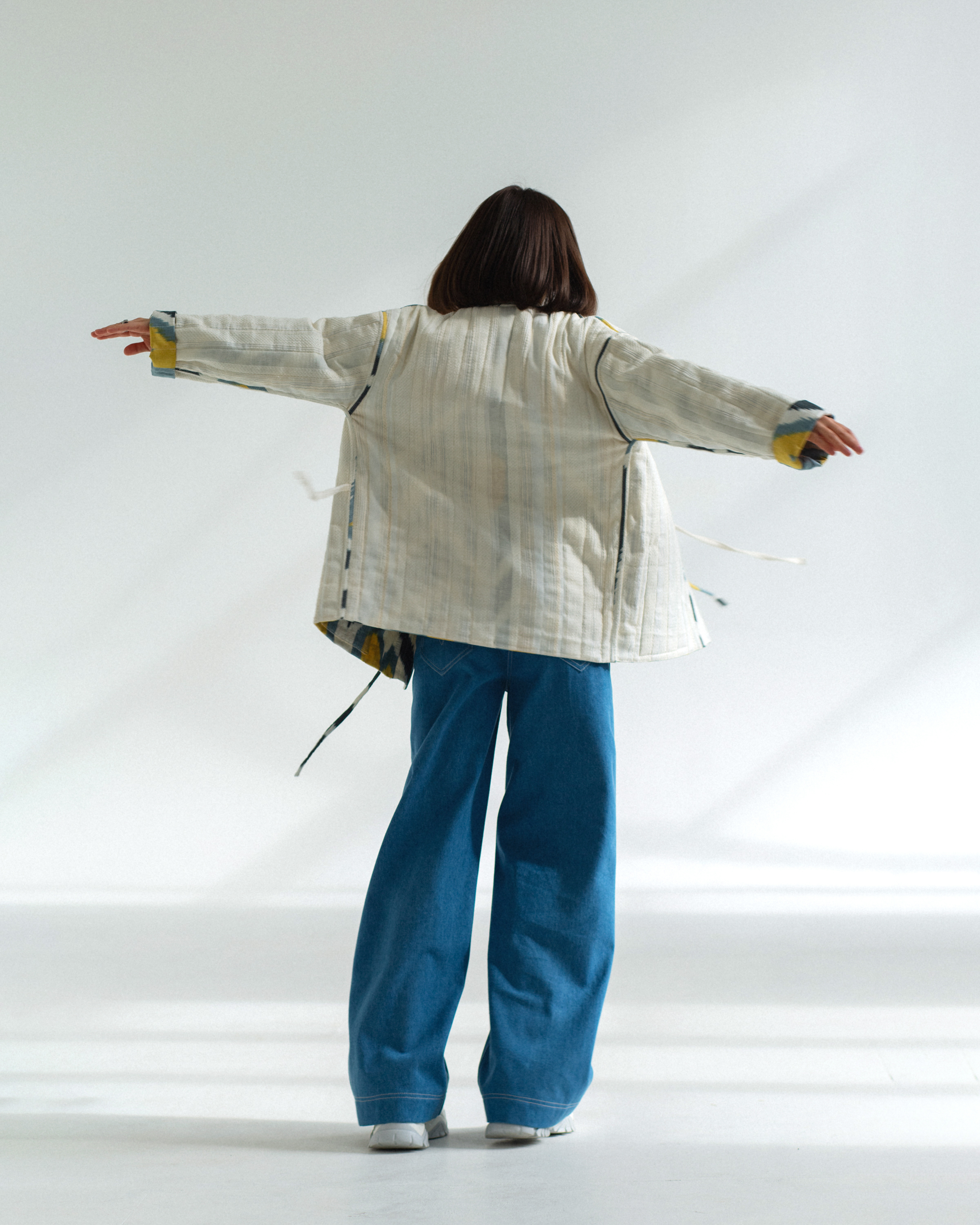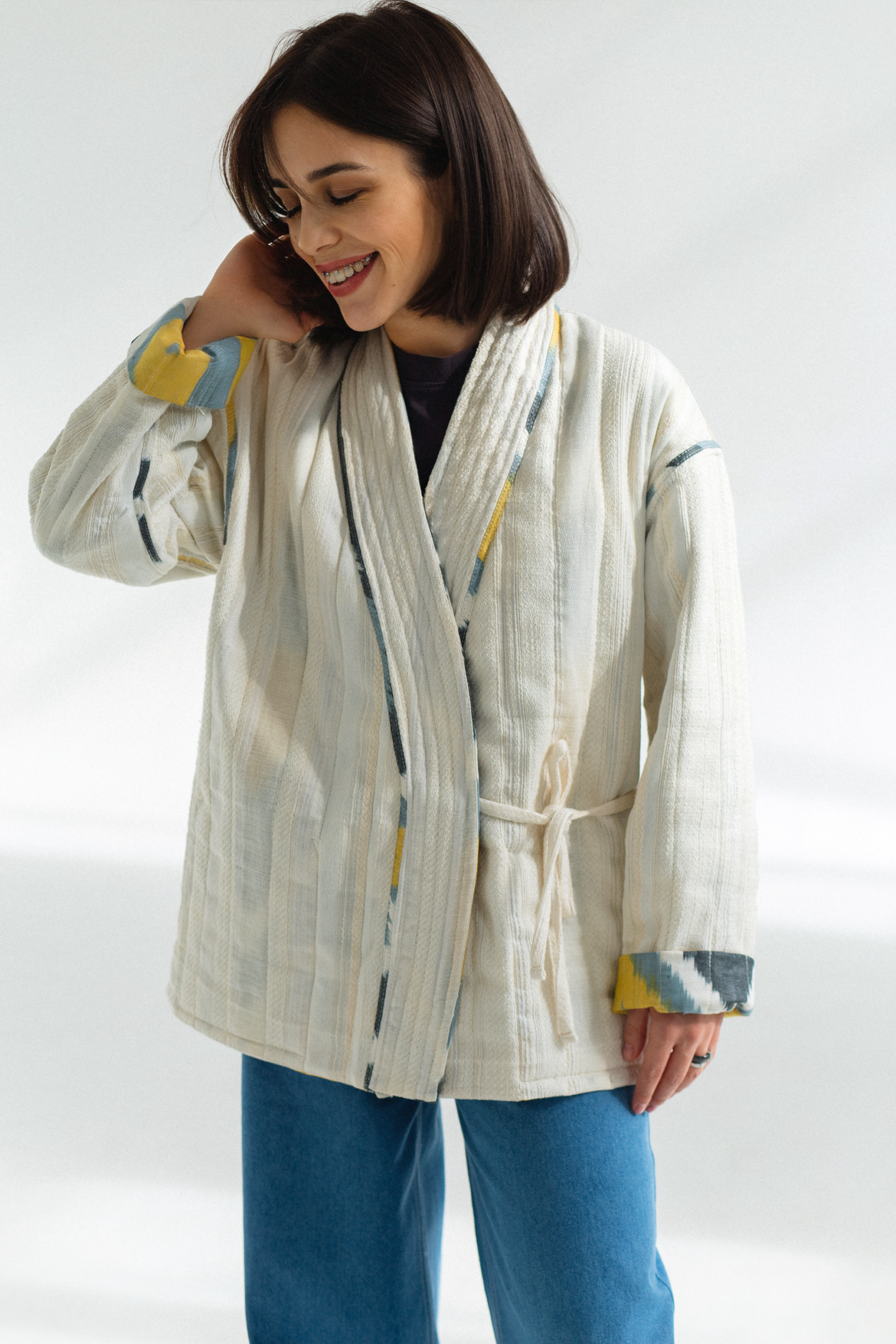 Жакет двусторонний стёганый оверсайз прямого силуэта из хлопчатобумажной ткани икат. Спущенная линия плеча, рубашечный одношовный рукав. Полочки с запАхом на завязках. По борту полочки обработаны притачными стёганными обтачками. На полочках накладные карманы. Бортовые обтачки и накладные карманы на полочках отстрочены мелкой стёжкой.