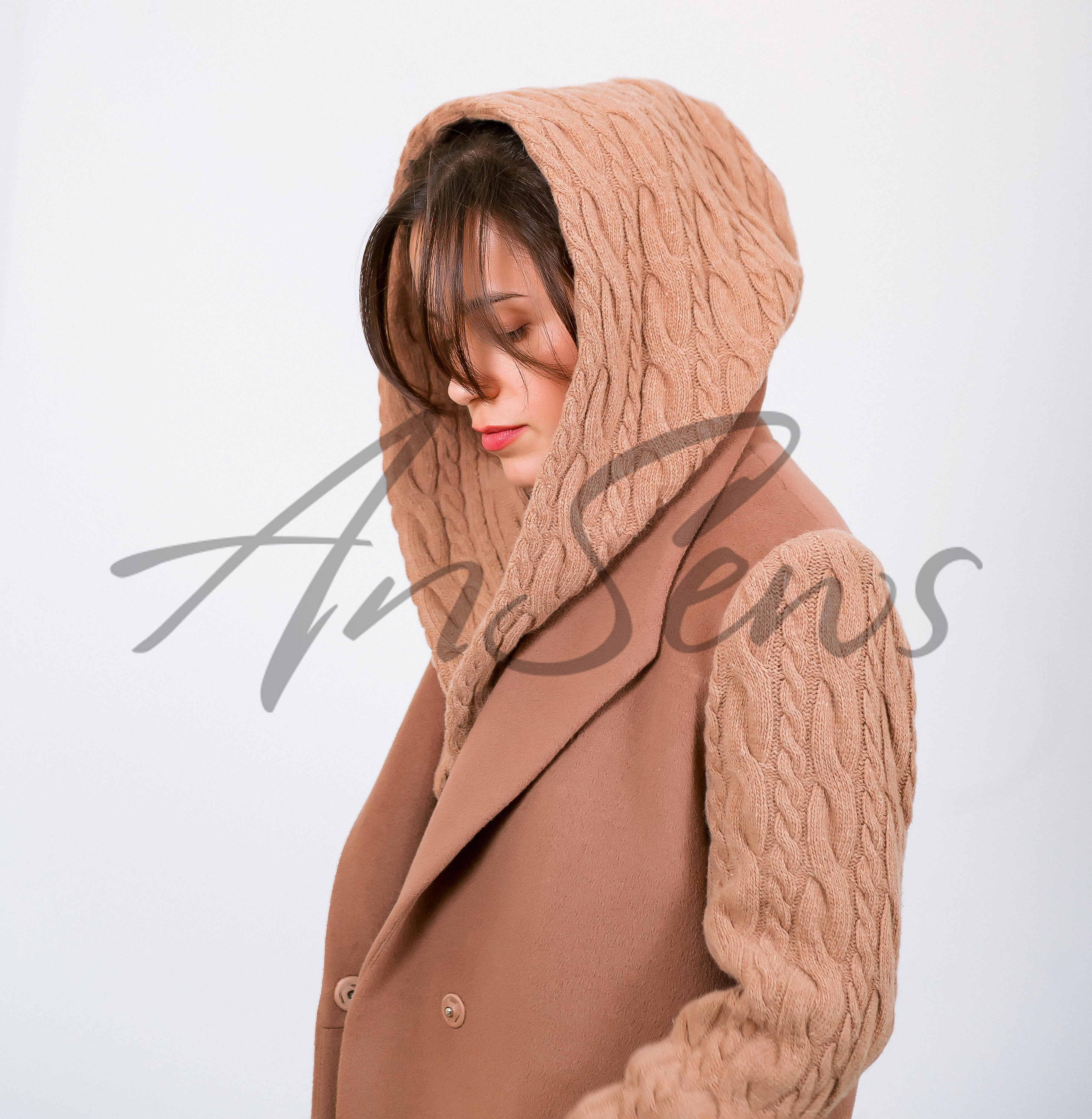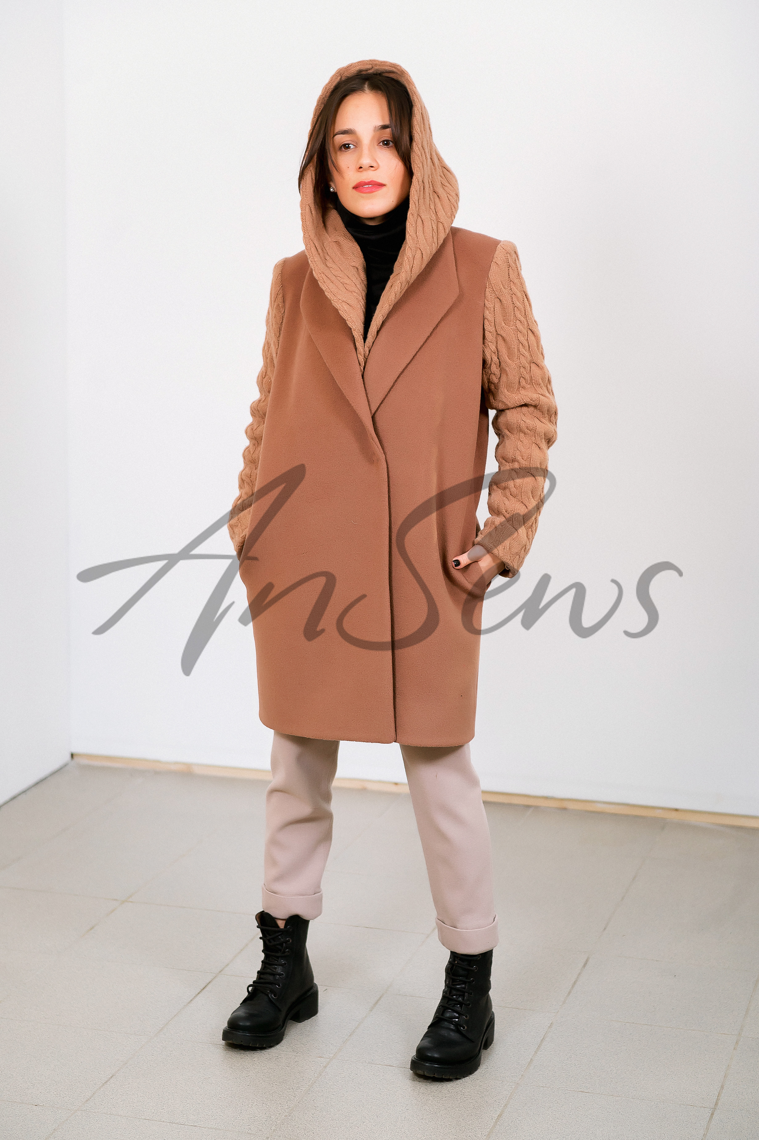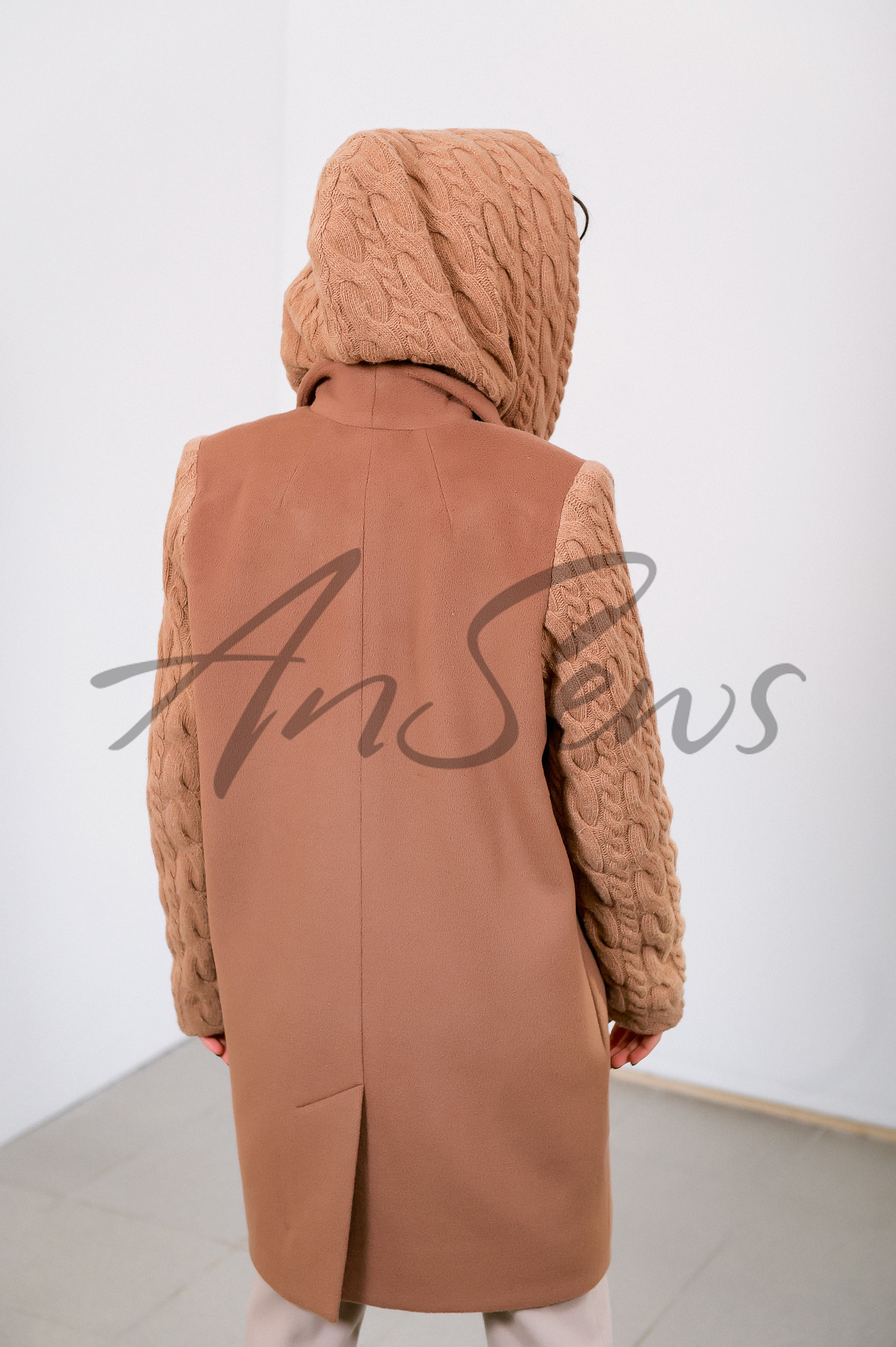 Демисезонное пальто прямого силуэта длиной до колена. Рукава и съемный капюшон выполнены из вязанного полотна. Стояче-отложной воротник апаш. Пальто застегивается на одну кнопку. В комплекте идет съемный пояс. В среднем шве спинки расположена шлица. Рукав втачной, одношовный. Пальто полностью выполнено на подкладке. Капюшон однослойный, без подкладки, пристегивается на кнопки к внутренней части пальто. В боковых швах расположены карманы.