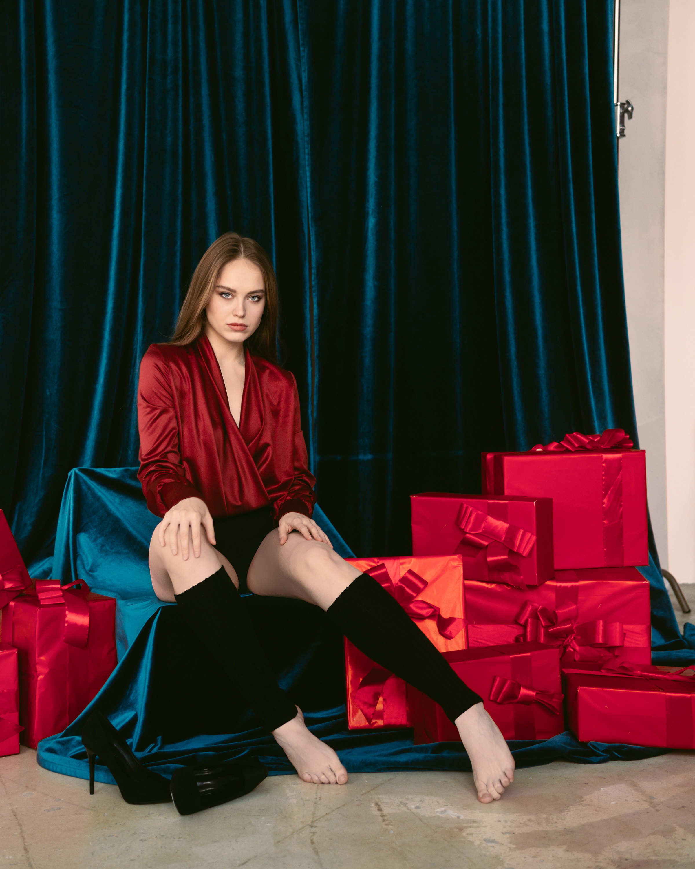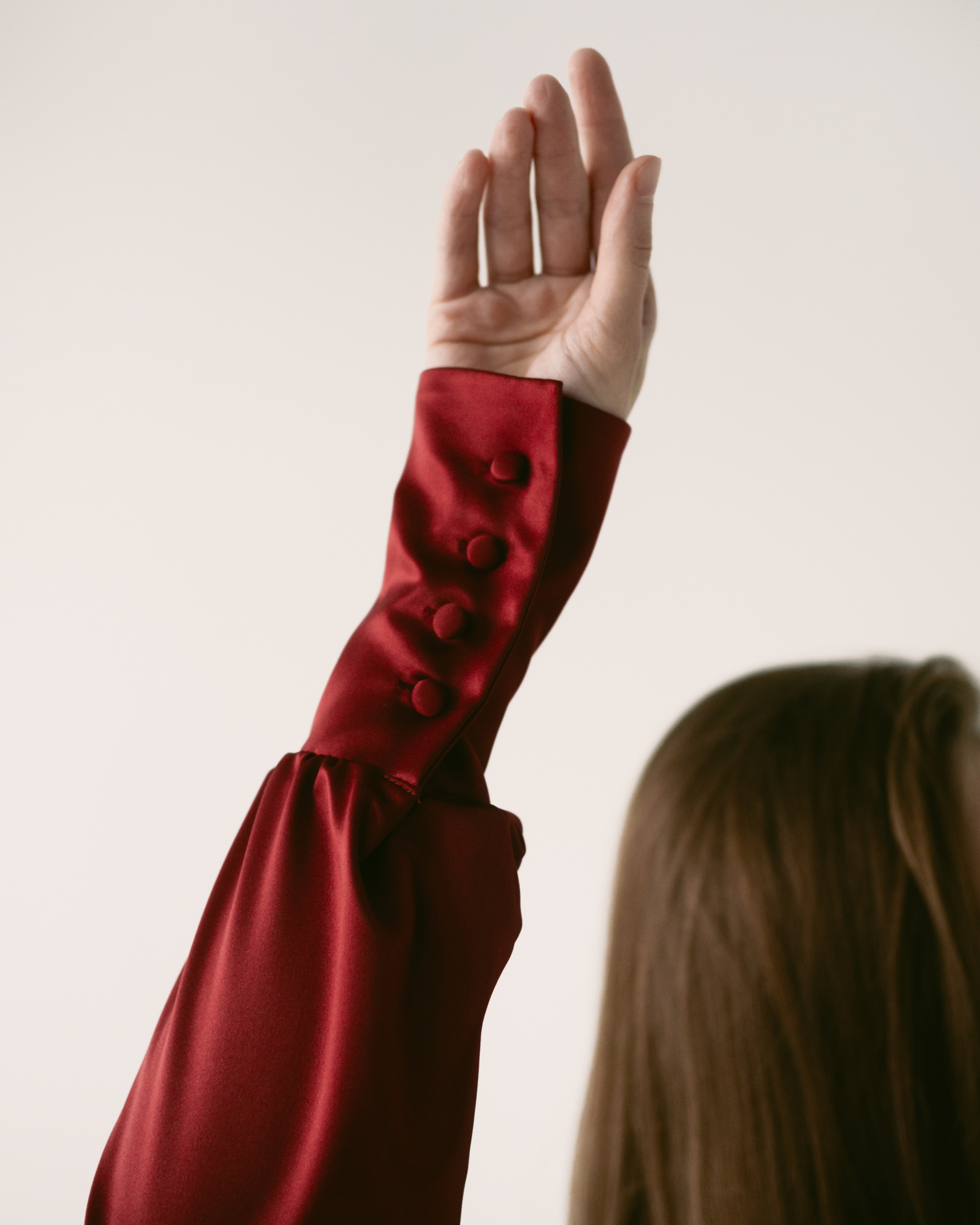 Блузка-боди из шелка, отрезное по линии талии. Спереди на блузке заложены 2 глубокие складки, образующие драпировку. Линия запаха спереди переходит в воротник-стойку на спинке. Рукав втачной, на широкой манжете с застежкой на 4 пуговицы. Нижняя часть боди выполнена из трикотажного полотна, с застежкой снизу. По линии талии пришита резинка.