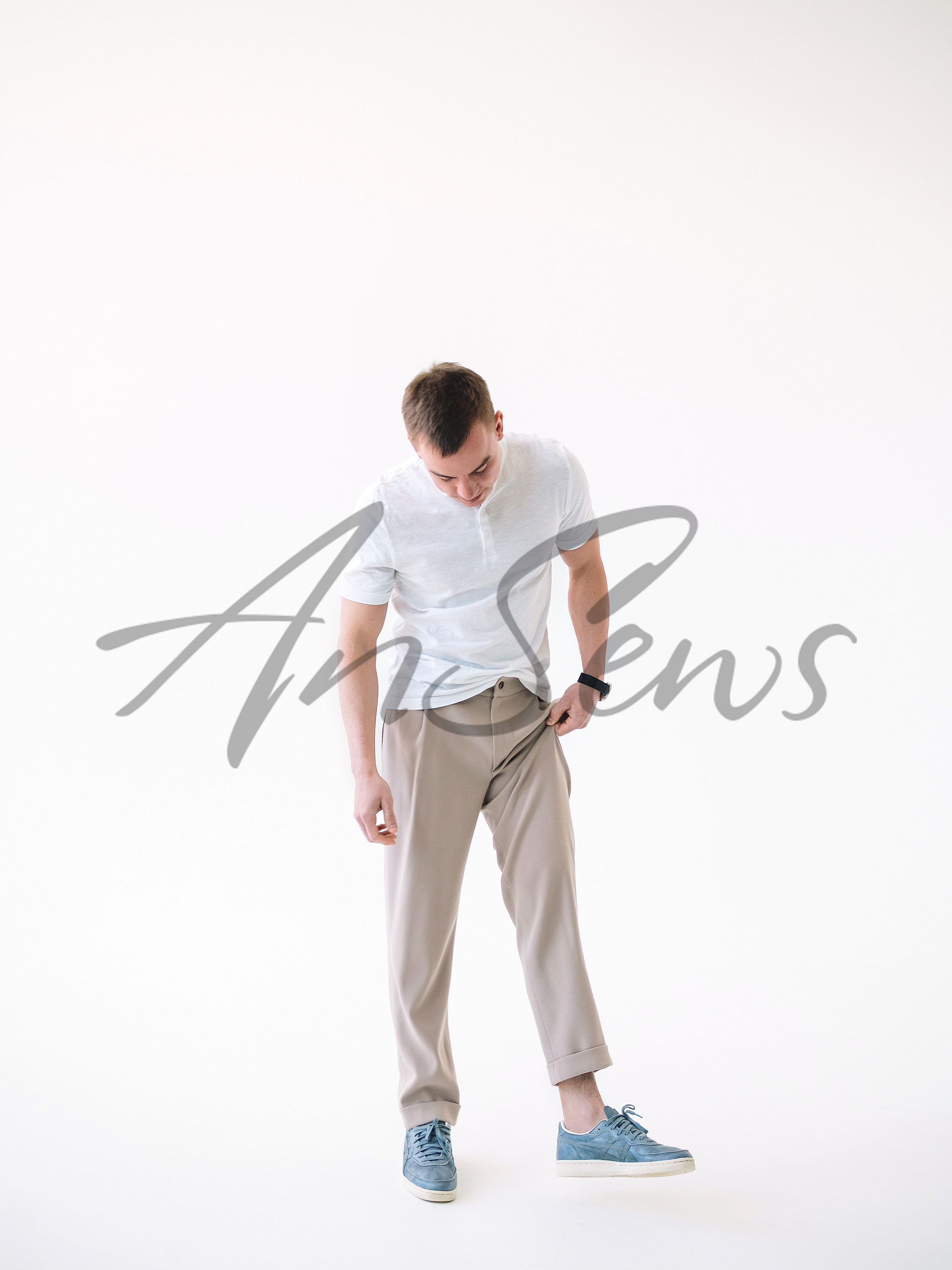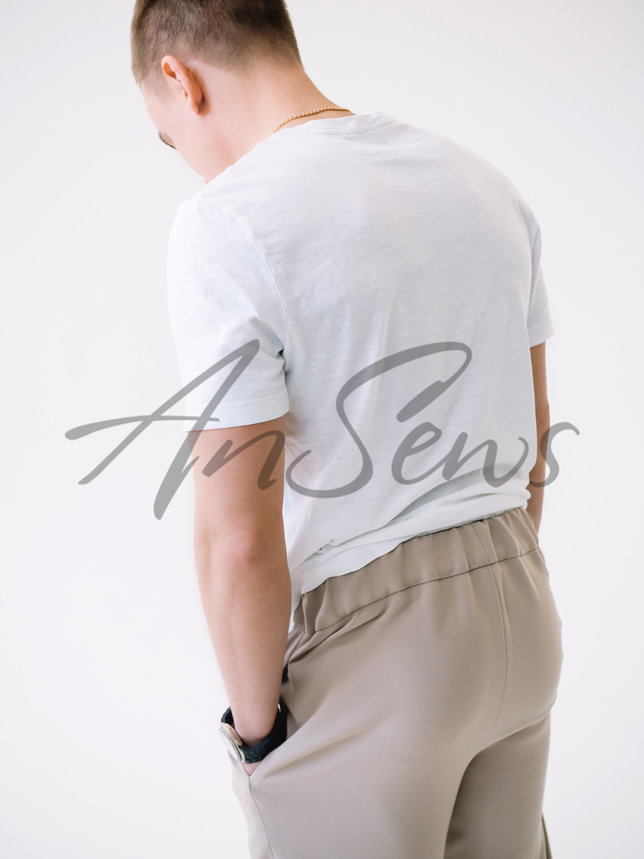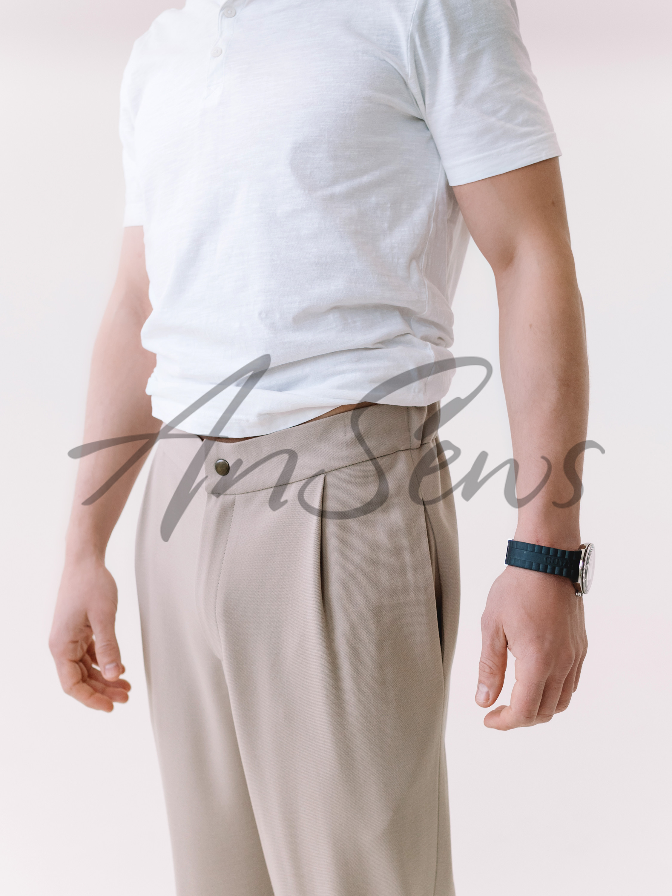 Мужские брюки из костюмной ткани, зауженные к низу. Пояс брюк располагается на естественной линии талии. Пояс притачной, с частичной резинкой сзади. По линии банта расположена застёжка на молнию и кнопка. На передних половинках расположены защипы. Карманы в боковом шве. По низу брюк – цельнокроеные манжеты.