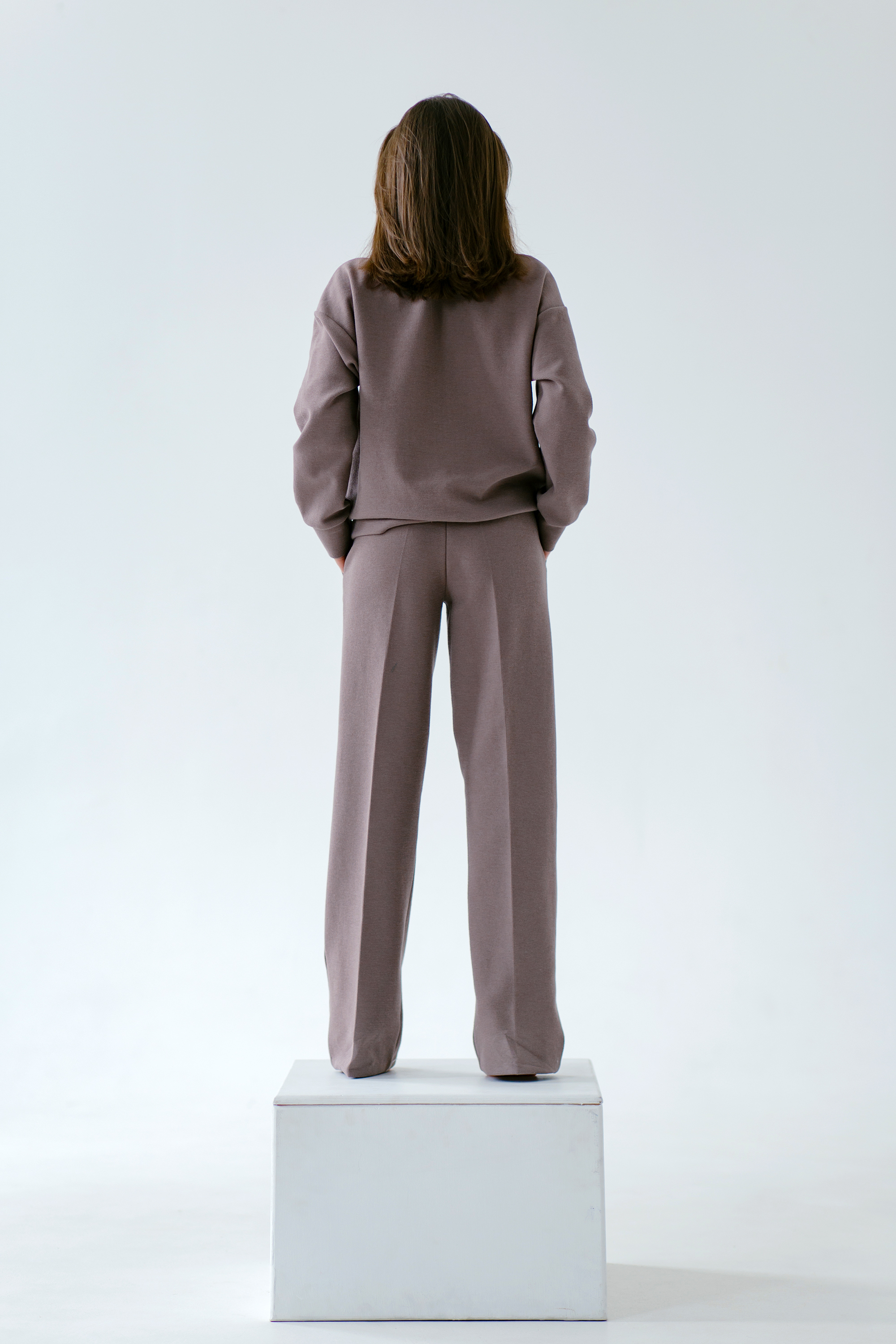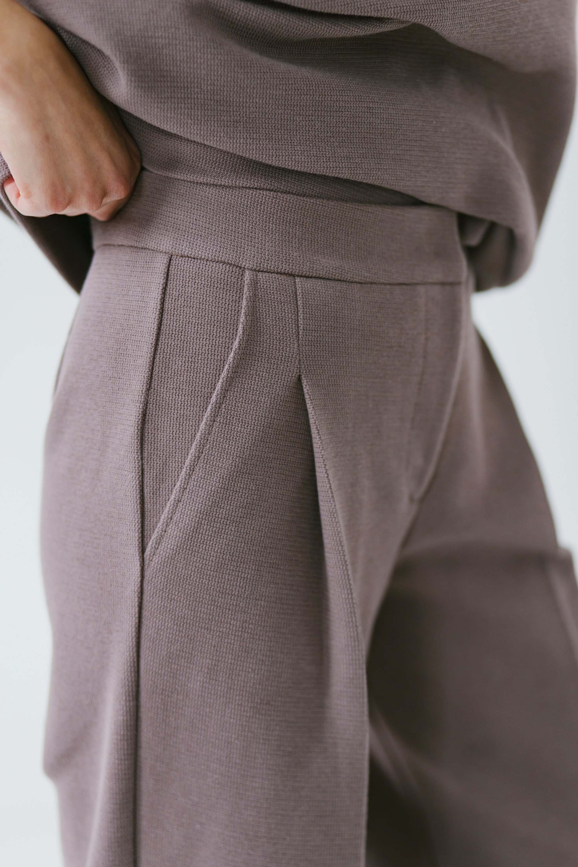 Брюки прямые объёмные из трикотажного полотна. Притачной пояс, на талии. Спереди застёжка молния оформлена гульфиком. На передних половинках брюк застрочные мягкие складки и боковые брючные карманы с бочком. На задних половинках – вытачки.