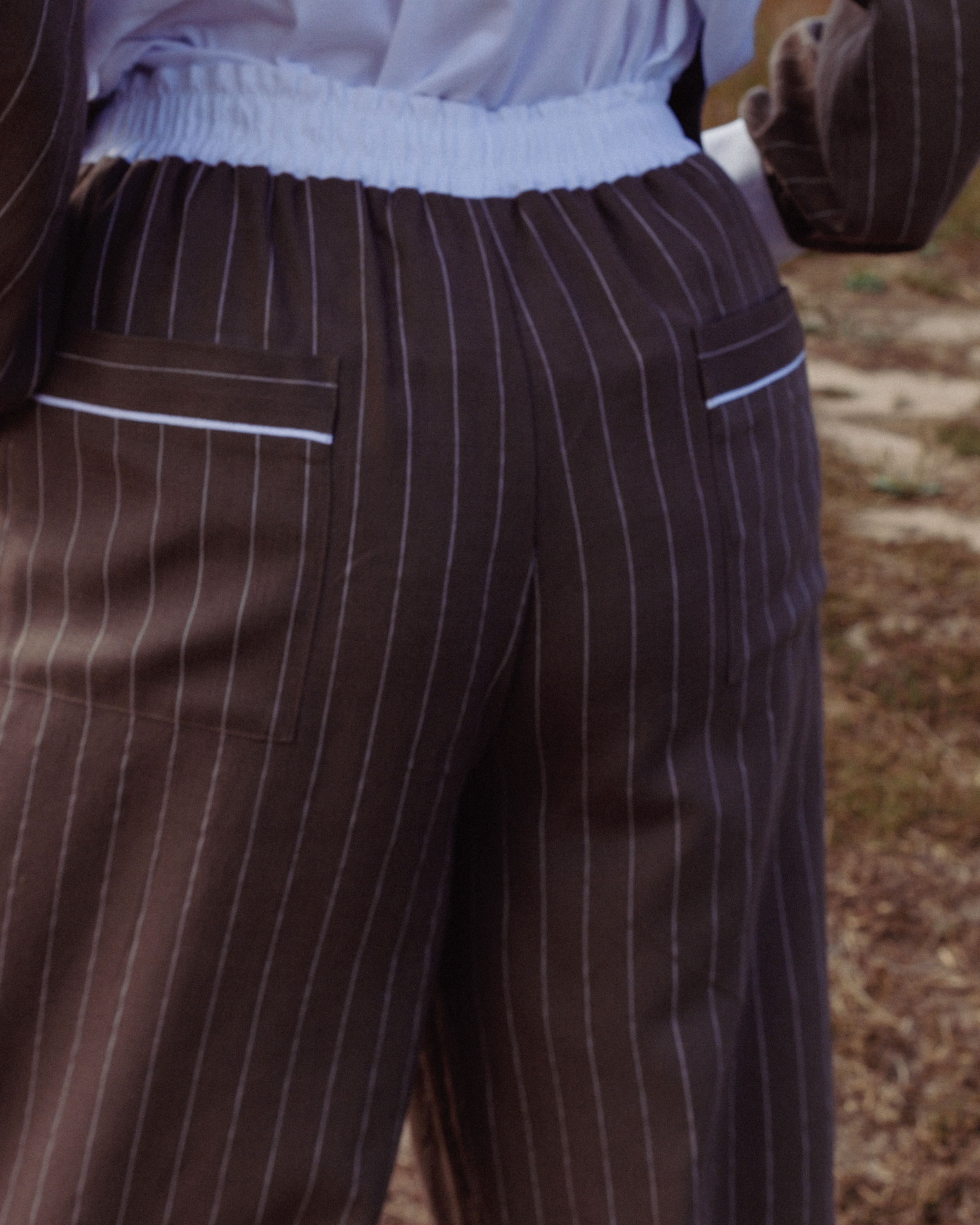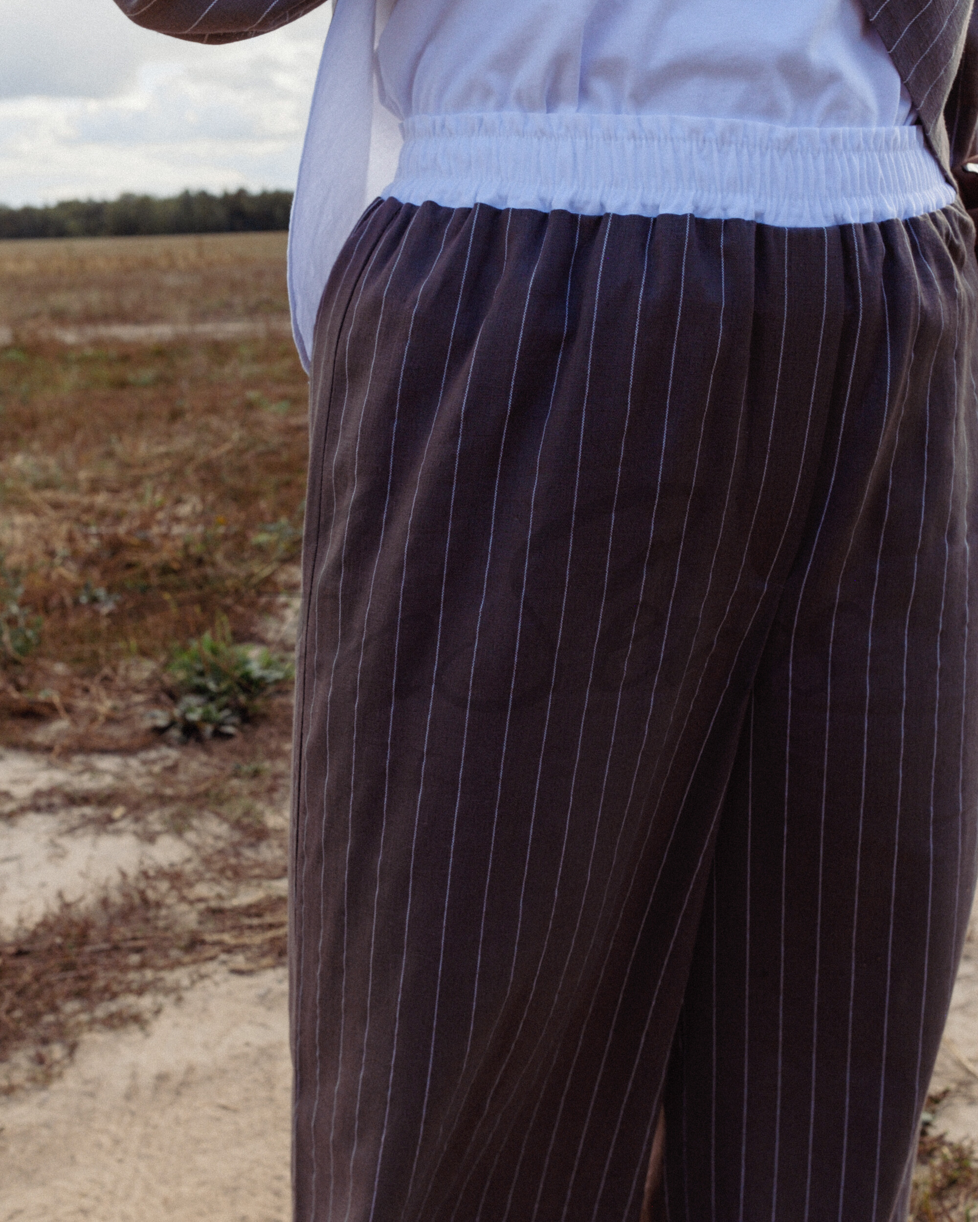 Брюки прямые широкие из полульняной ткани. Пояс притачной на резинке, простроченной двумя строчками. На задних половинках брюк накладные карманы с отделочным кантом. В среднем шве передних половинок имитация гульфика