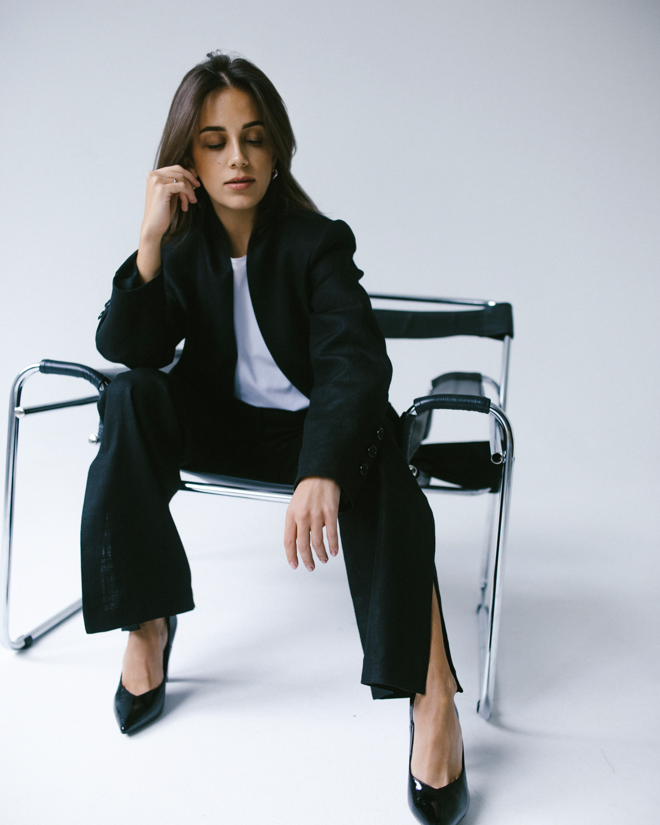 Брюки из костюмной ткани, немного зауженные к линии колена и прямые от линии колена. На передних и задних половинках – талиевые вытачки. Пояс на естественной линии талии, притачной, с застежкой на крючок. Спереди в среднем шве – гульфик с застежкой на молнию. Снизу в боковых швах расположены высокие шлицы.