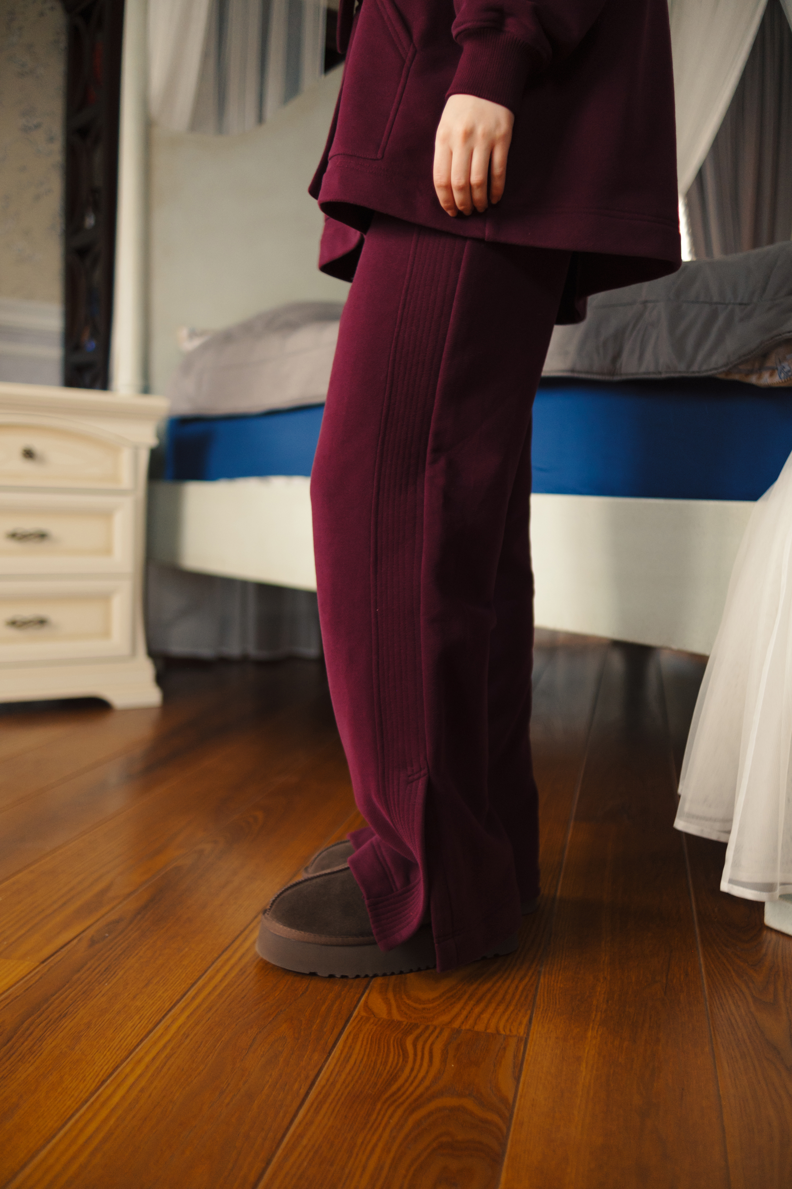 Брюки малого объема прямого силуэта из трикотажного полотна футер. Верх брюк обработан притачным поясом из кашкорсе. По боковым швам настрочные простеганные лампасы из основной ткани. По низу лампасов расположены шлицы.