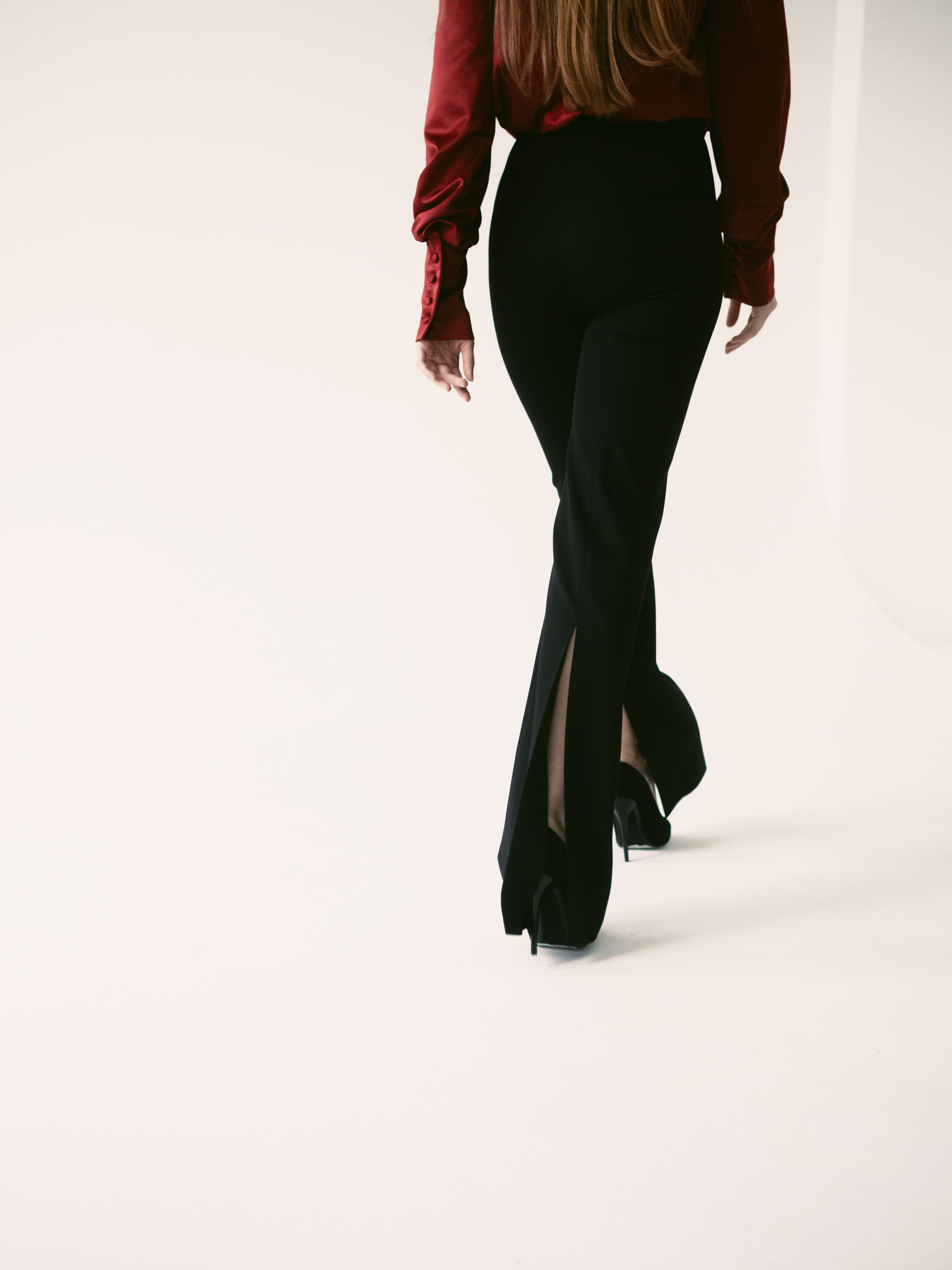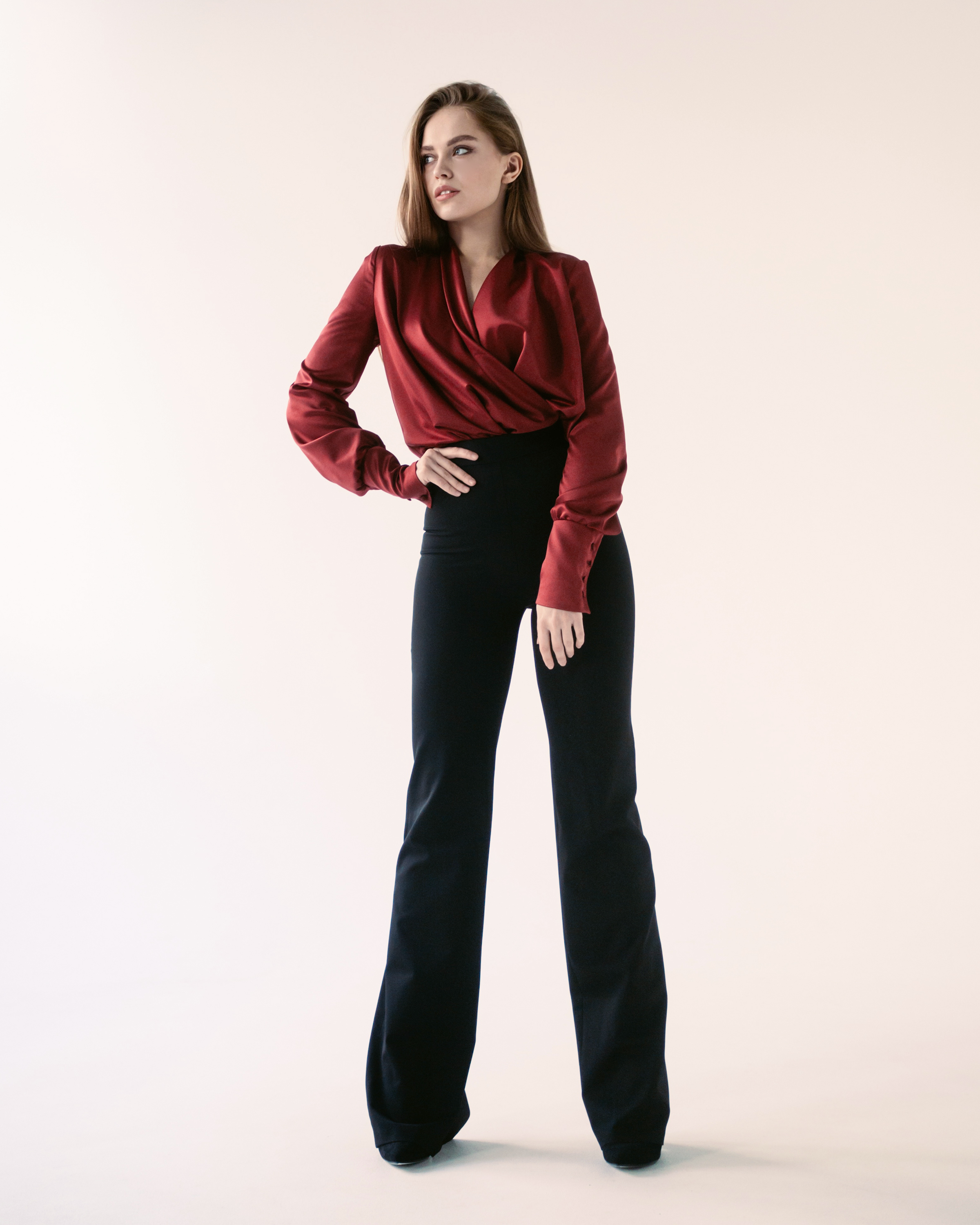 Брюки из костюмной ткани, плотно облегающие фигуру, прямые от линии колена. Пояс брюк притачной. На задних половинках расположены рельефные швы, в нижней которых расположены высокие разрезы. Застегиваются брюки на потайную молнию в левом боковом шве и на внутреннюю пуговицу на поясе.