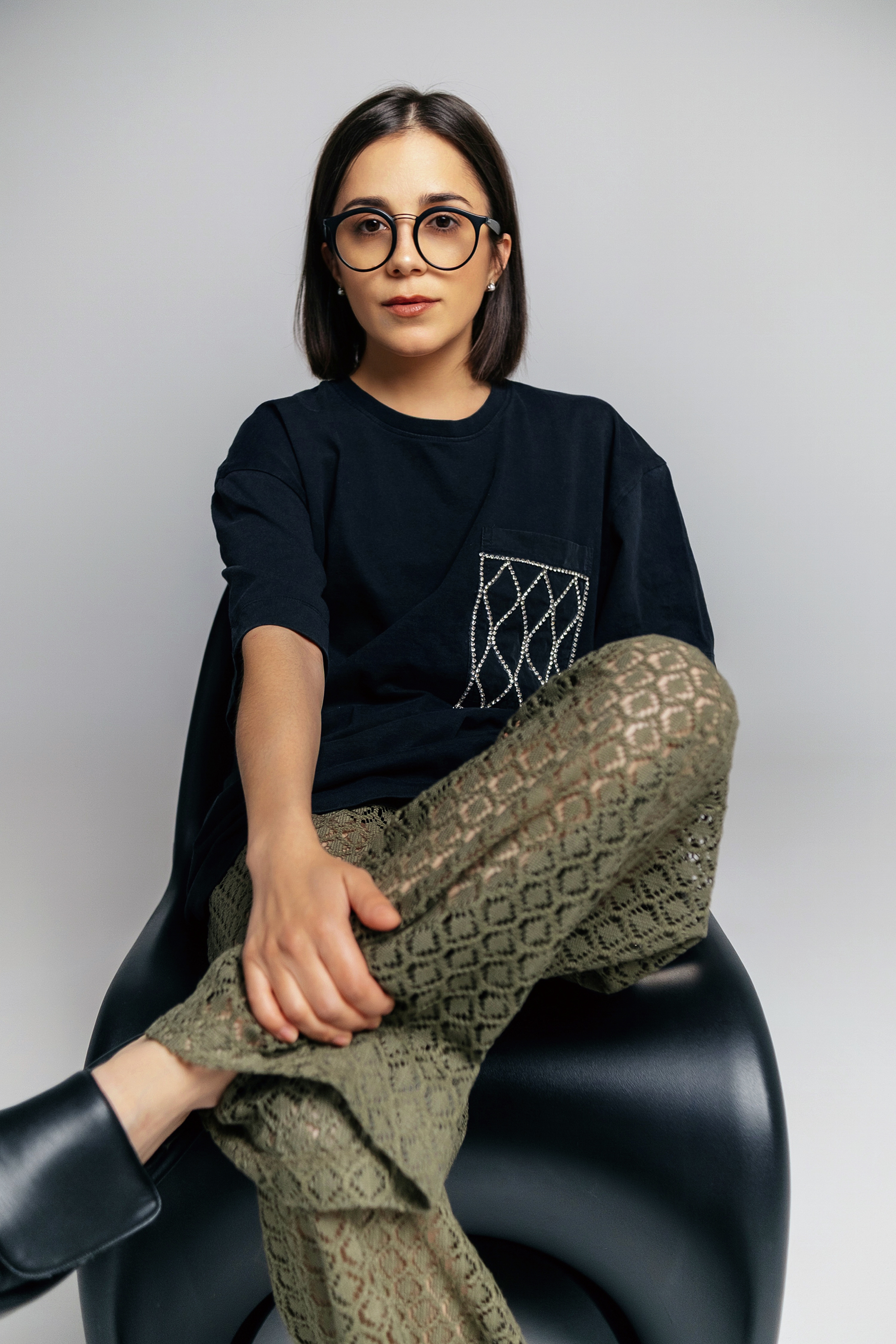 Прямые брюки умеренного объема из ажурного трикотажа. Верхний срез оформлен узкой подгибкой, в которую вставлена узкая эластичная тесьма (резинка). Низ брюк обработан подгибкой.