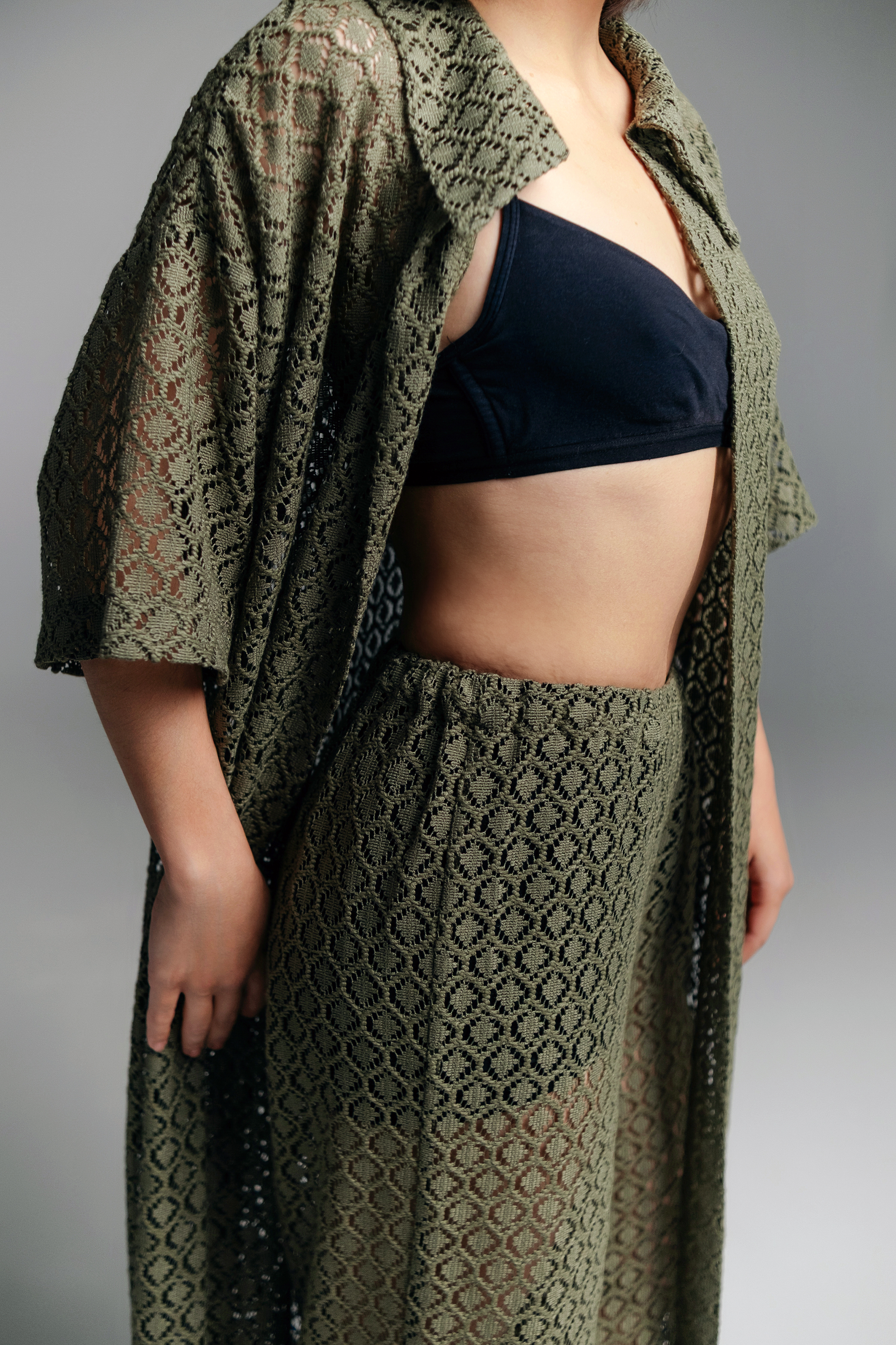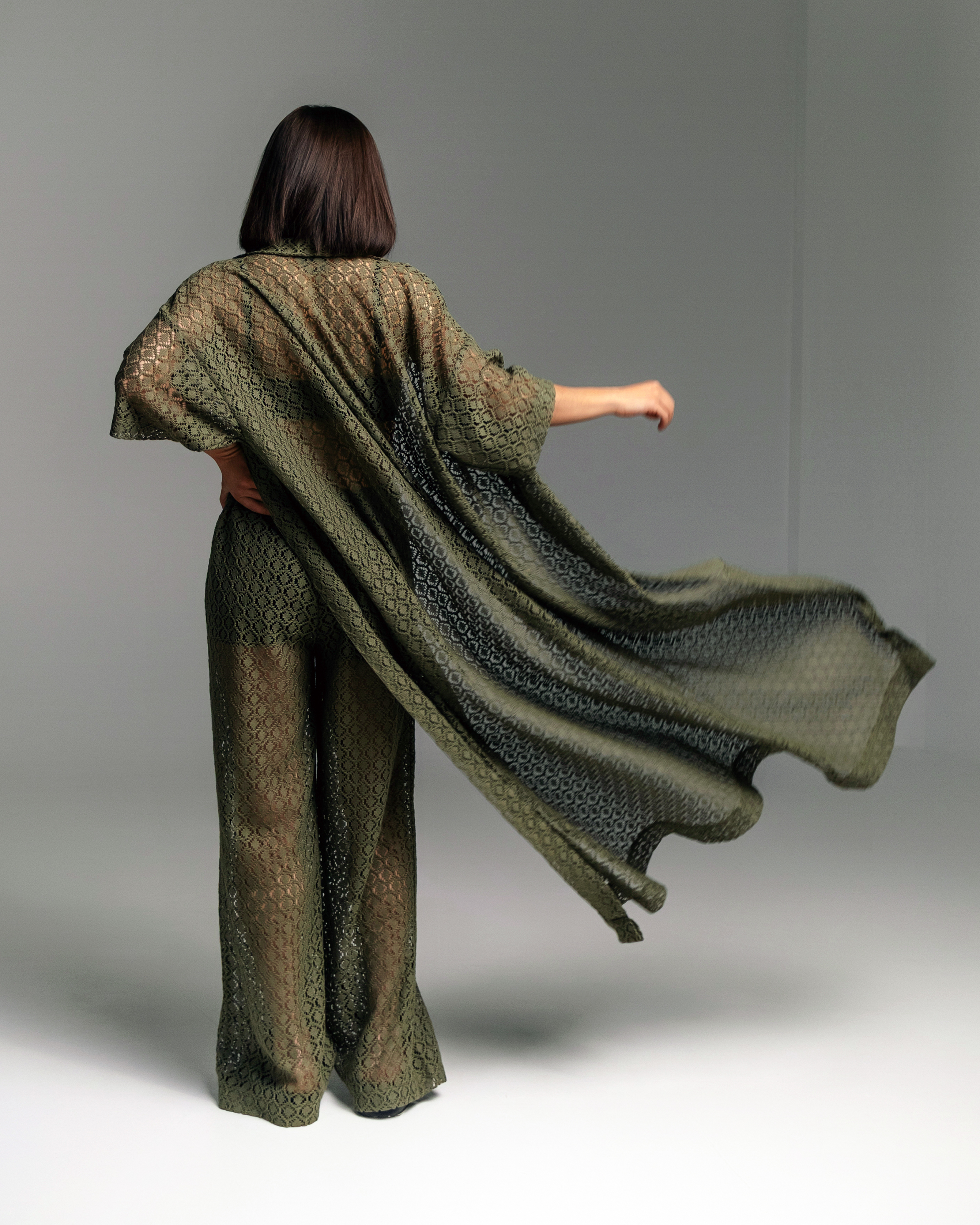 - Изделие на фото сшито из ажурного трикотажа, состав 60 % полиэстер, 40% хлопок, ширина 150 см. Плотность 170 гр/м2.