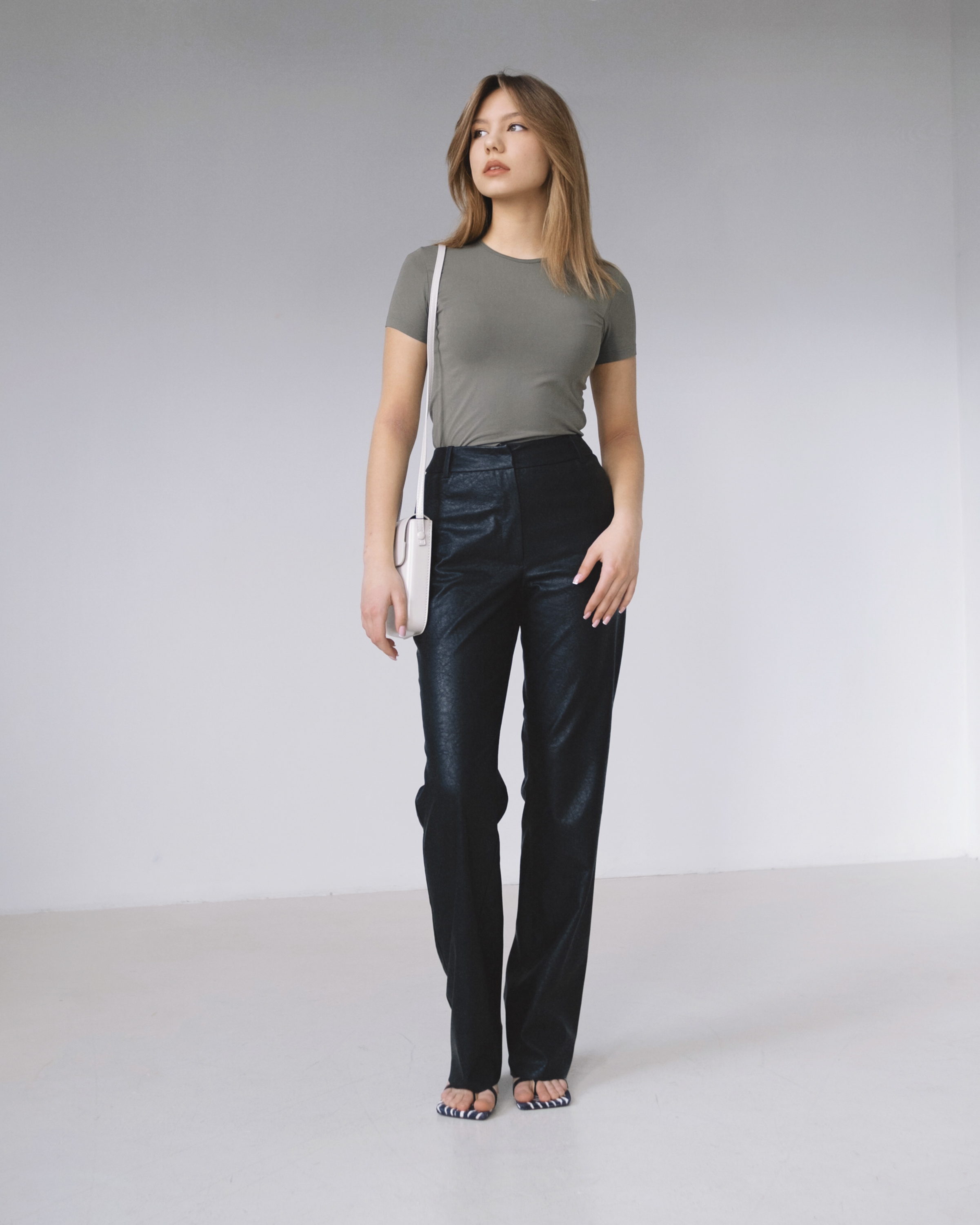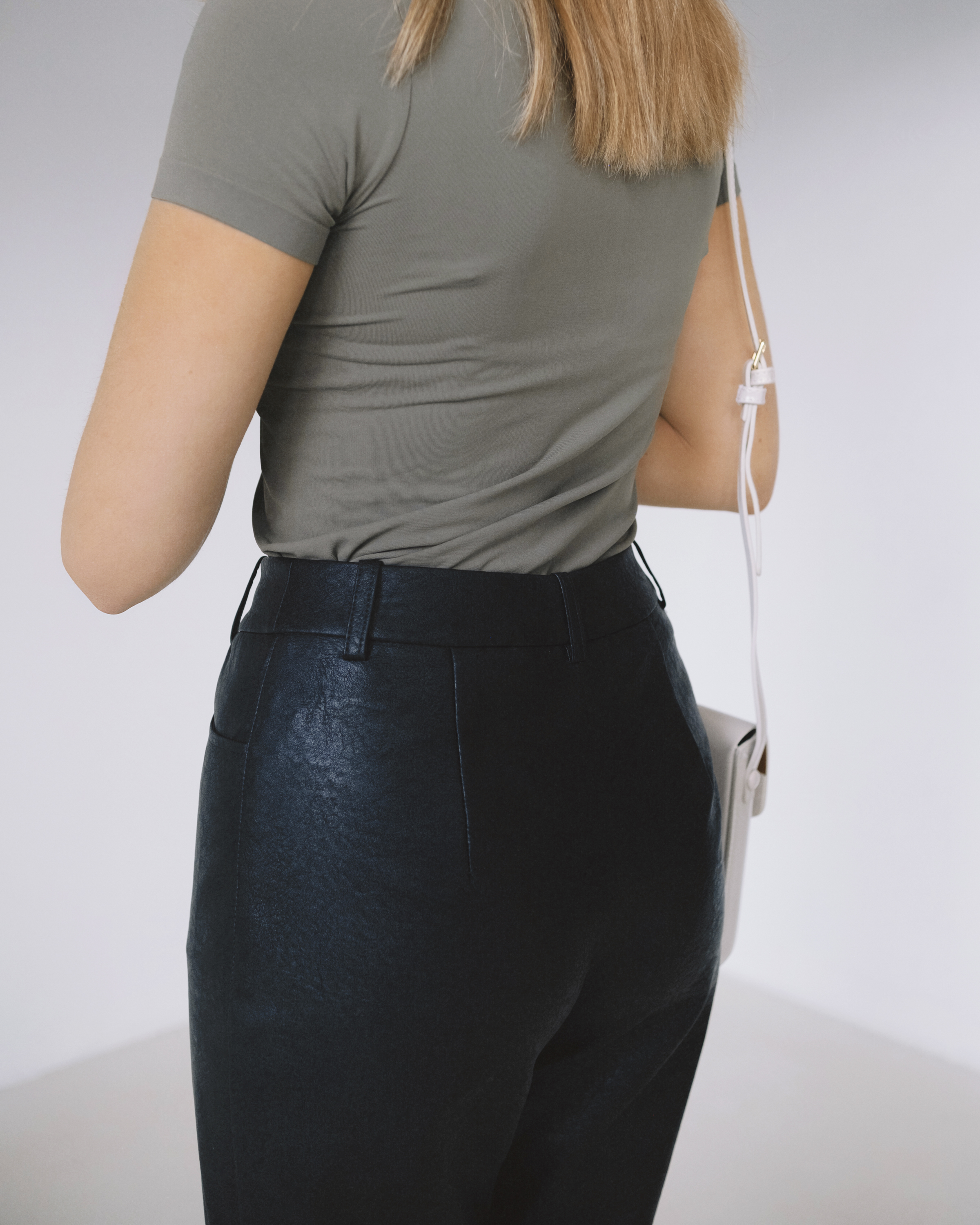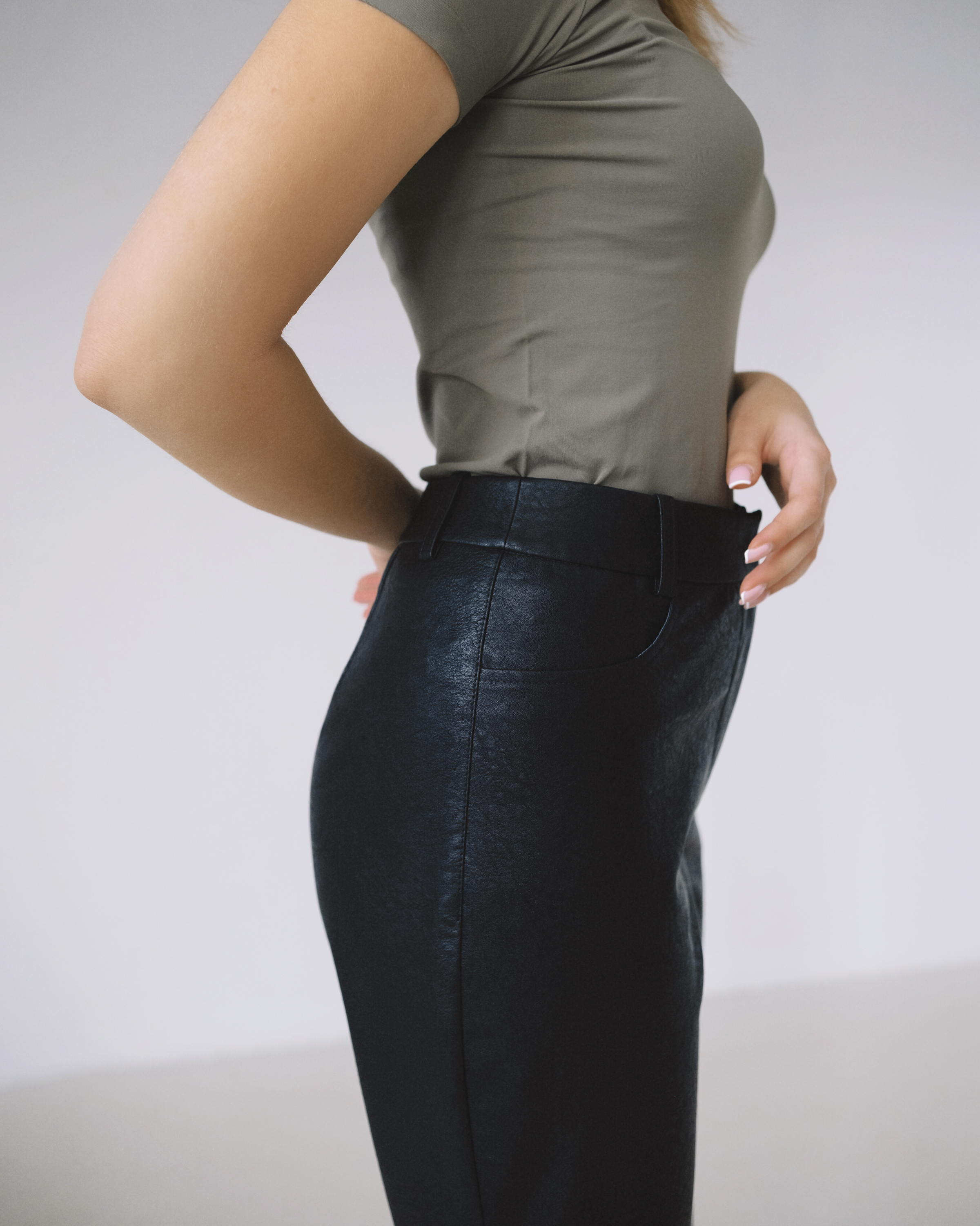 Брюки из искусственной кожи прилегающего силуэта, зауженные к линии колена. Линия талии немного занижена. Верх брюк обработан притачными кокетками. На задних половинках вытачки. Застёжка на крючок и молнию под гульфиком, пять шлёвок под ремень. Классические боковые карманы с подкройным бочком.