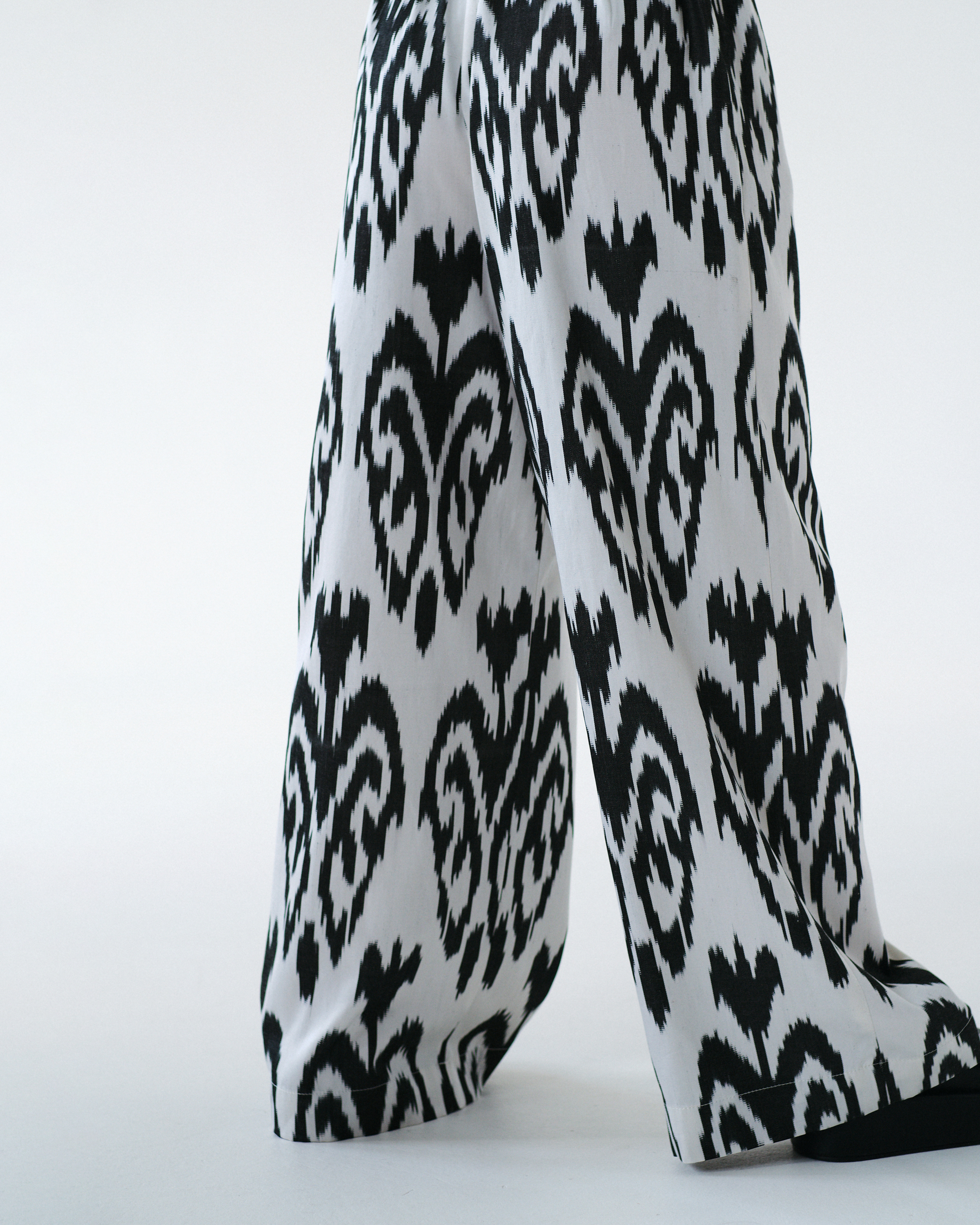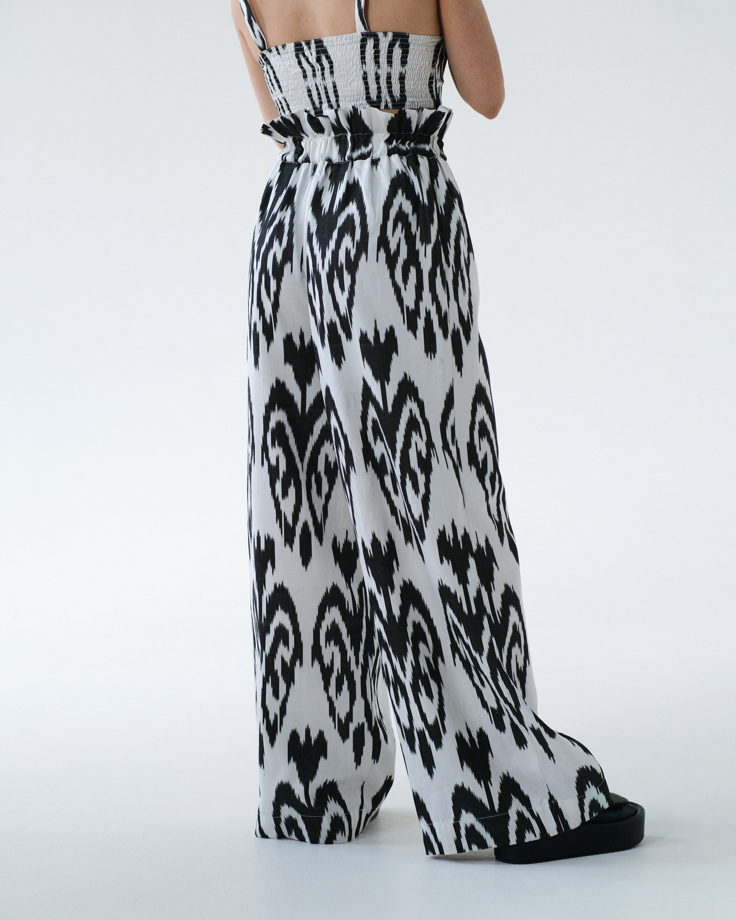 Брюки прямые свободного силуэта из шёлковой этнической ткани икат. Отрезной широкий пояс на талии собран резинкой. Верхний край пояса образует рюш.