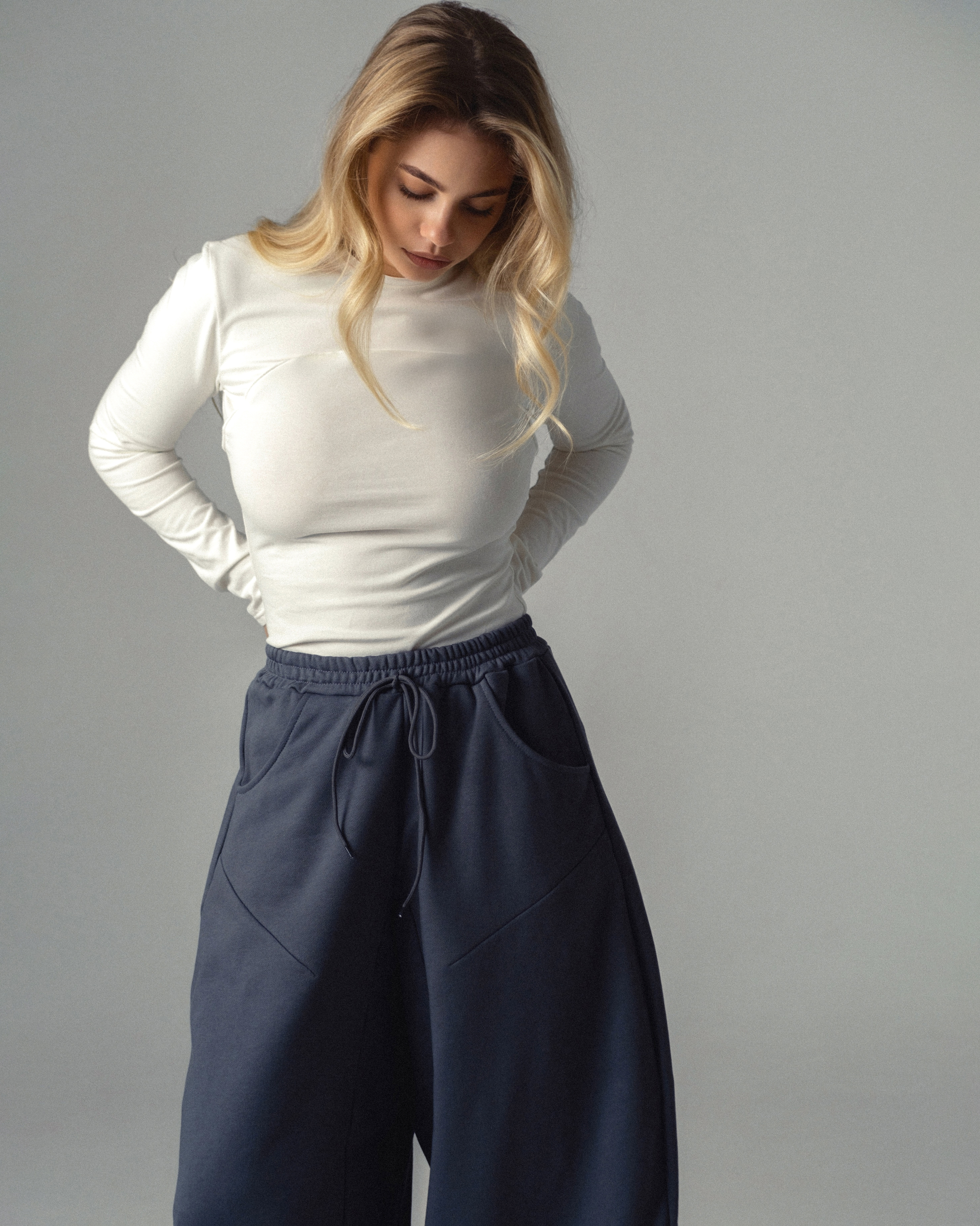 Брюки женские большого объёма из трикотажного полотна. Брюки расширены по уровню колена и сужаются к низу. На передних половинках брюк карманы с отрезной боковой частью. Пояс притачной, прямой. Внутри пояса вставлена эластичная лента. Притачной шнурок на поясе. На передних половинках брюк вытачки на уровне бедра. На передних половинках шаговая вставка по всей длине брючины. На передней и задней половинках по боковому шву ниже колена расположены фигурные вставки. На задней правой половинке накладной карман. В подгибку по низу брюк продернута резинка с фиксатором.