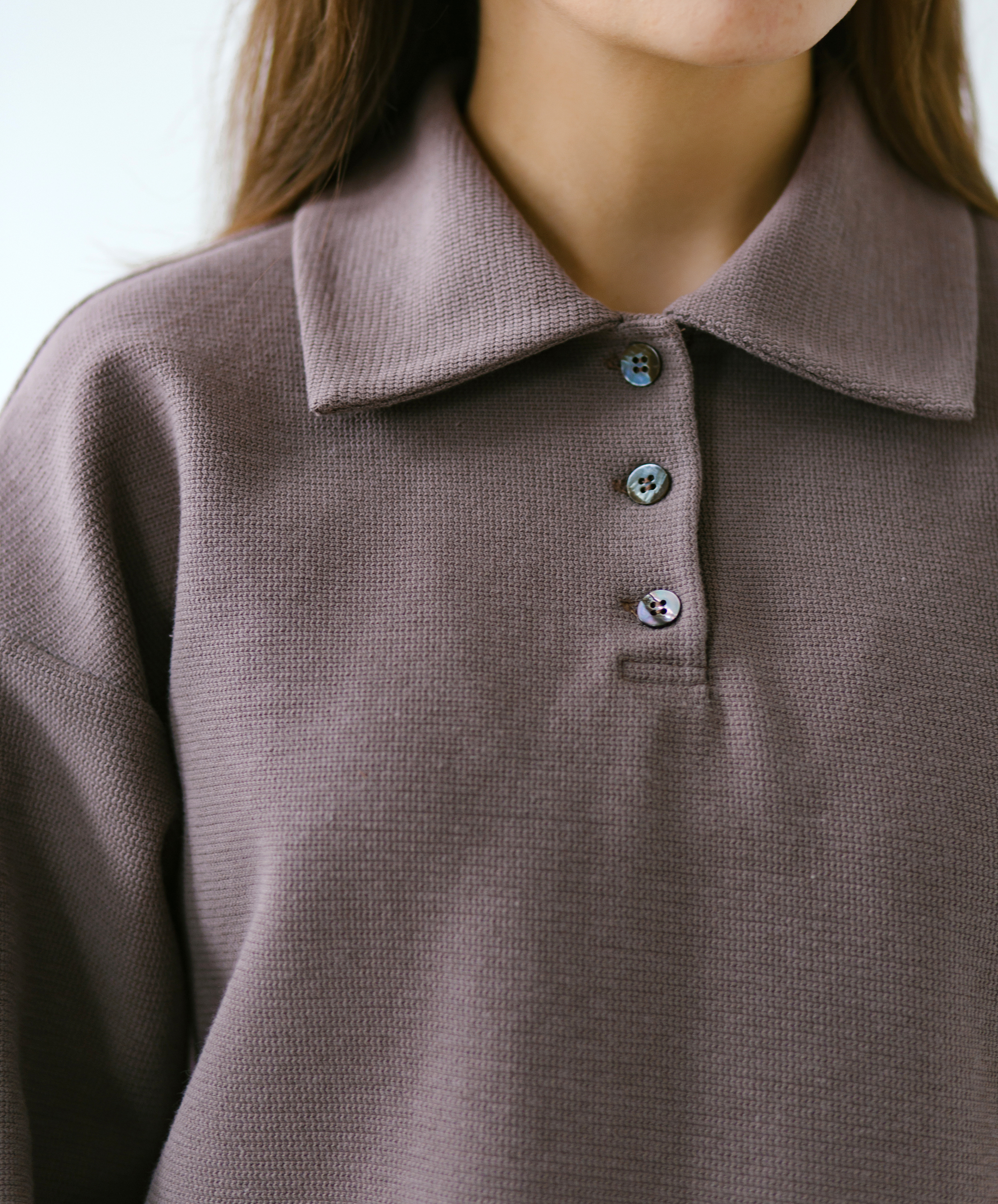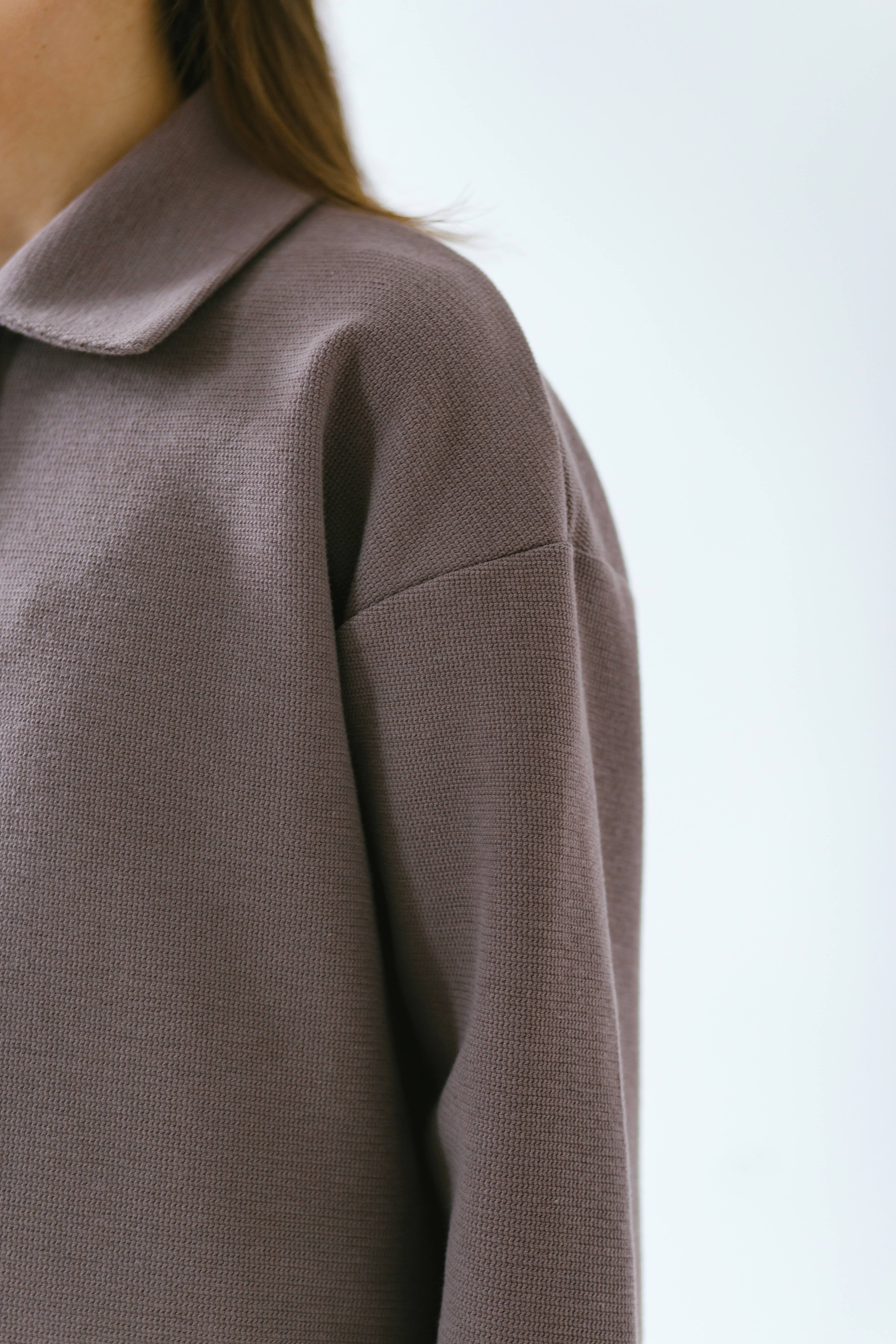 Джемпер из трикотажного полотна прямого силуэта, спущенная линия плеча, рубашечный одношовный рукав. Застёжка «поло» спереди на три пуговицы. Воротник стояче-отложной. Рукава и низ джемпера обработаны притачными манжетами.