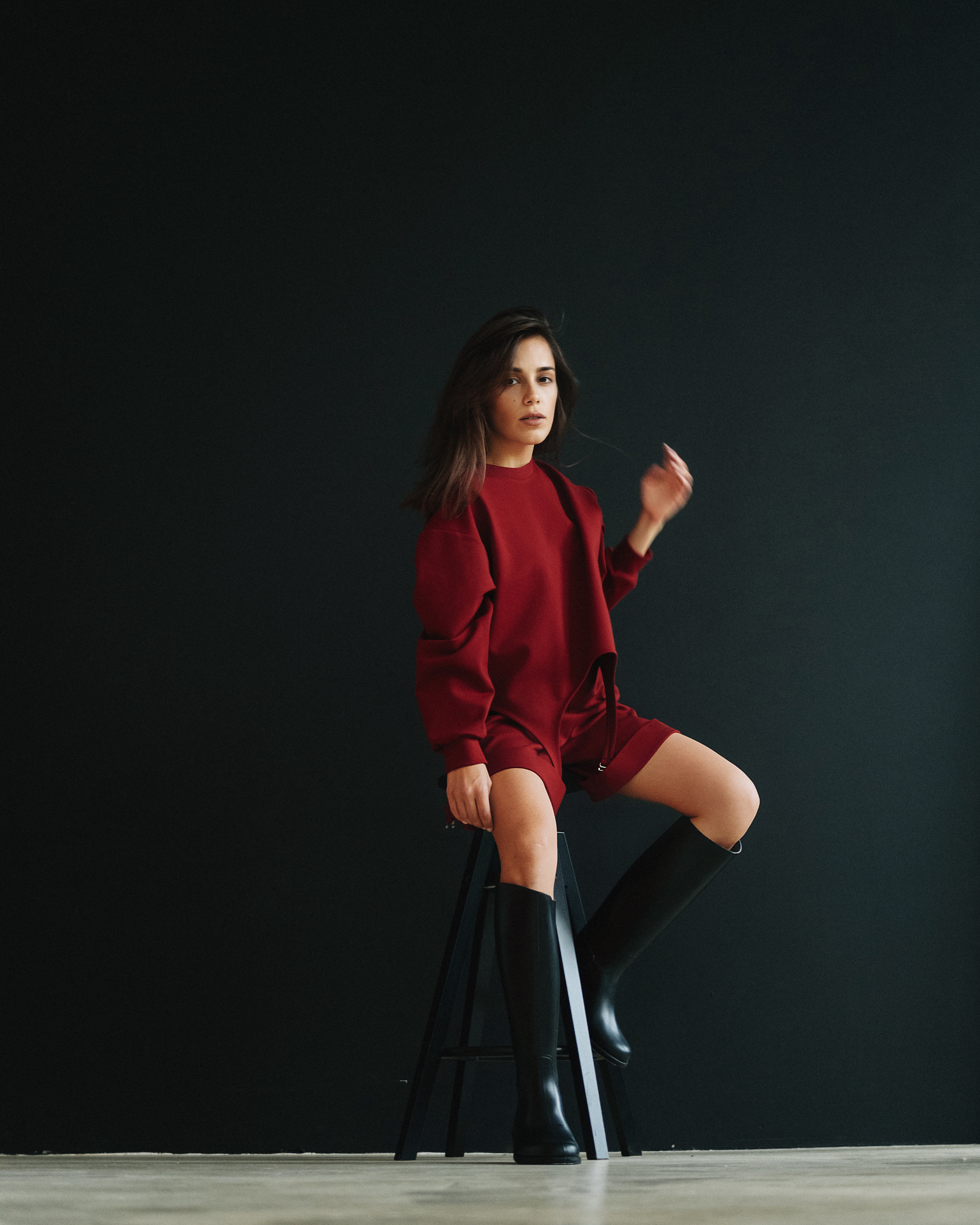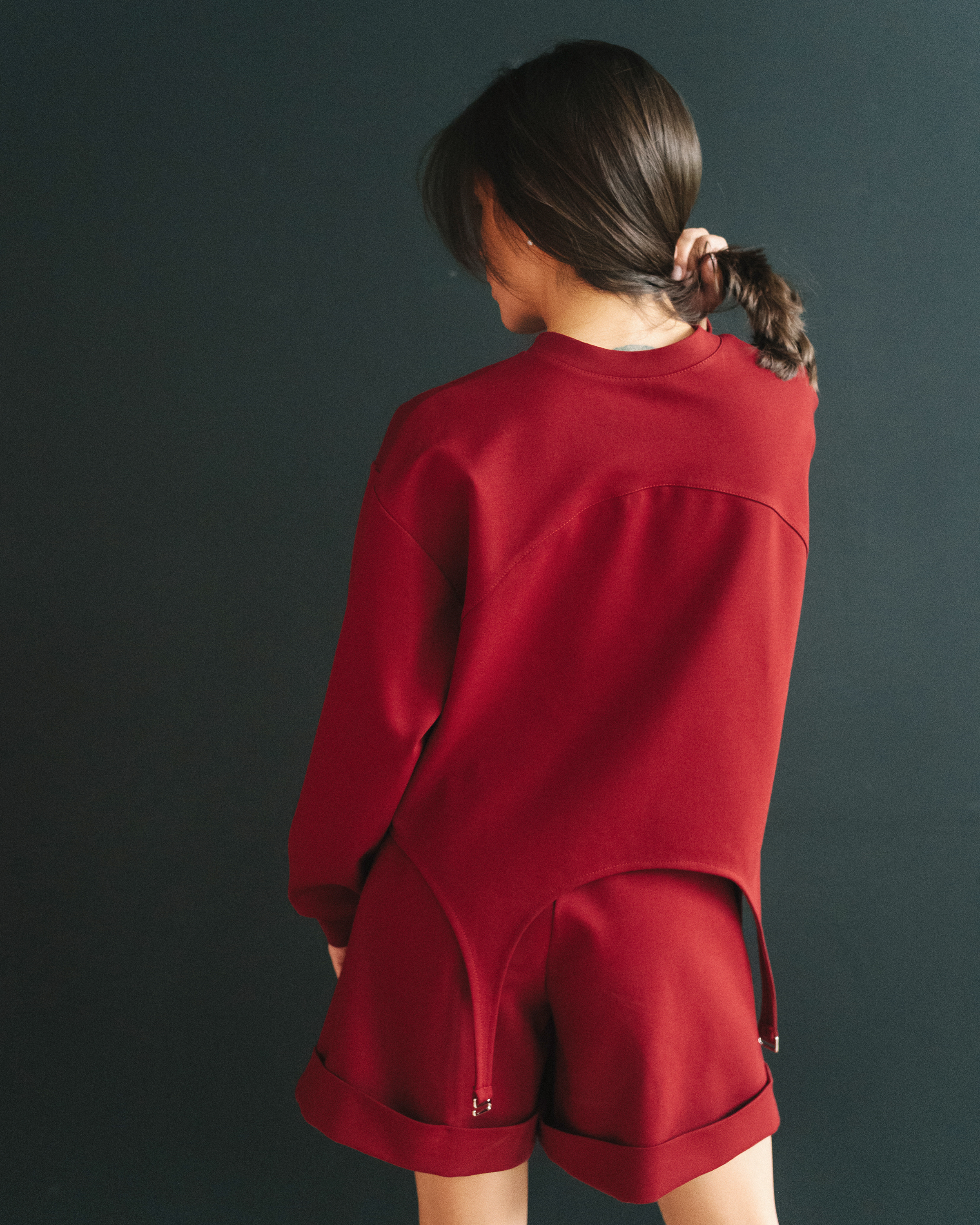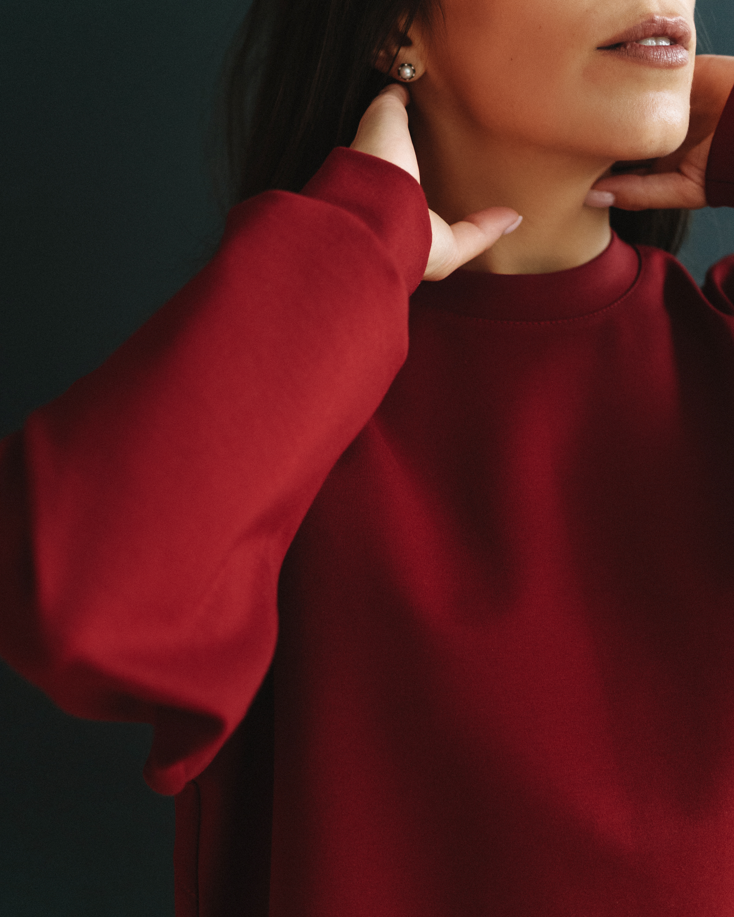 Джемпер прямого силуэта с подвязками из джерси. Плечо