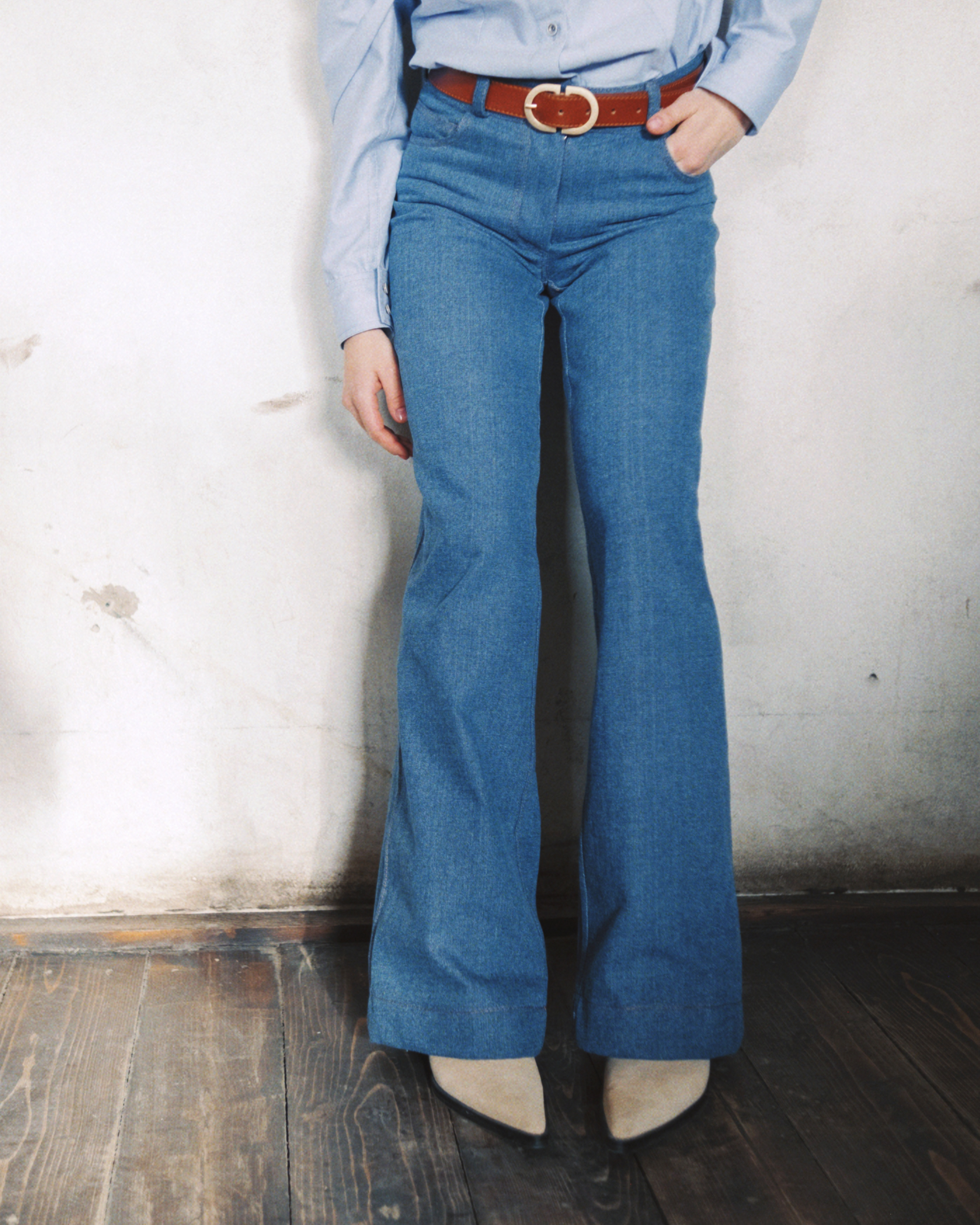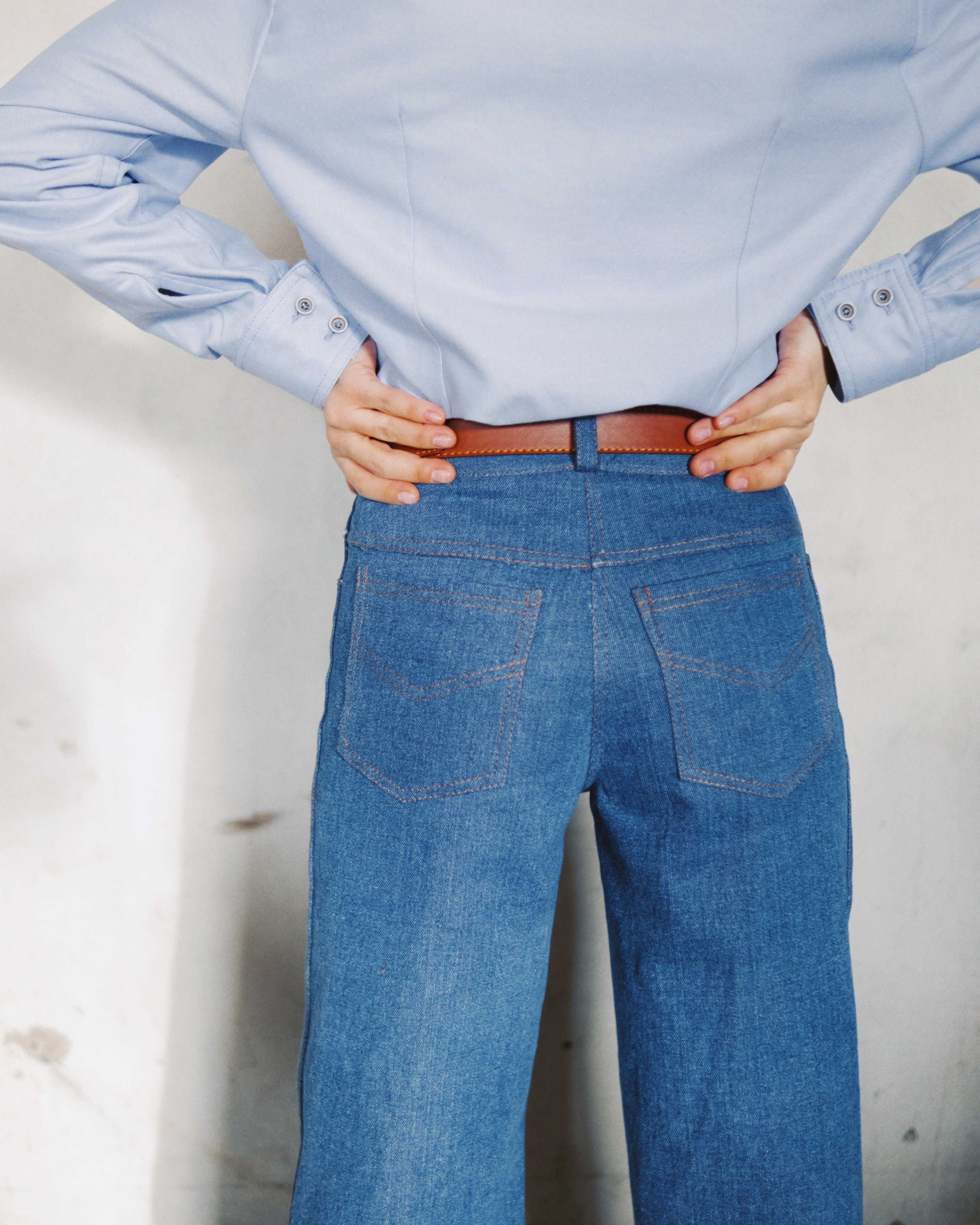 Брюки из джинсовой ткани прямые от линии колен. Линия талии немного занижена. Пояс притачной, застёгивается на металлическую пуговицу, на поясе пять шлёвок под ремень. Застёжка-молния в среднем шве переда обработана гульфиком с двойными отделочными строчками. Классические боковые карманы с подкройным бочком по краю отстрочены двойной отделочной строчкой. С правой стороны на бочок кармана настрочен «монетный карман». Сзади на брюках отрезная кокетка и накладные карманы с фигурной двойной отделочной строчкой. Широкая подгибка низа с отстрочкой.