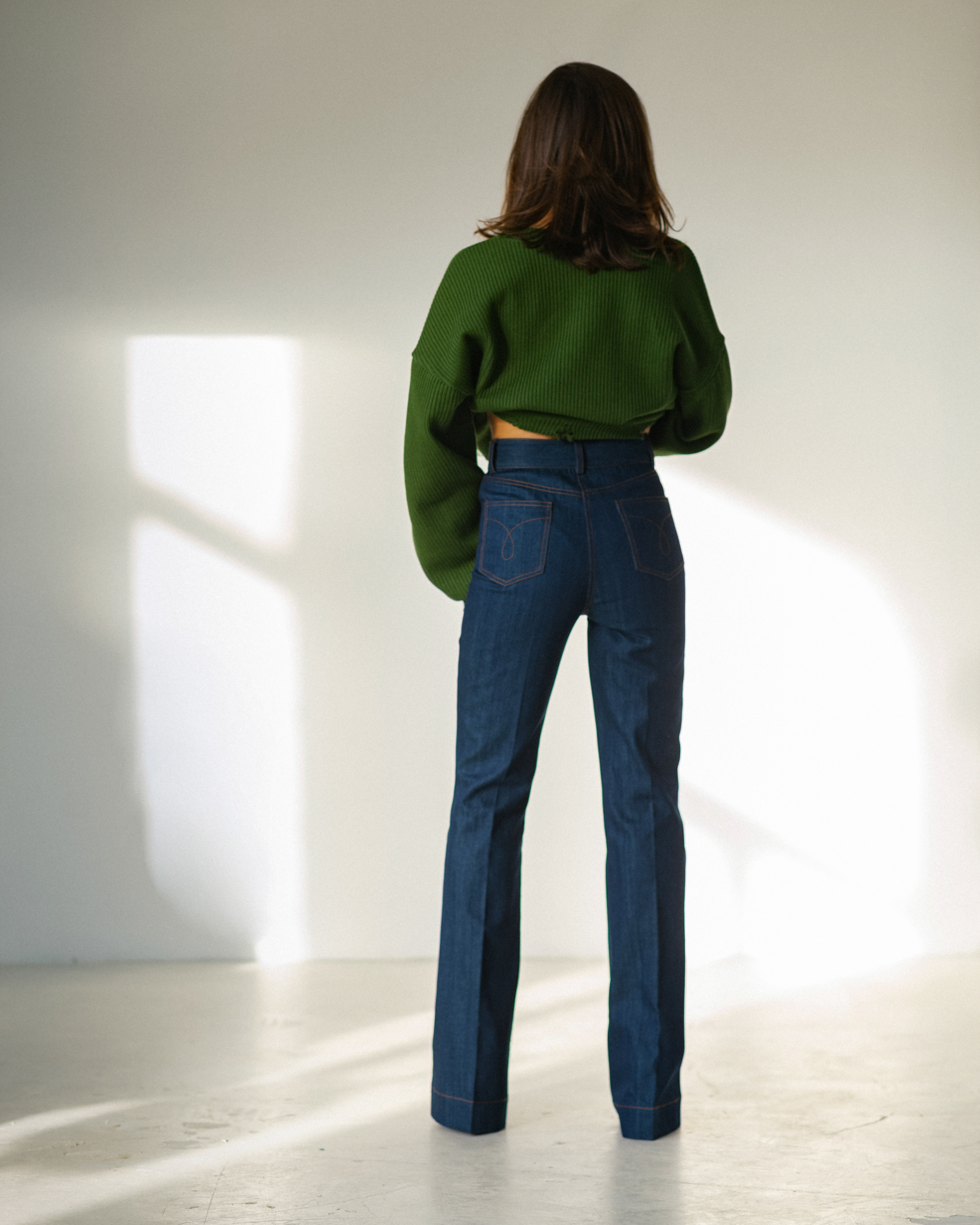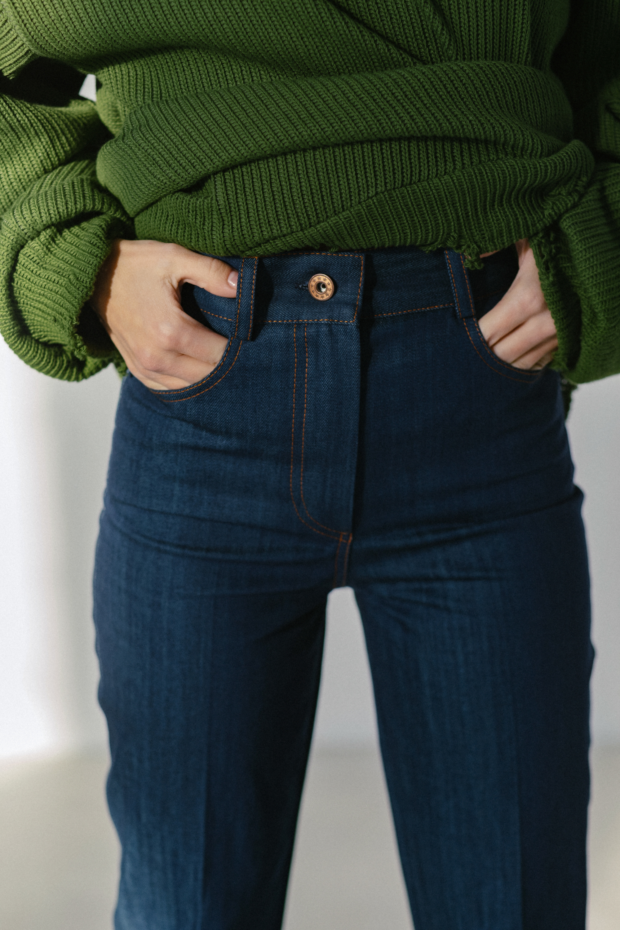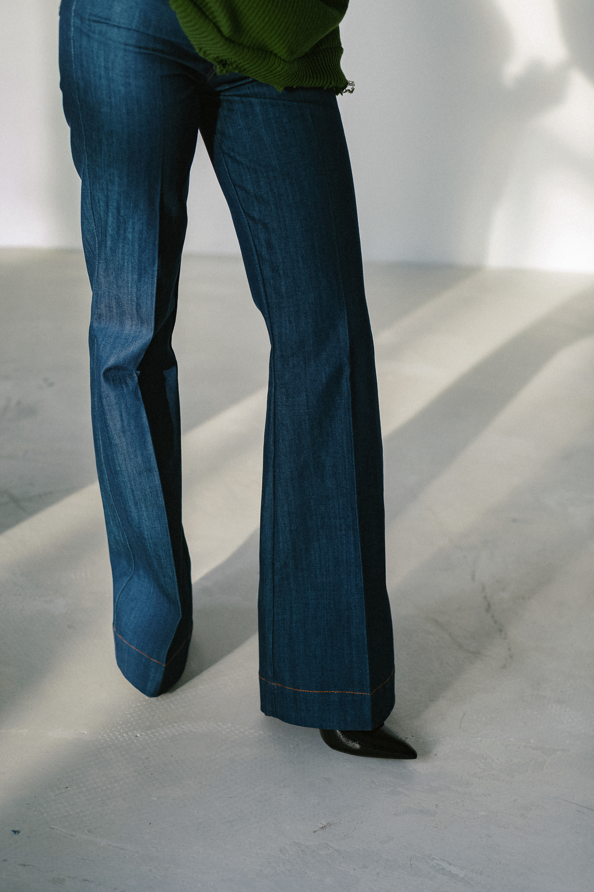 Брюки из джинсовой ткани, плотного облегания по бедрам, расклешенные от линии колена. Пояс брюк располагается на естественной линии талии. Пояс притачной, со шлевками. Классические карманы с подкройным бочком, застежка на молнию. Сзади брюки имеют отрезную кокетку и накладные карманы. Брюки отстрочены по линиям карманов и гульфику. Широкая подгибка низа.