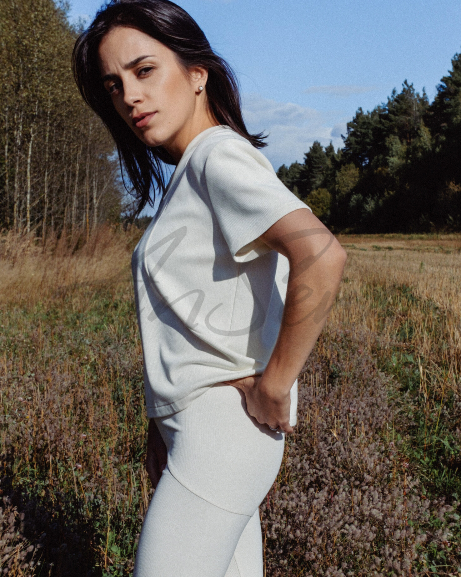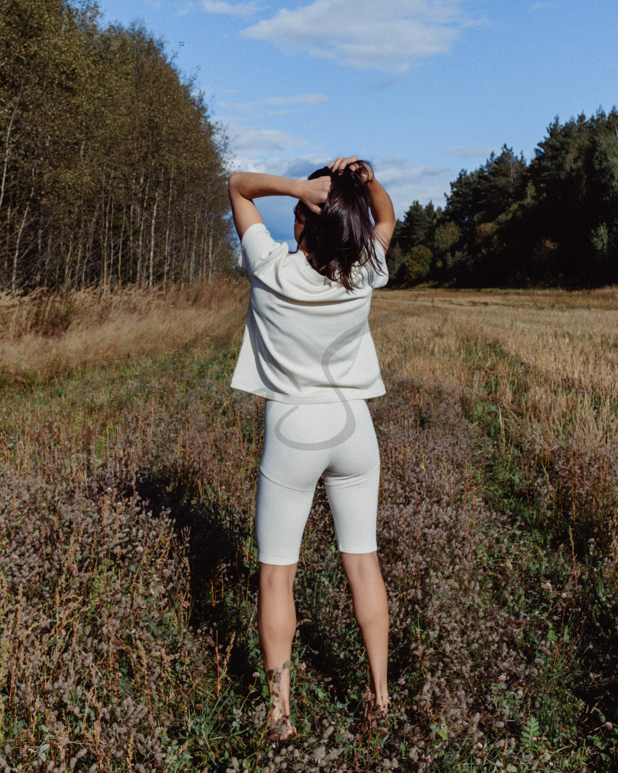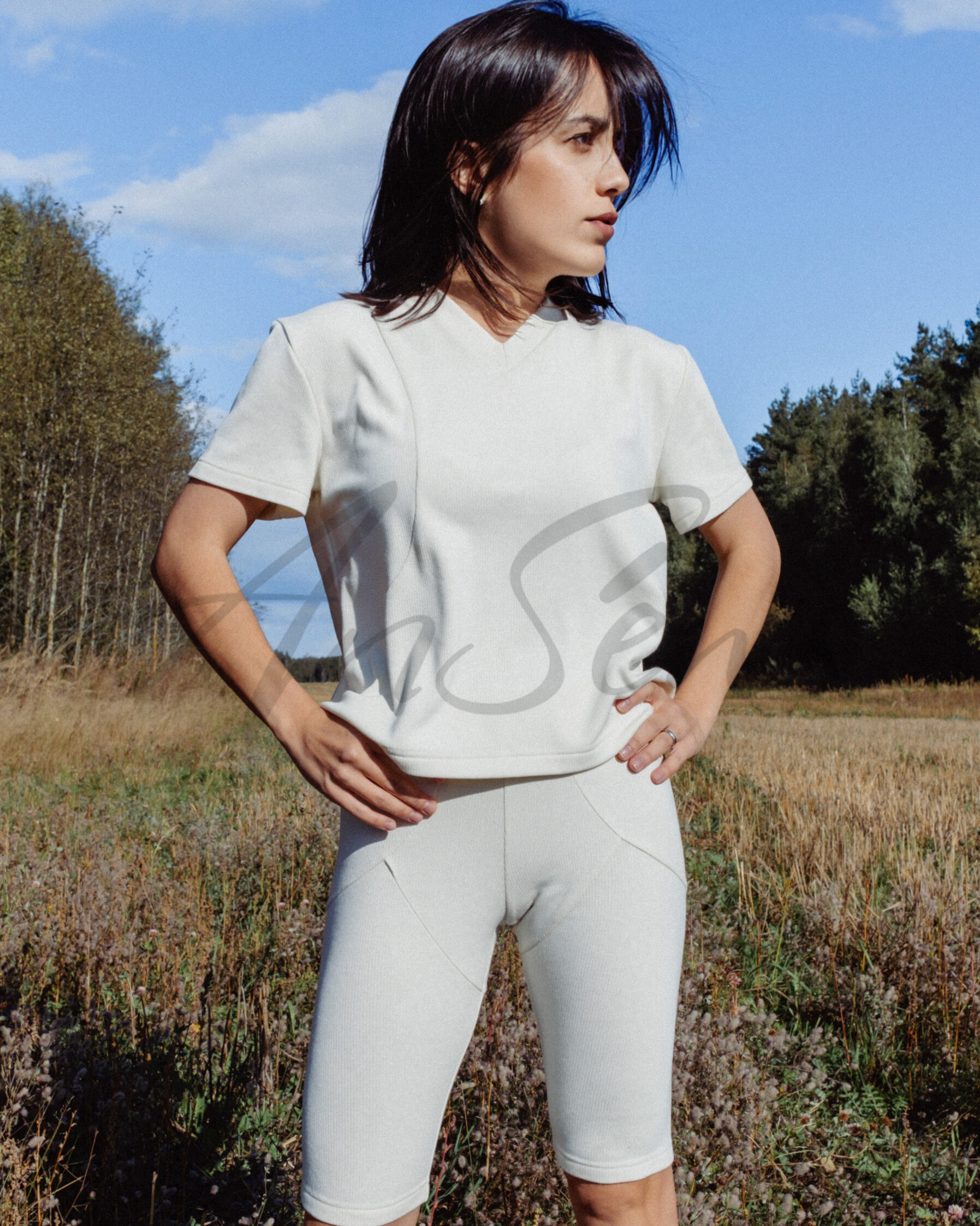 Футболка свободной формы длиной ниже талии из трикотажного полотна. Линия плеча немного спущенна. Рукав рубашечный короткий. Перед с рельефами, которые выходят из плечевого шва, проходят через выступающие точки груди и заканчиваются в боковых швах чуть ниже уровня талии. Горловина V-образной формы обработана обтачкой.
