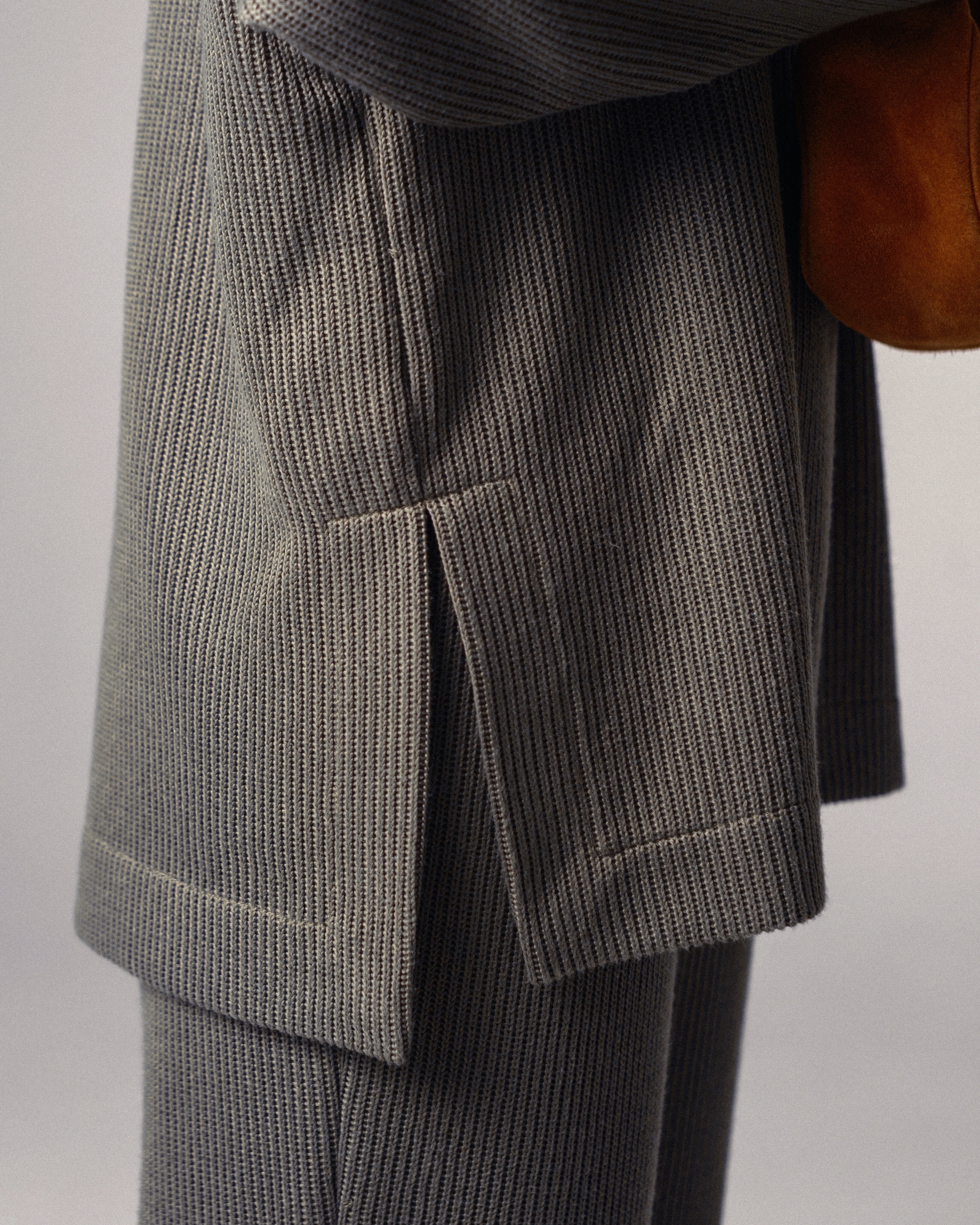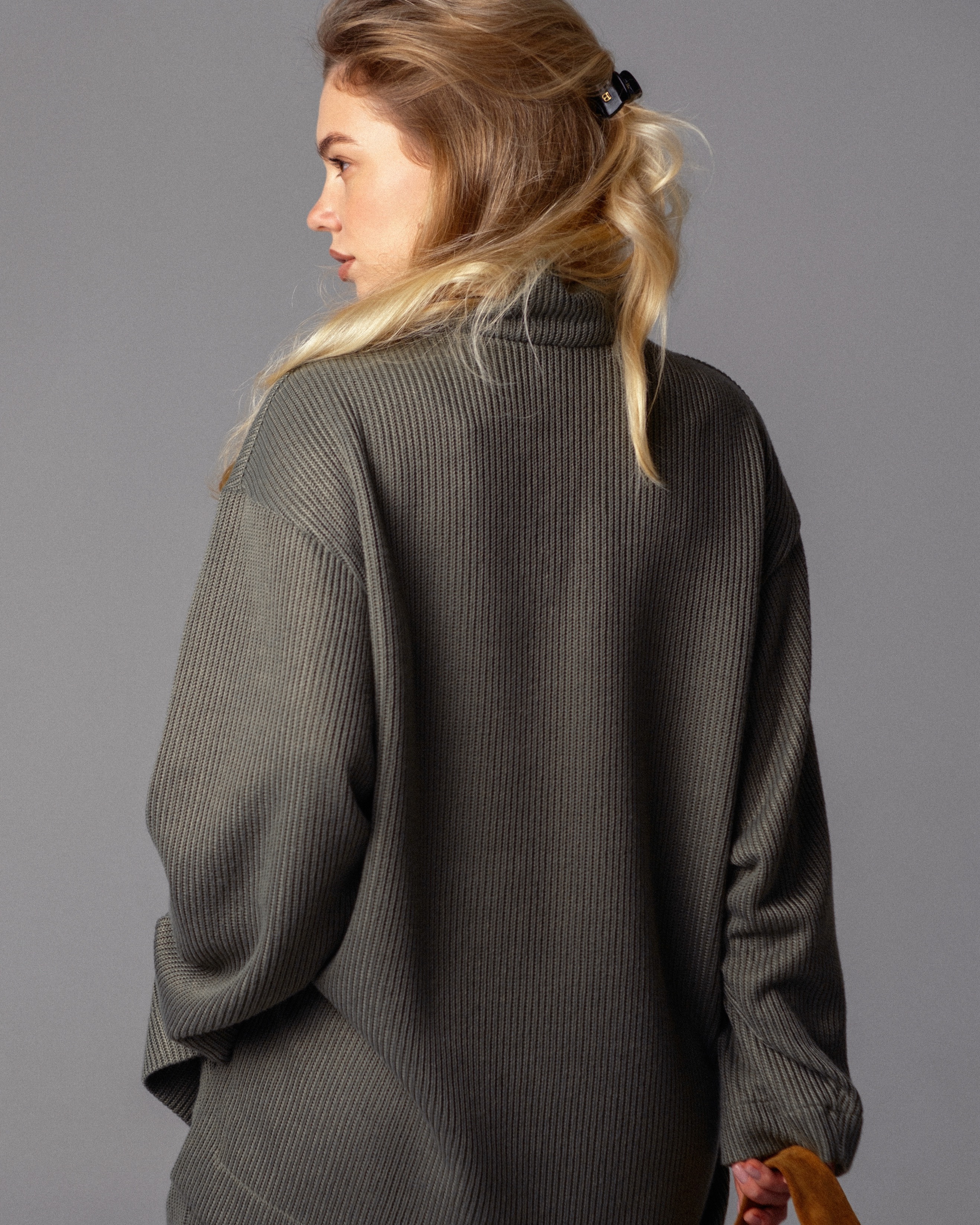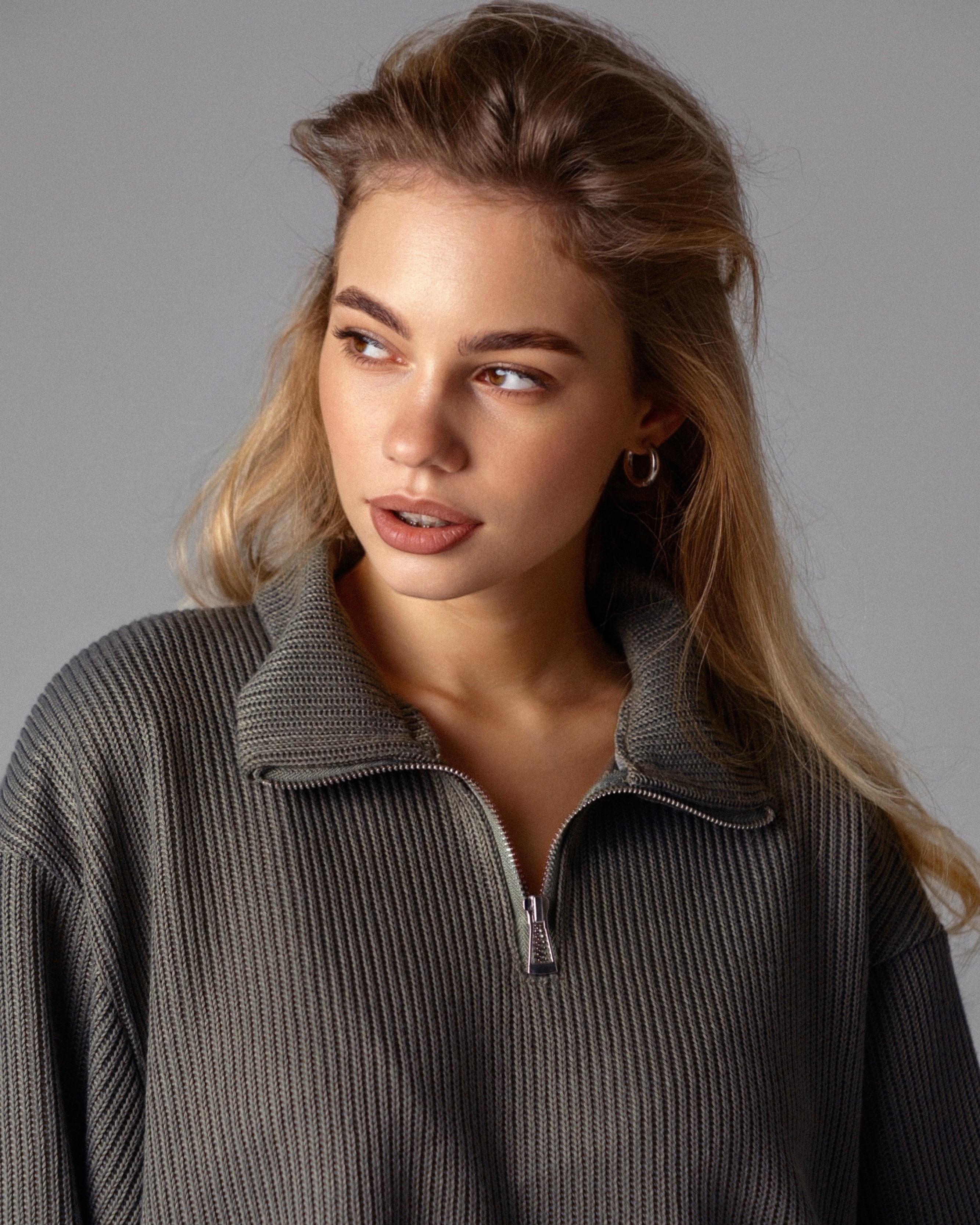 Худи из трикотажного полотна свободного объема прямого силуэта. Воротник-стойка, притачной, с молнией, переходящей на деталь переда. Линия проймы спущена, рукав рубашечный. В боковых швах расположены разрезы.