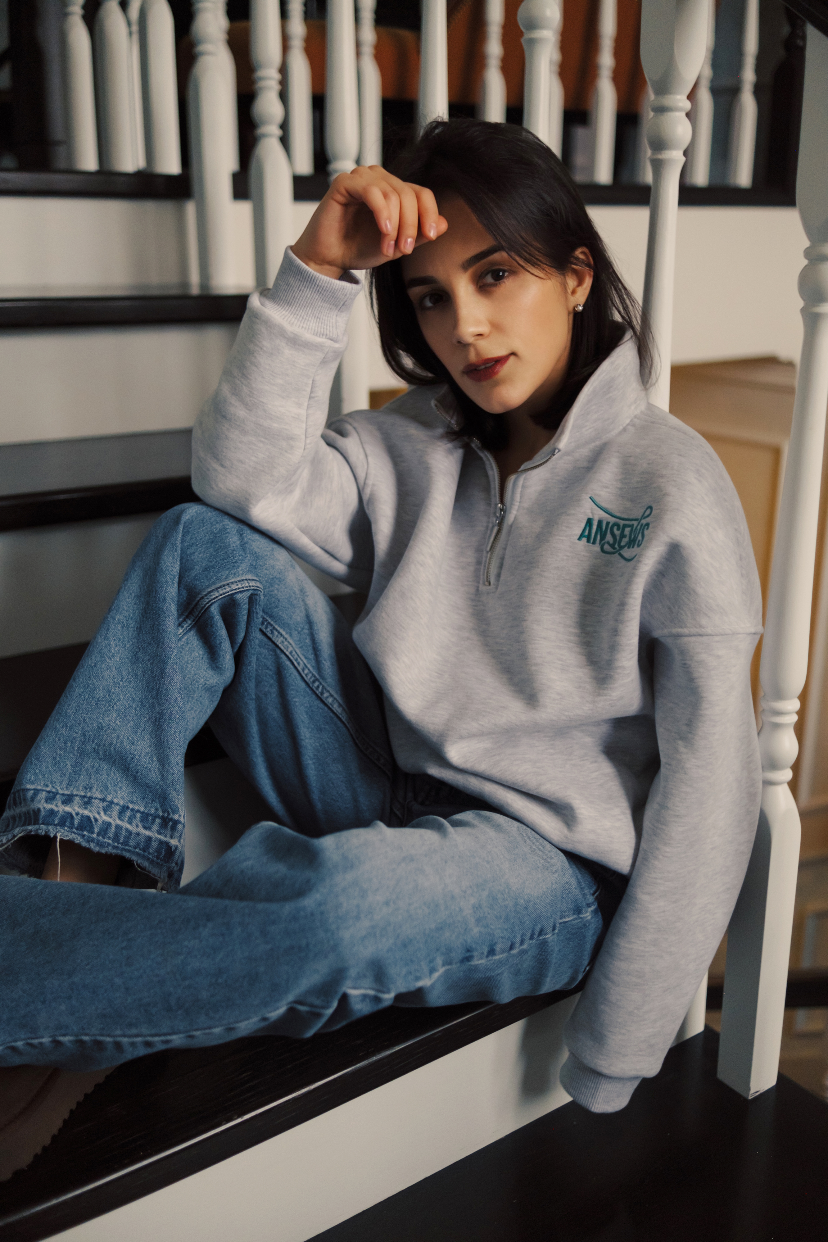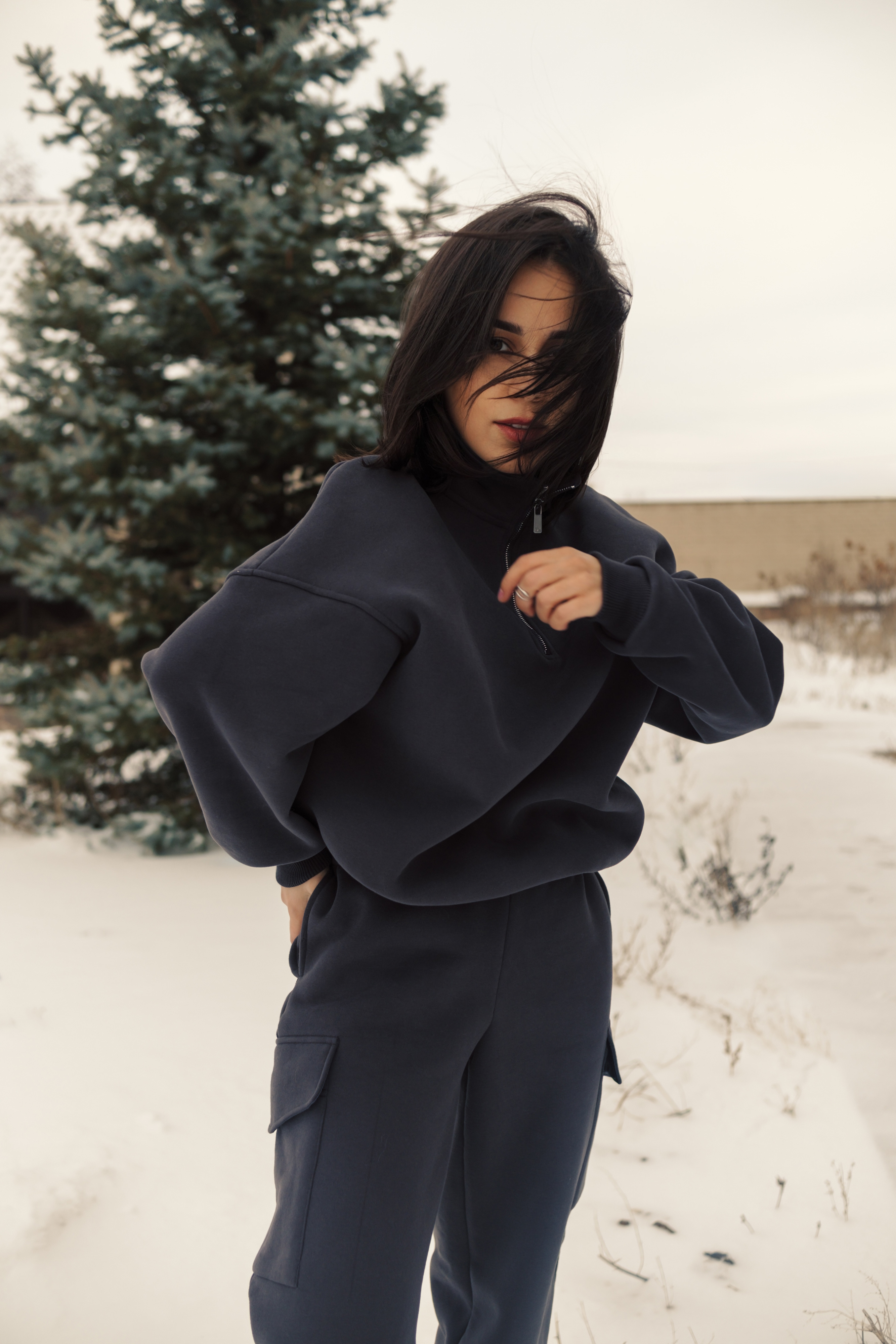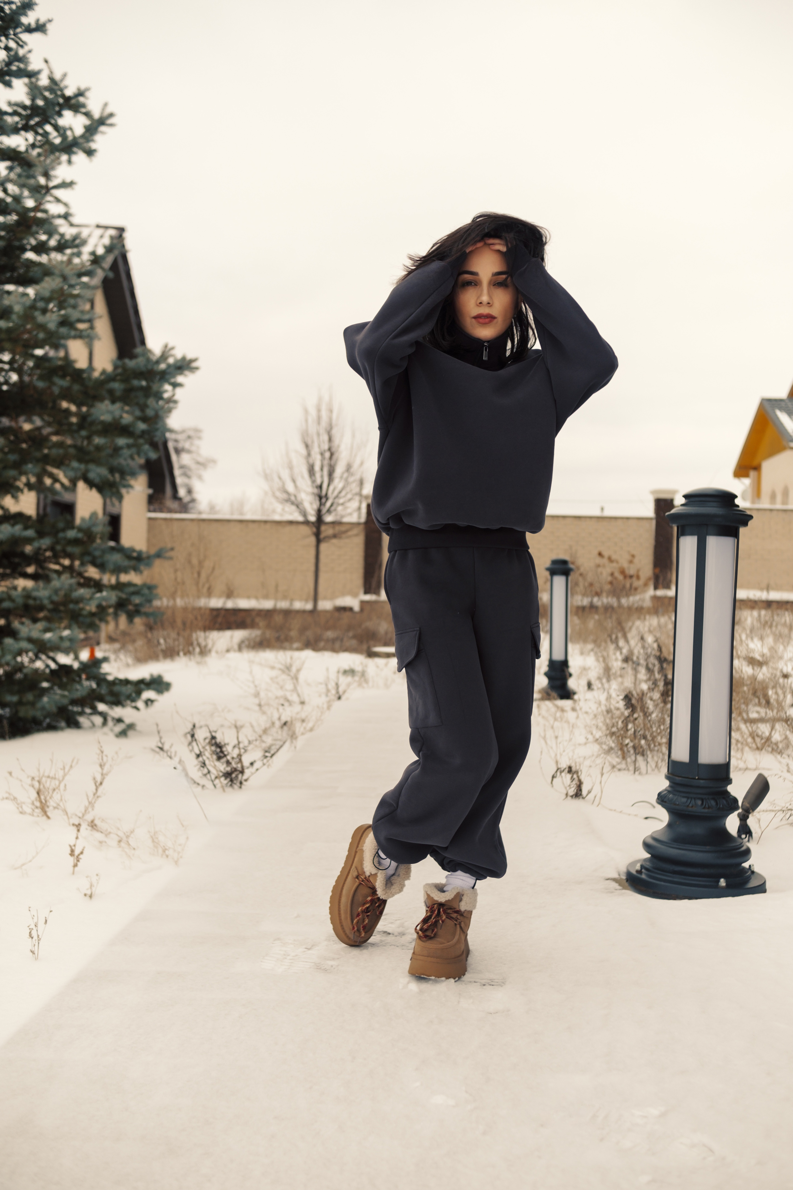 Худи большого объема из трикотажного полотна футер. Линия проймы спущена, рукав рубашечный. По низу рукава – притачная манжета из кашкорсе. Воротник стойка. Спереди у горловины – втачная неразъёмная молния. По низу изделия притачной пояс из кашкорсе.