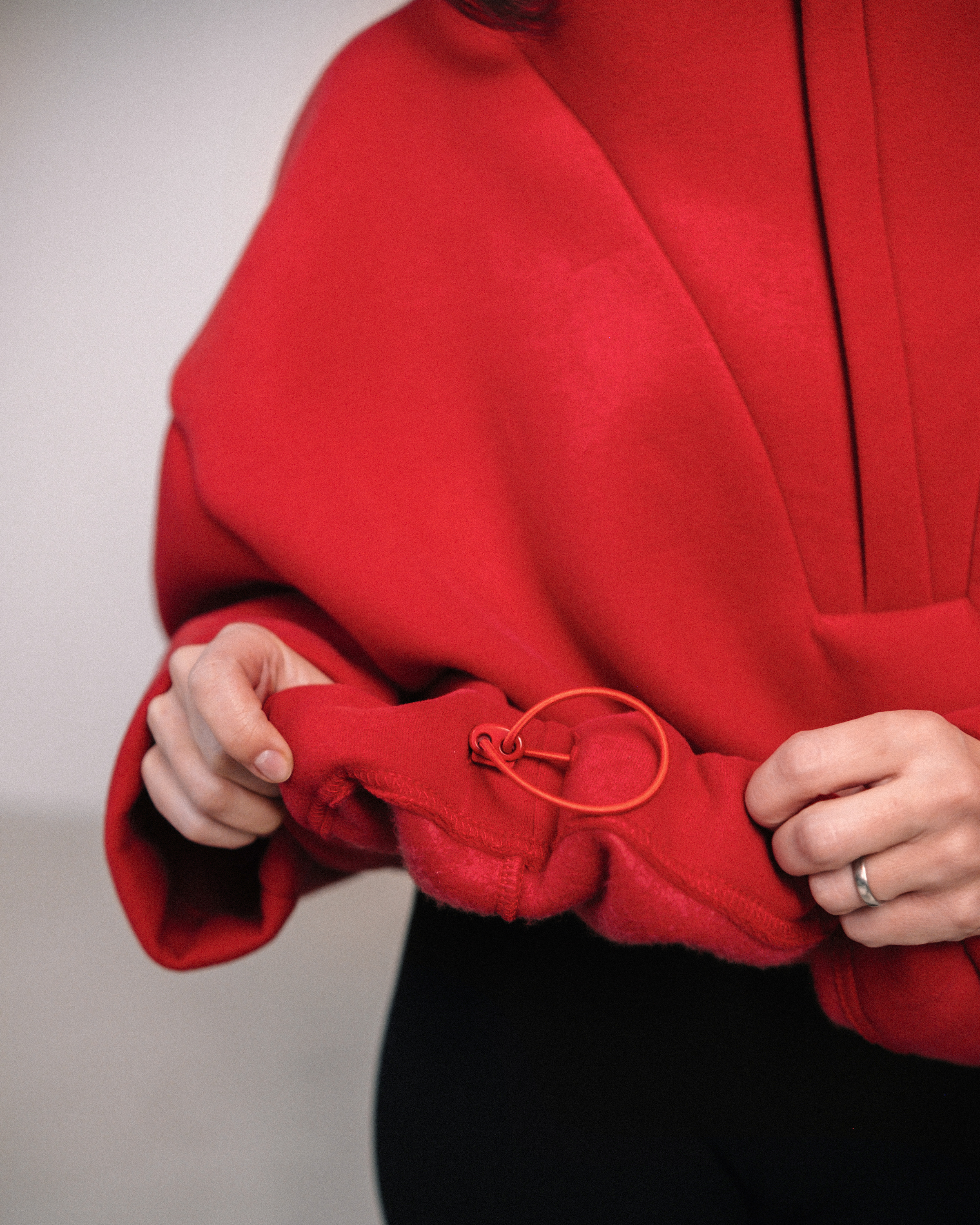 Худи из трикотажного полотна большого объема прямого силуэта. Горловина расширена по плечевым швам. Воротник притачной, объемная стойка, переходящая на деталь переда. Воротник застегивается на молнию, скрытую цельнокроеной планкой. Линия проймы спущена, рукав рубашечный, с широкой подгибкой по низу. Низ изделия прямой, с широкой подгибкой, в которую продета резинка с фиксаторами.