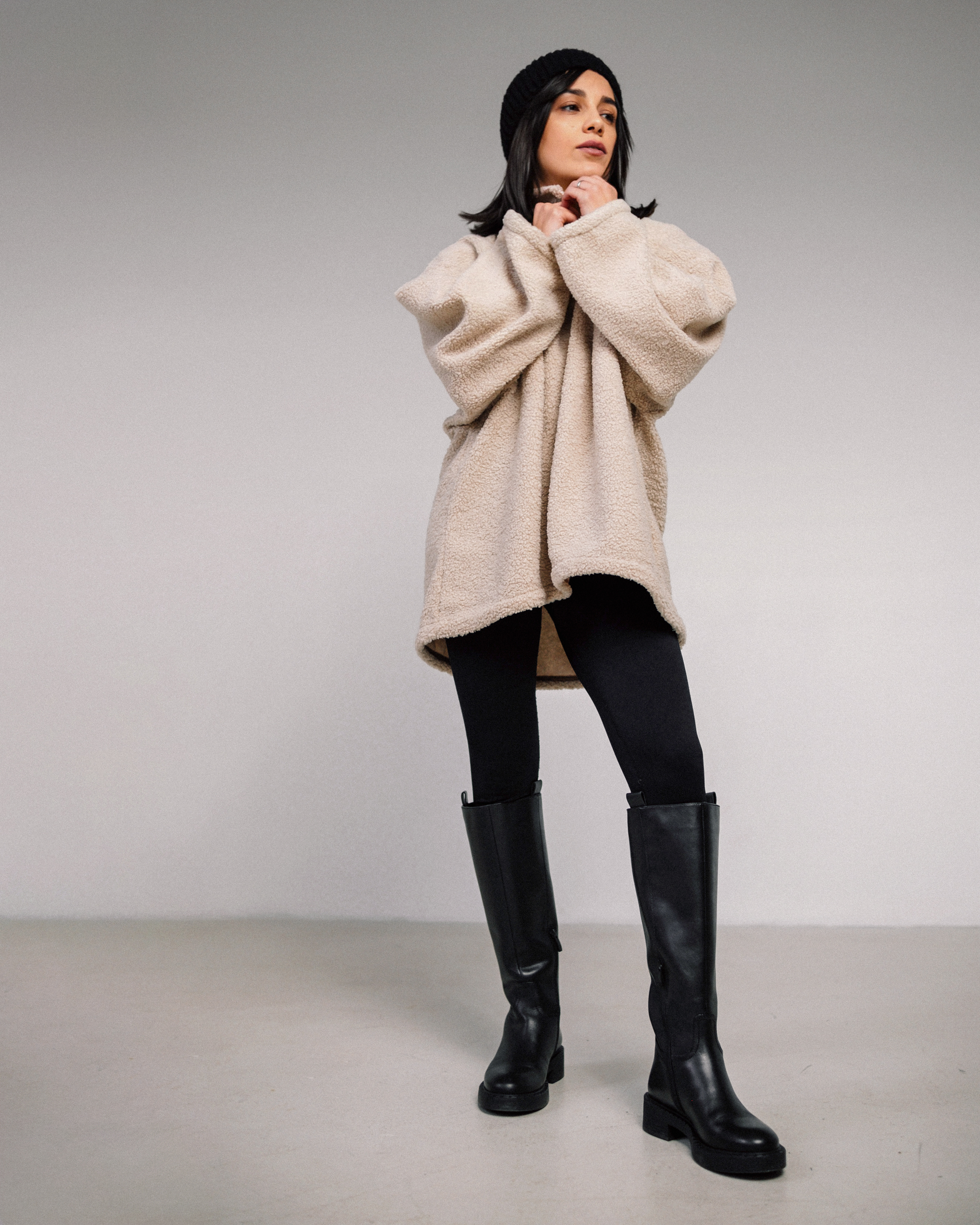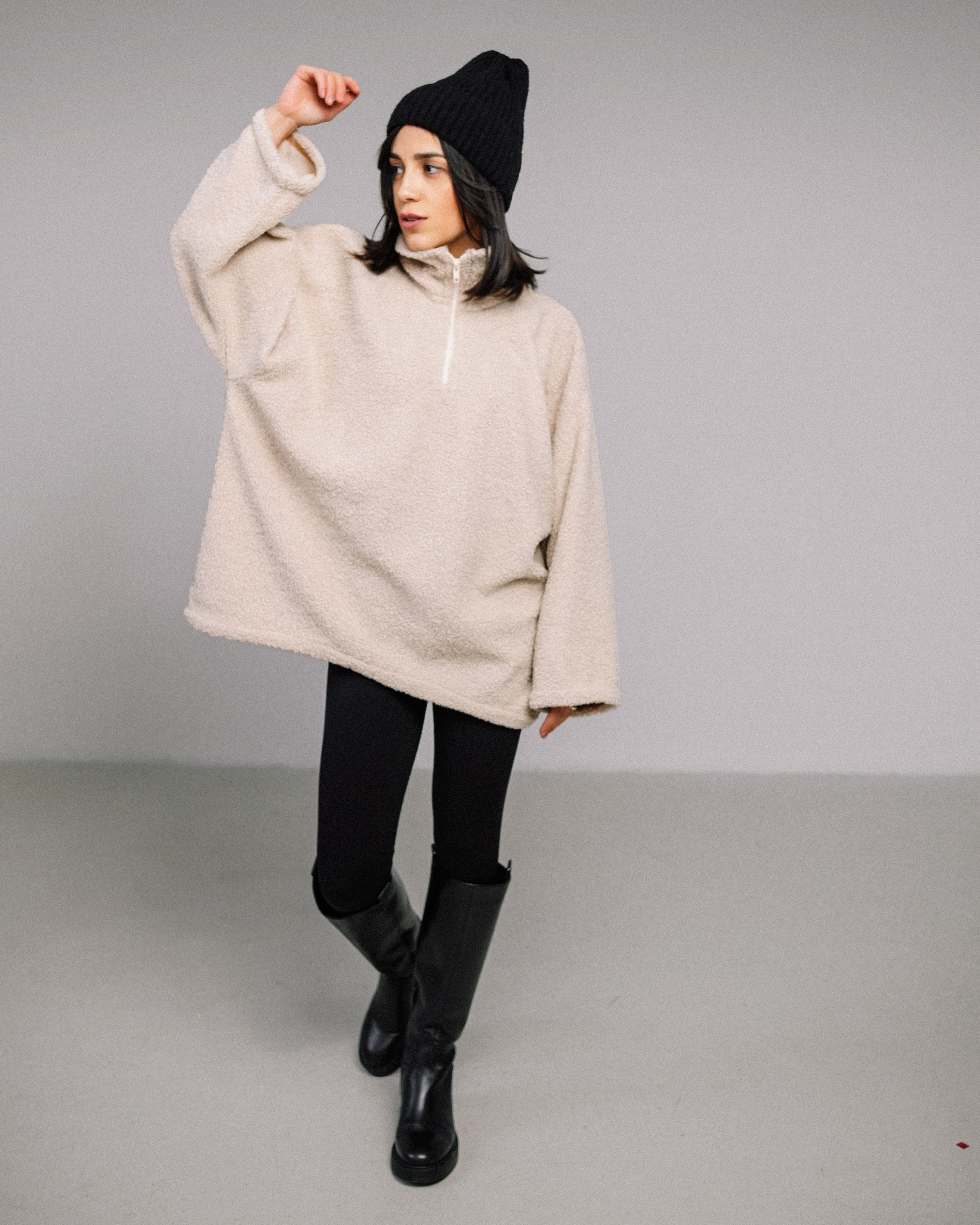 Худи из трикотажного искусственного меха свободного объема прямого силуэта. Воротник стойка, притачной, с молнией, переходящей на деталь переда. Линия проймы спущена, рукав рубашечный. Линия низа с плавным удлинением спереди на спинку. Швы худи с изнаночной стороны обработаны киперной лентой.