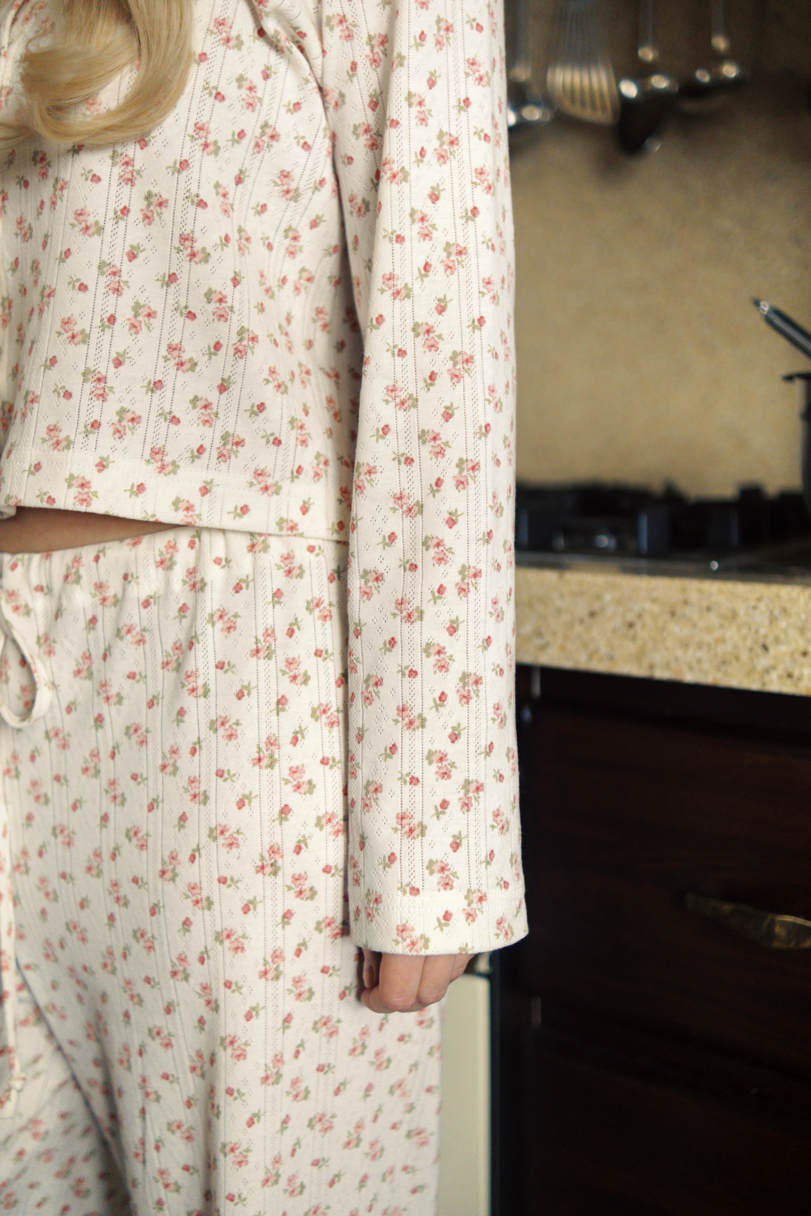 Пижамная кофточка прямого силуэта из ажурного трикотажного полотна с длинным рукавом. V-образный вырез. Застежка по поеду на 4 пуговицы. Длина ниже линии талии.