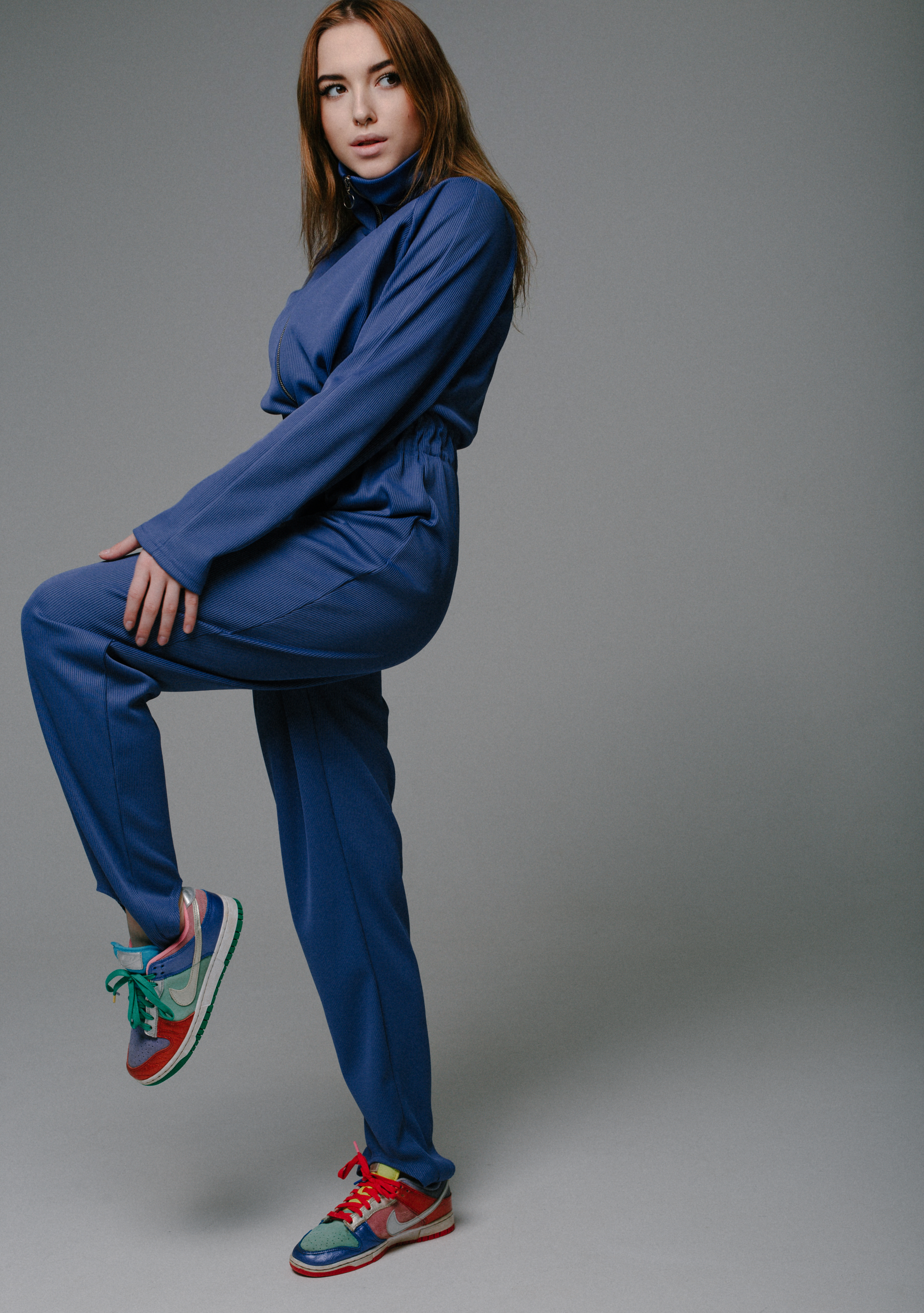 Комбинезон из трикотажного полотна с длинным рукавом. Рукав реглан. Воротник – высокая стойка с застежкой на молнию. По линии талии расположена кулиска с резинкой. Низ брючин со штрипками.
