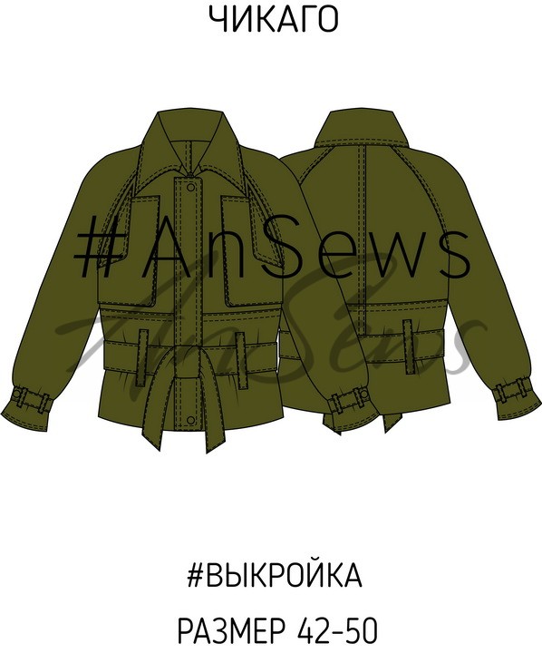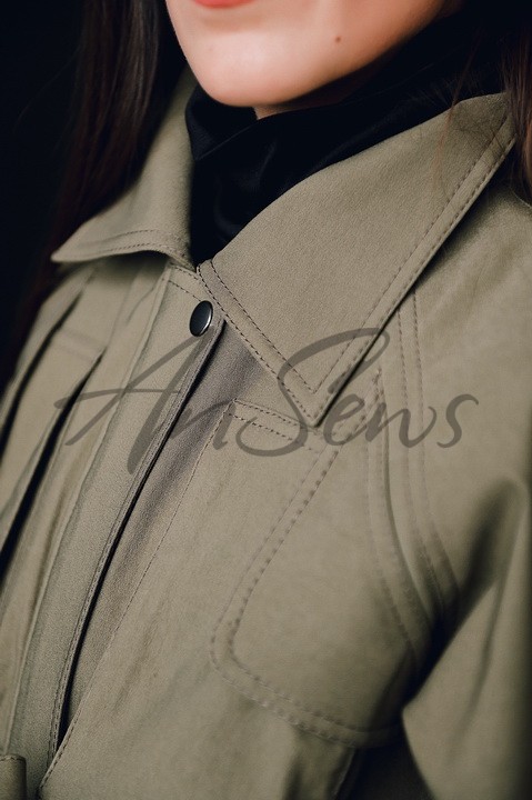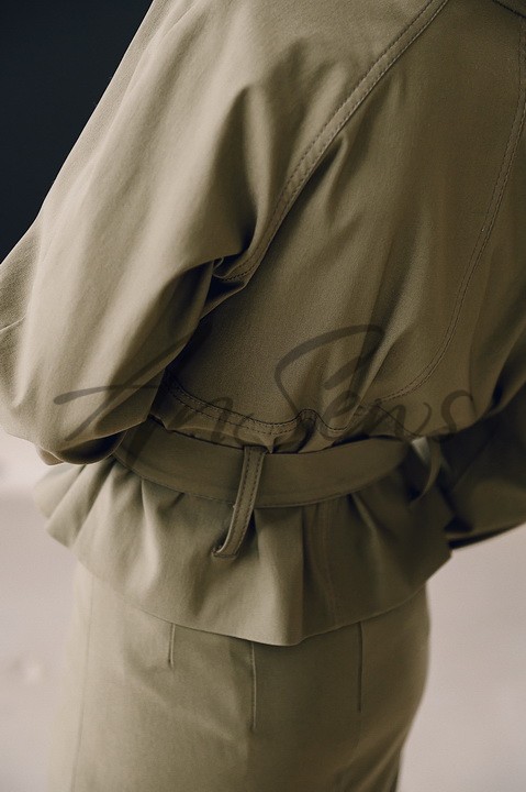Укороченная куртка прямого кроя без подкладки в стиле «Милитари», с накладными карманами с клапанами. Рукава покроя реглан со шлевками внизу и ремешками. Воротник отложной, застежка на молнию и кнопки на планке. По линии талии – пояс со шлевками.