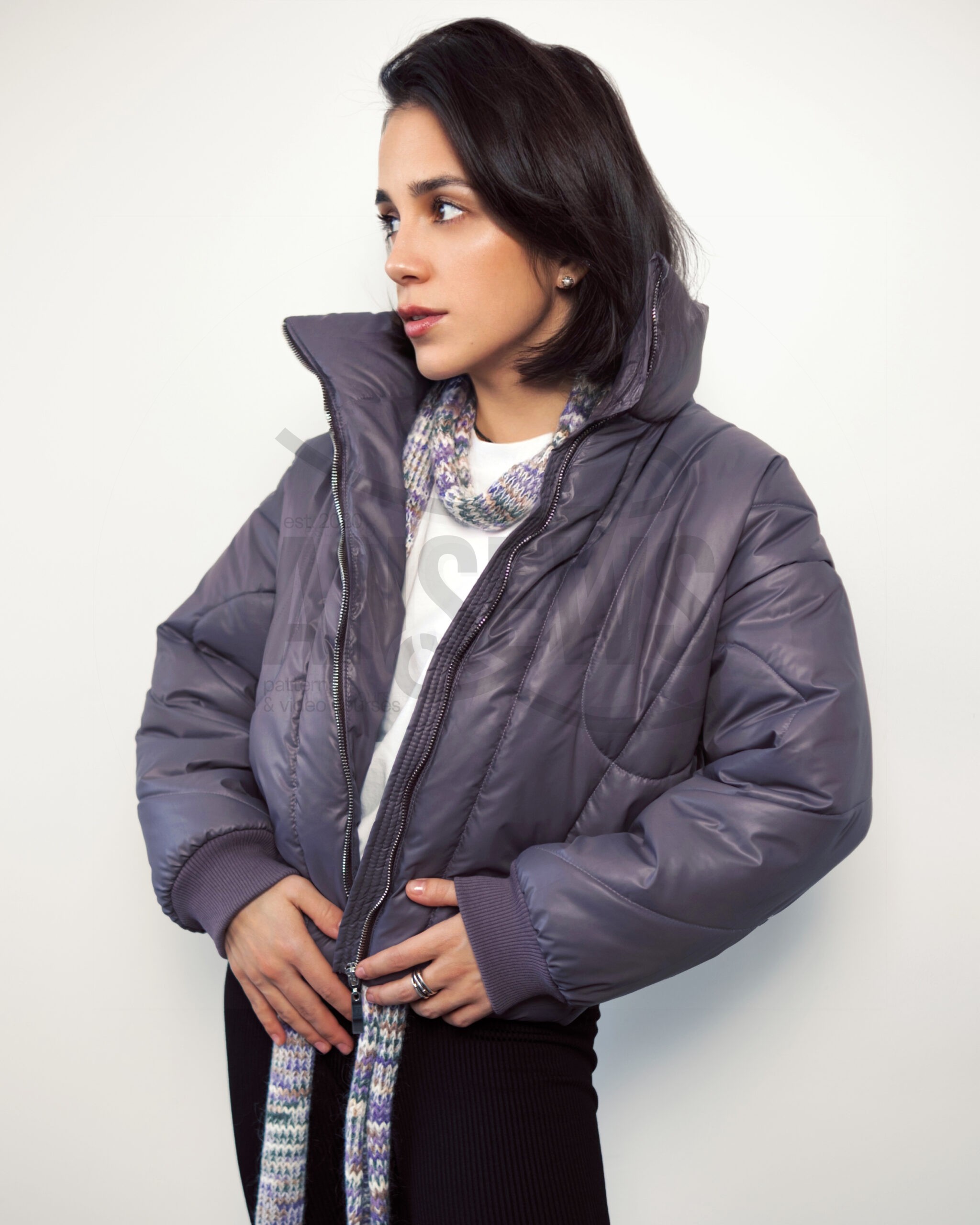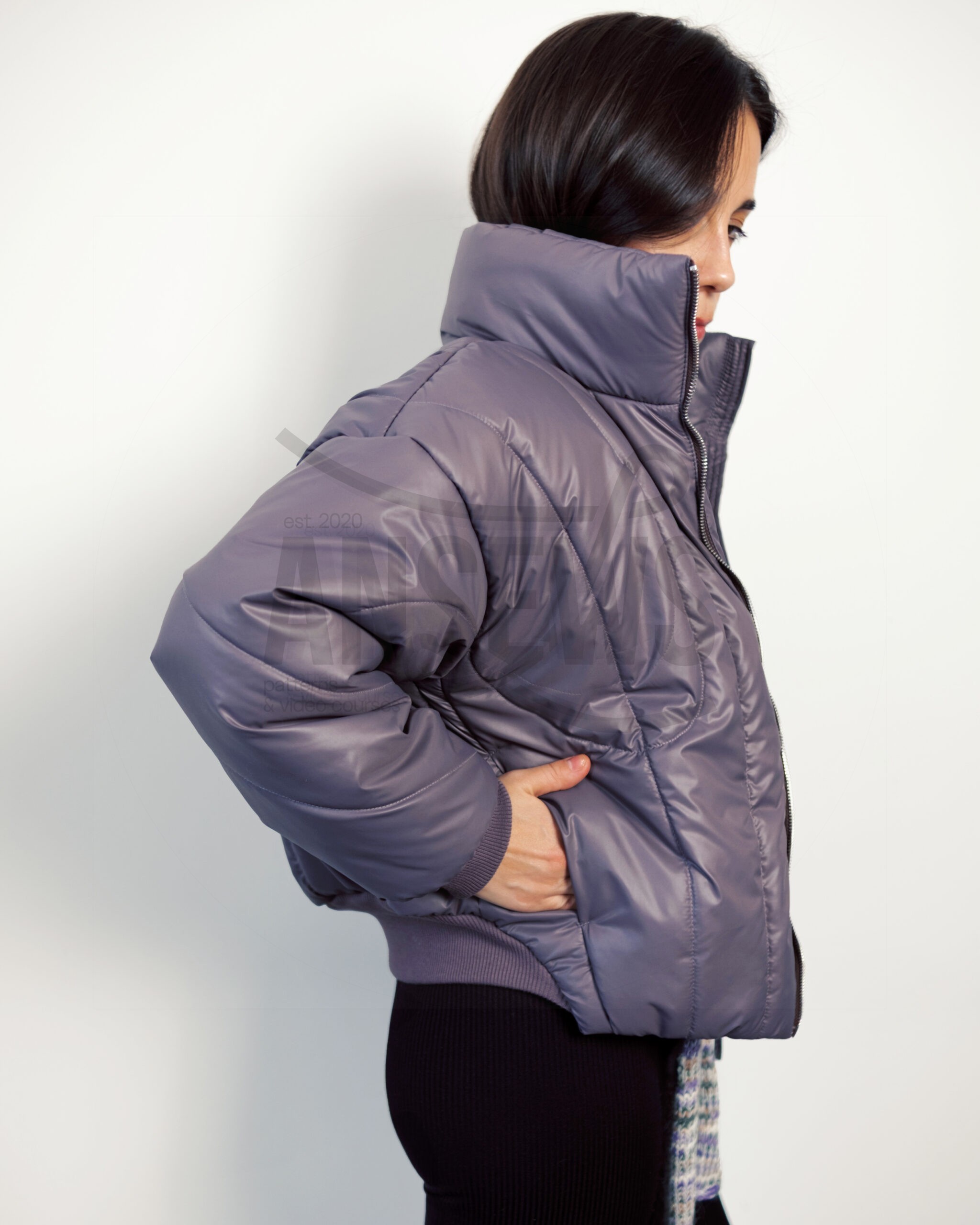 Куртка свободного объёма, зауженного к низу силуэта, длиной чуть ниже линии талии, на утеплителе и подкладке. Застежка по центру переда на разъемную молнию, переходящая на высокий воротник–стойку. С внутренней стороны молнии – ветрозащитная планка. Линия плеча расширена. Рукав втачной, одношовный, рубашечного типа, полной длины. Нижний срез рукава обработан притачной трикотажной манжетой. Перед с отрезным бочком, наклонный шов выходит из проймы. В шве переда распложен карман на молнии. На переде с внутренней стороны изделия на подгибке нерегулируемая кулиска с резинкой. Низ спинки и частично переда изделия обработан трикотажным притачным поясом. Перед, спинка и рукава простеганы с утеплителем фигурными строчками.