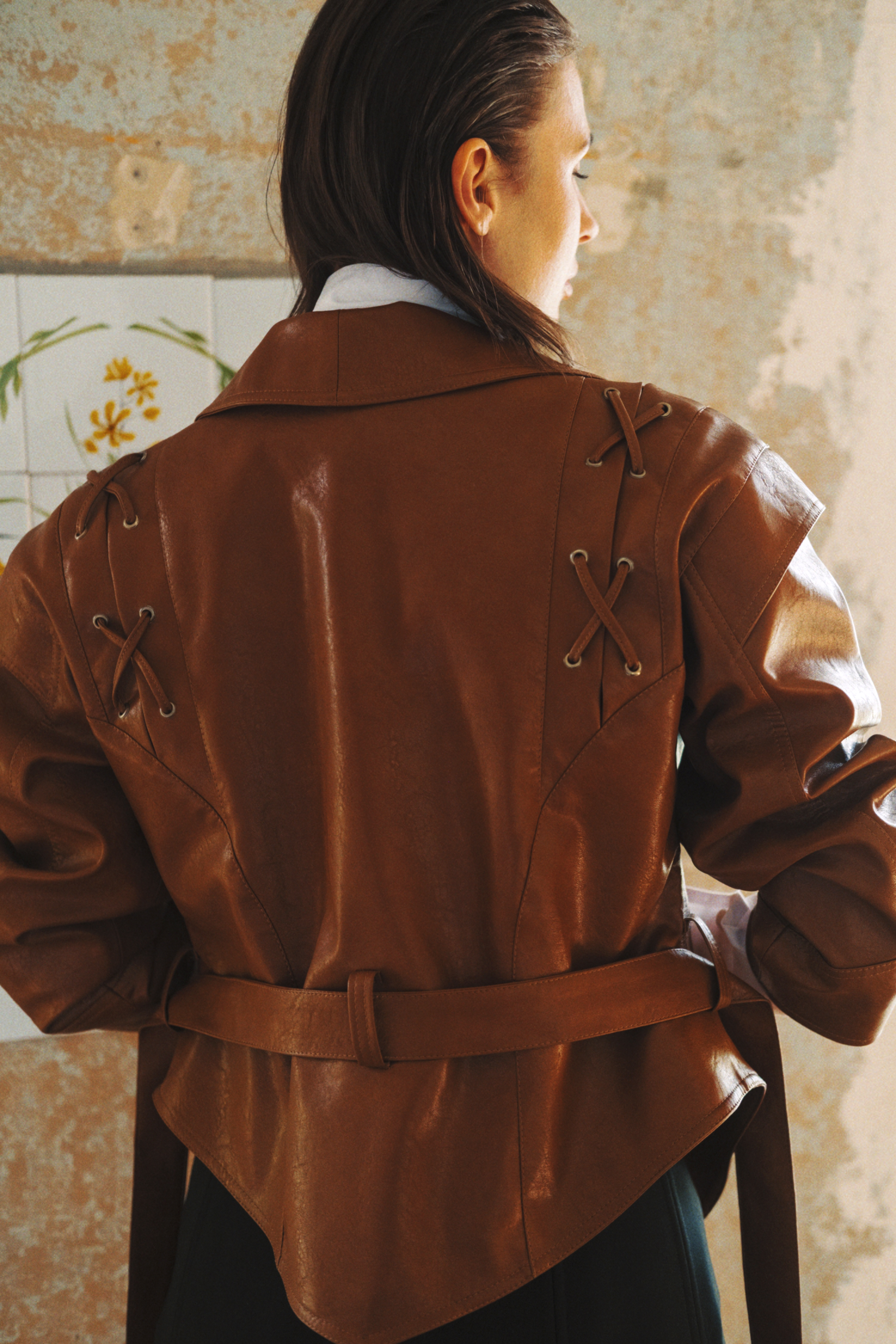 Куртка из искусственной кожи умеренного объема приталенного силуэта. Воротник-шалька. Линия плеча спущена. На полочках и спинке расположены рельефные швы и декоративные вставки со шнуровкой. Рукав длинный, рубашечного кроя, трехшовный, с притачной манжетой фигурной формы. В средней части рукава по окату втачана декоративная фигурная планка, у манжеты расположены два встречных защипа. Куртка на запАх, без застежки, фиксируется на талии поясом, продетым в шлевки. Линия низа фигурная. Куртка на притачной подкладке.