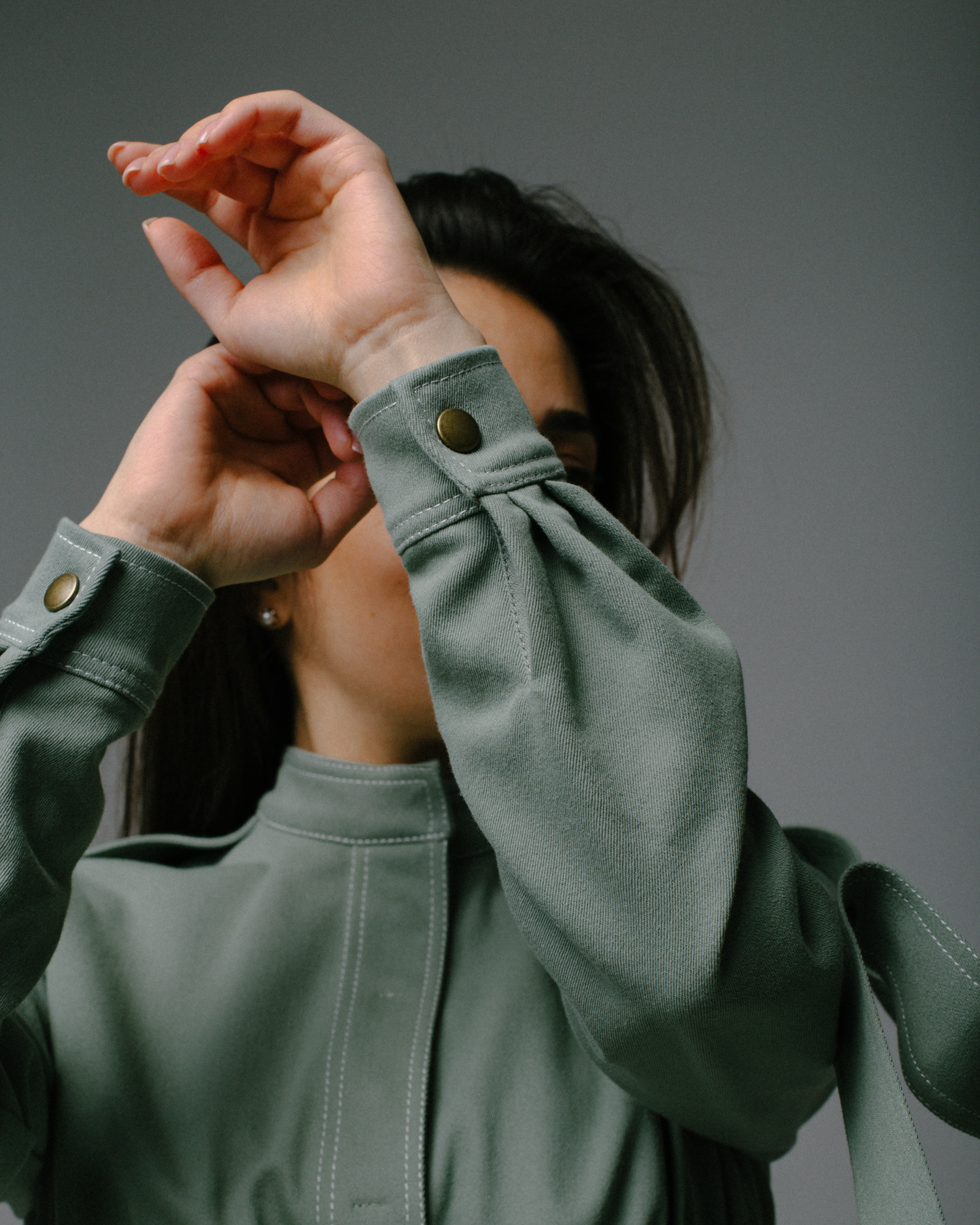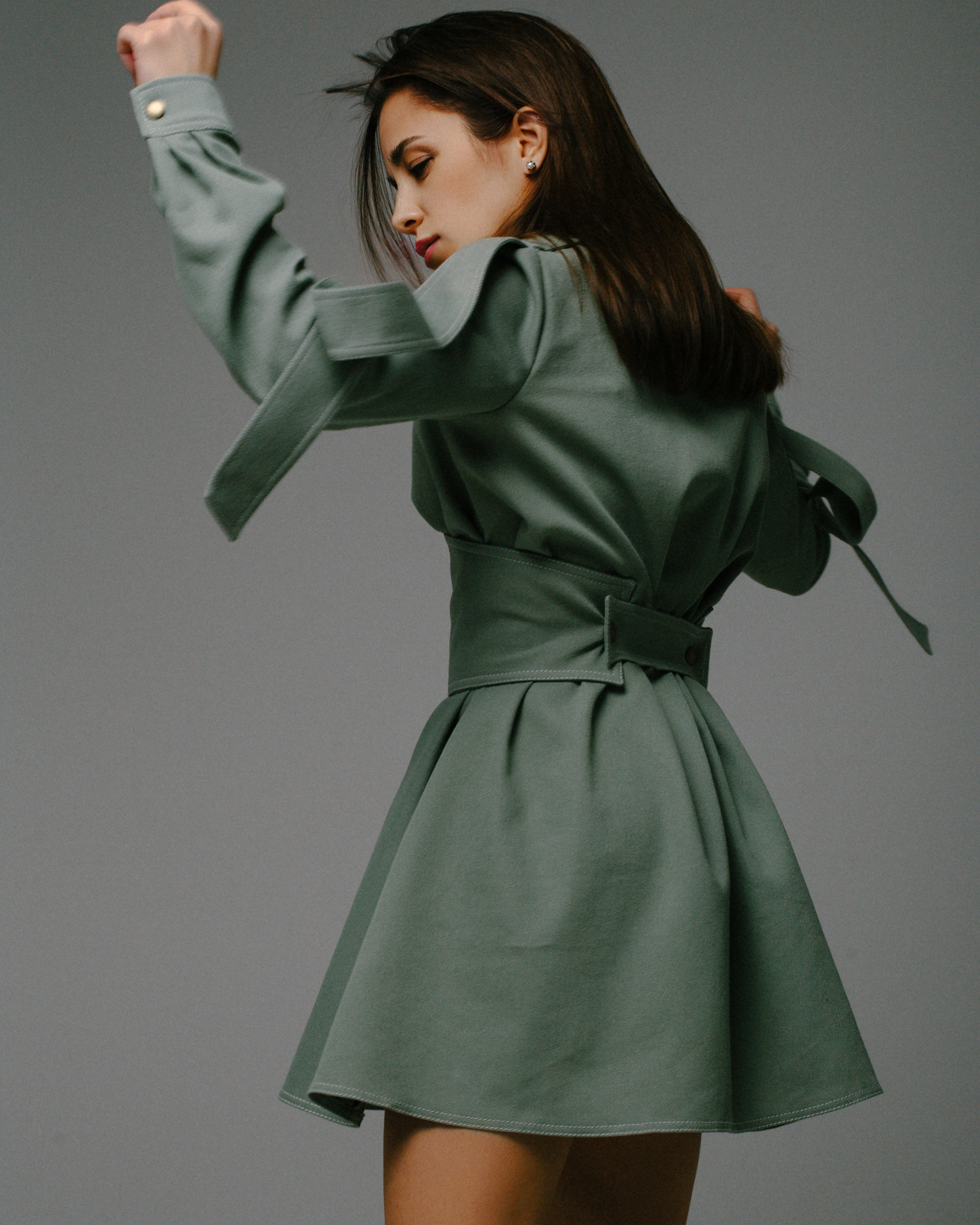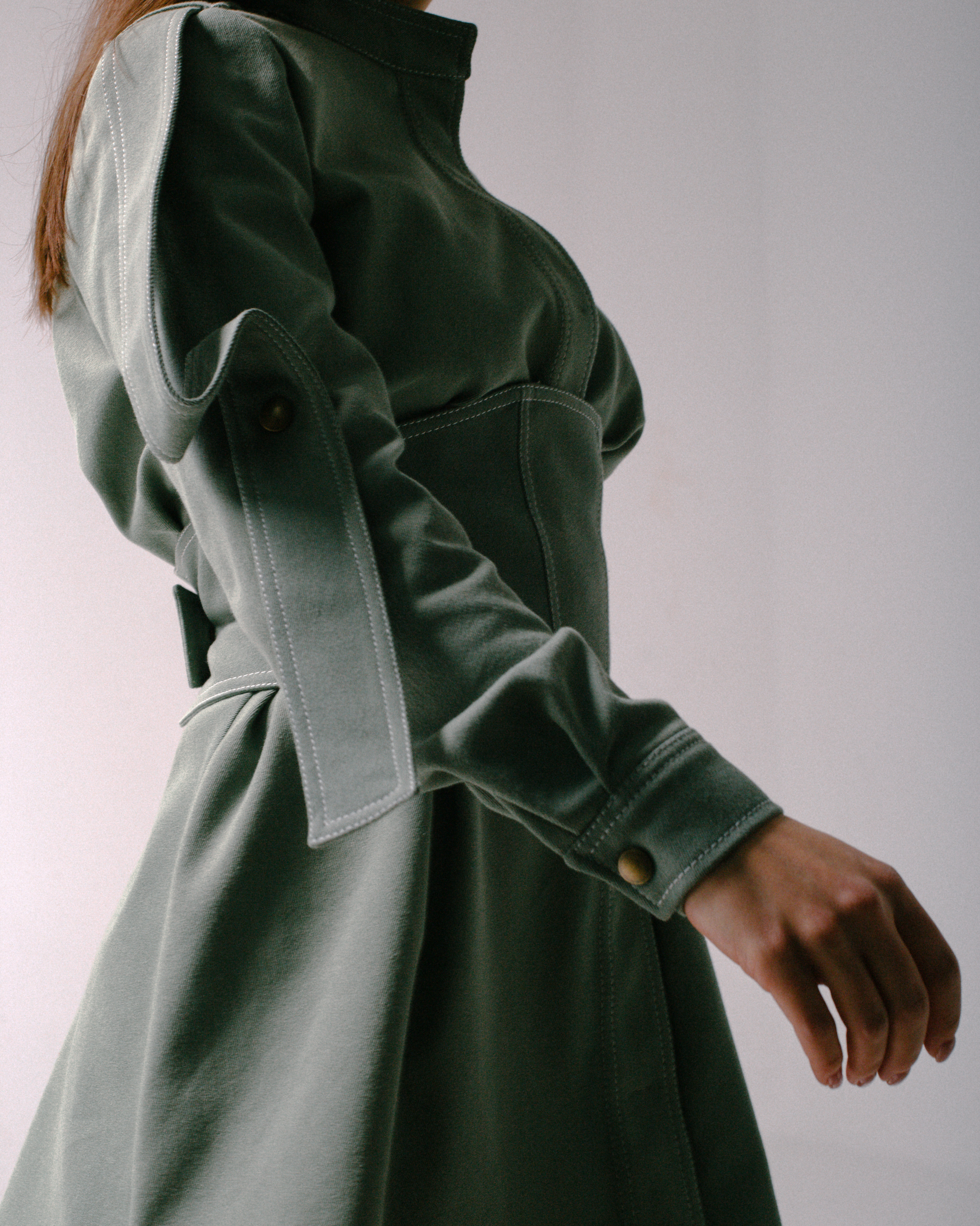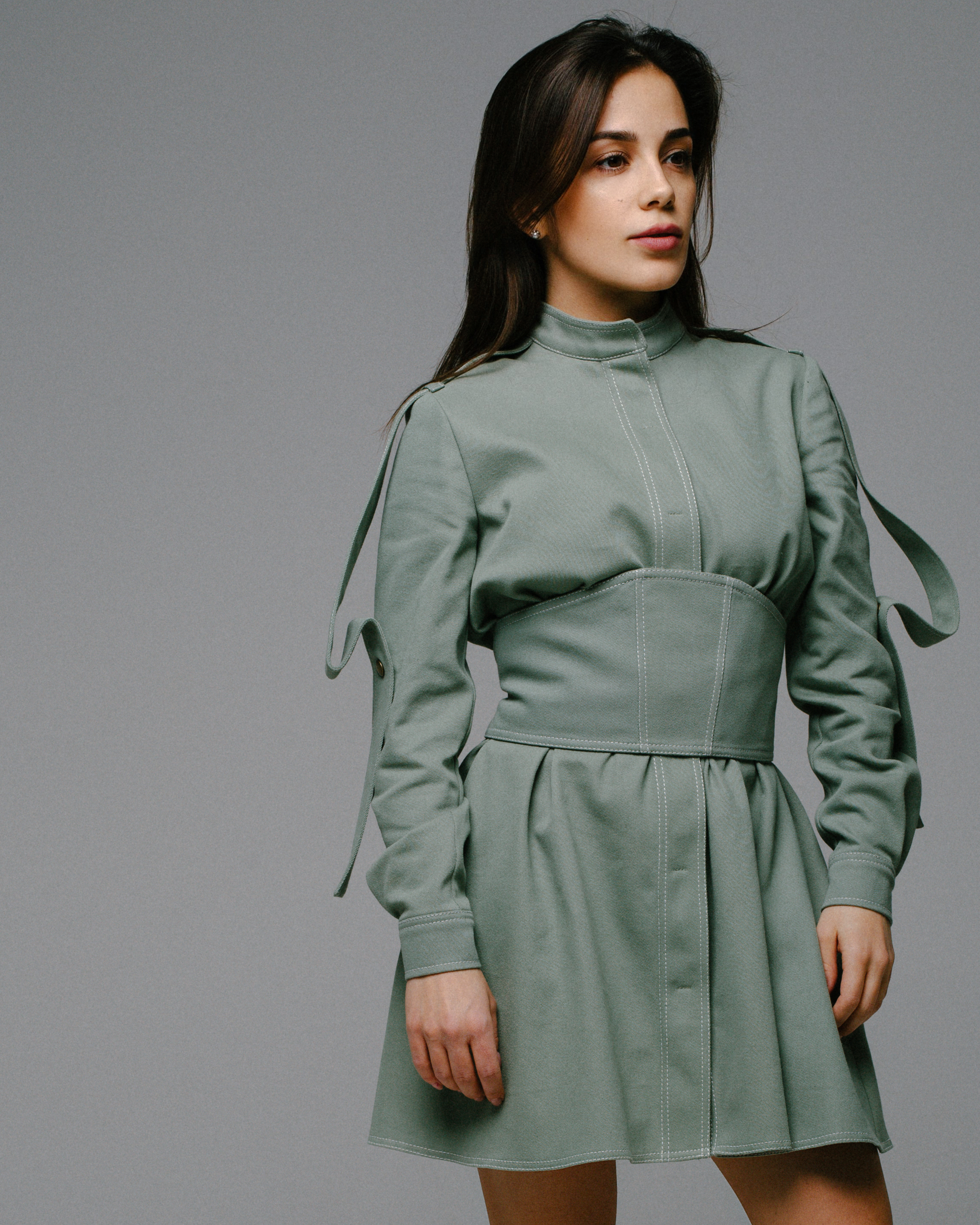 Платье из джинсовой ткани А-силуэта. Рукава втачные, с декоративными ремешками, втачанными в горловину. Низ рукава на манжете. Застежка по средней линии переда на супатную застежку на кнопках. Воротник – стойка. К платью прилагается широкий пояс с застежкой на кнопки. Швы платья и пояса отстрочены двойной джинсовой строчкой.