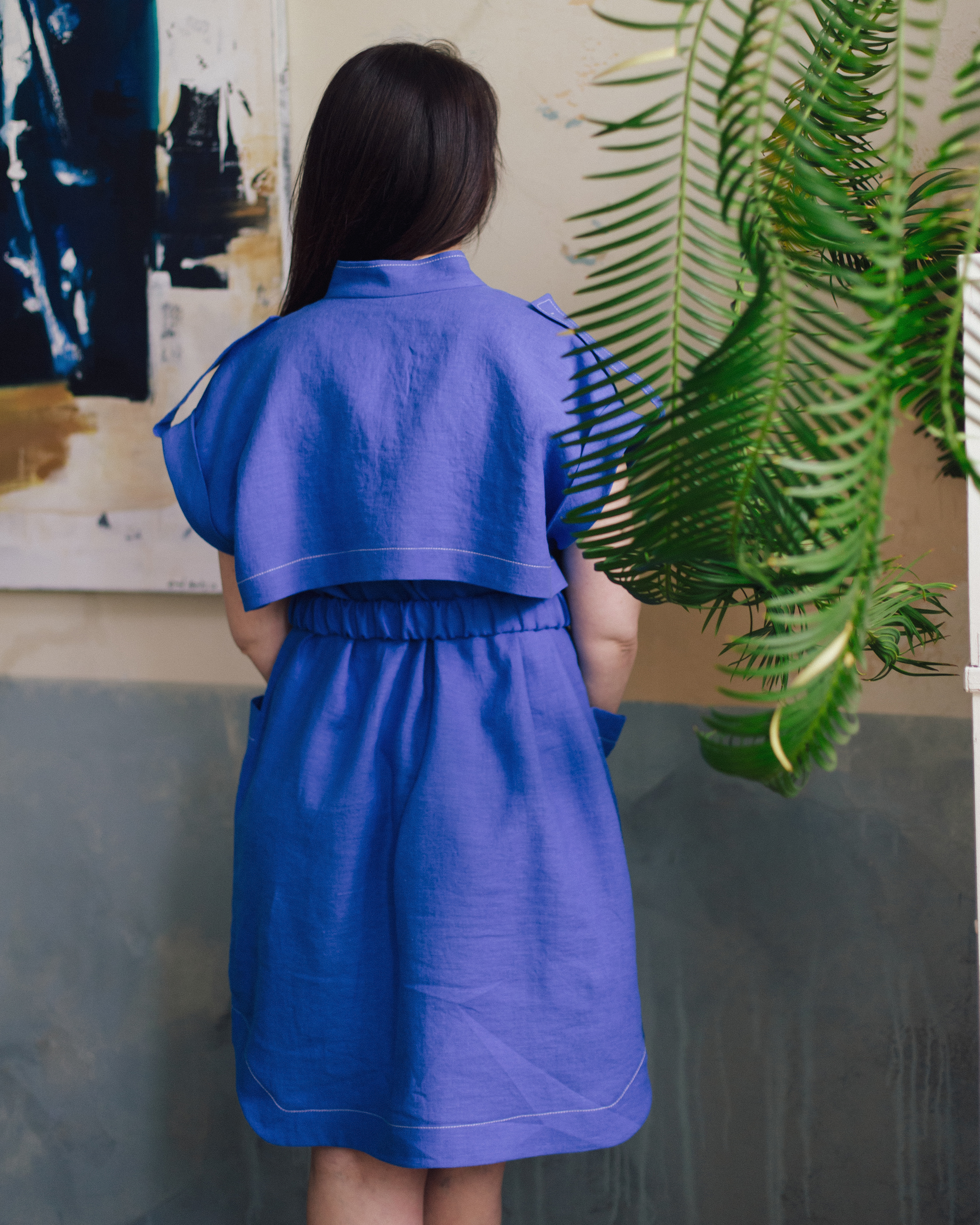 Платье из льняной ткани, прямого силуэта. Вырез V-образный, с планками. На переде и спинке расположены отлетные кокетки. Плечо спущено, пройма оформлена отложной манжетой и погоном. На переде на груди и по бокам – накладные карманы. Низ платья фигурный. Пояс с частичной резинкой застегивается на полукольца. Платье дополнено контрастной отстрочкой.