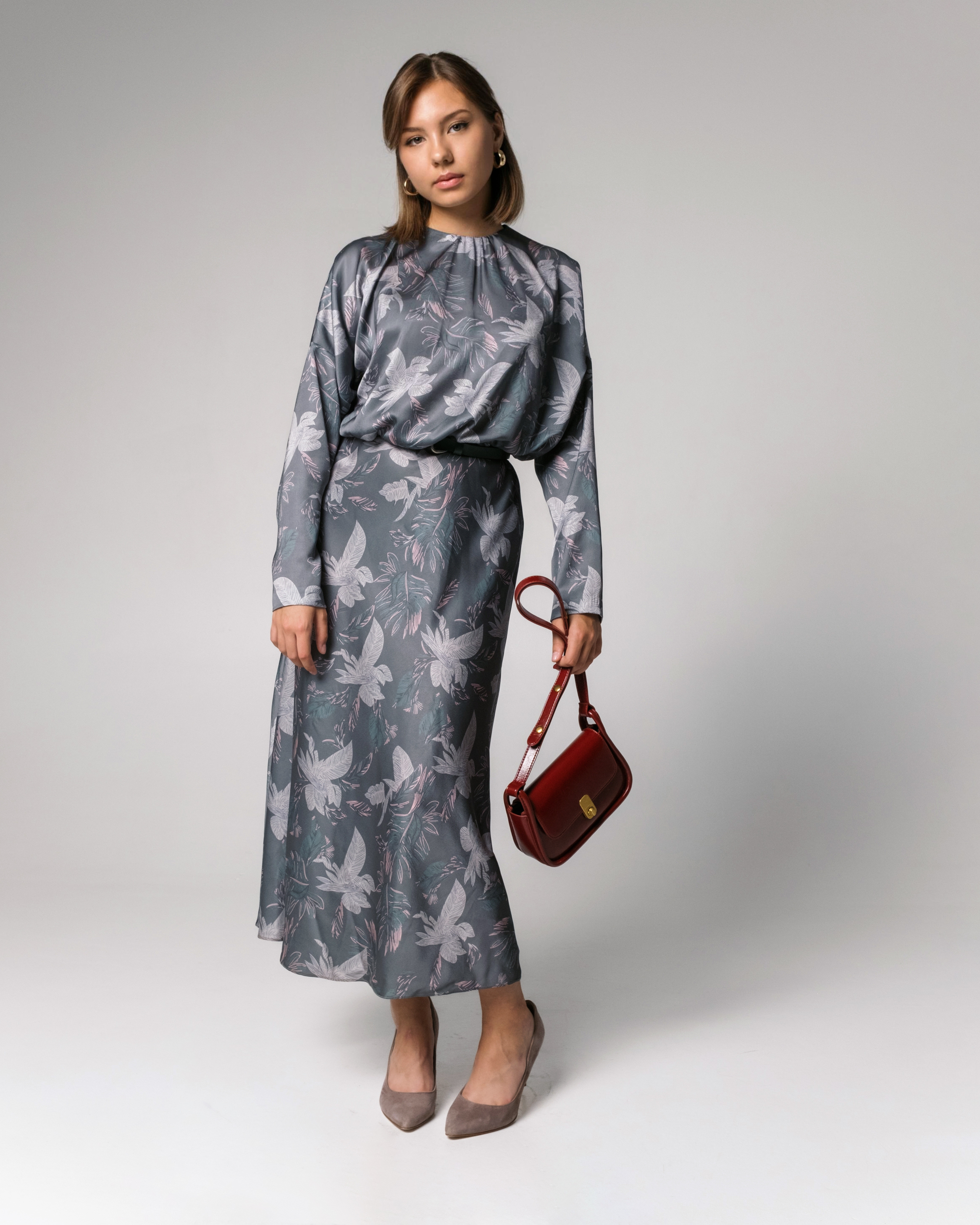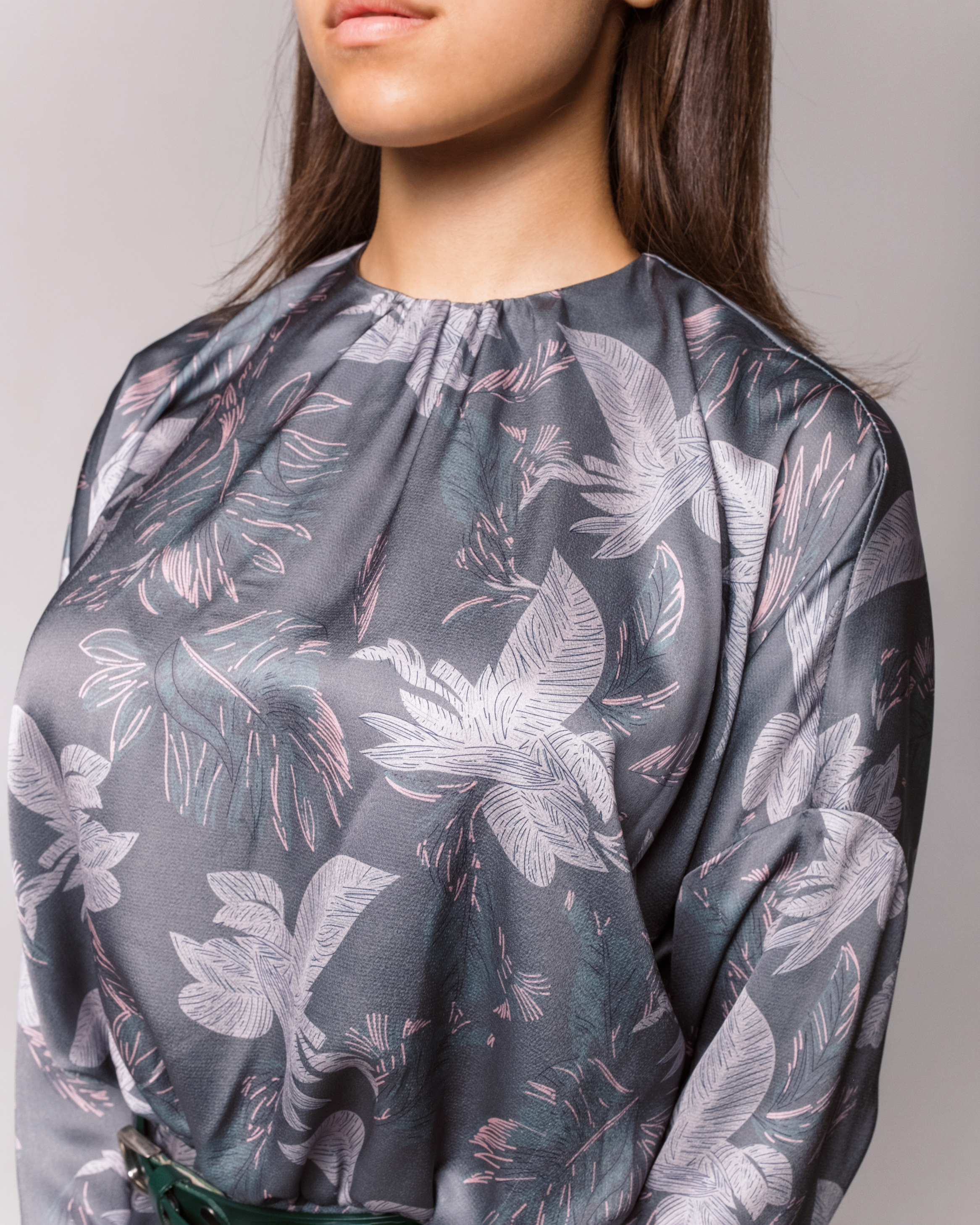 Платье большого объема на груди и умеренного объема по бедрам, приталенного силуэта, с небольшим расширением к низу. Отрезное по линии талии, с резинкой в талиевом шве. В среднем шве спинки застежка на потайную молнию. Вырез горловины округлой формы, с небольшой сборкой спереди. Линия проймы спущена, рукав заужен к низу. Юбка платья выкроена по косой нити. На задних полотнищах юбки расположены талиевые вытачки. Длина платья ниже середины икры.