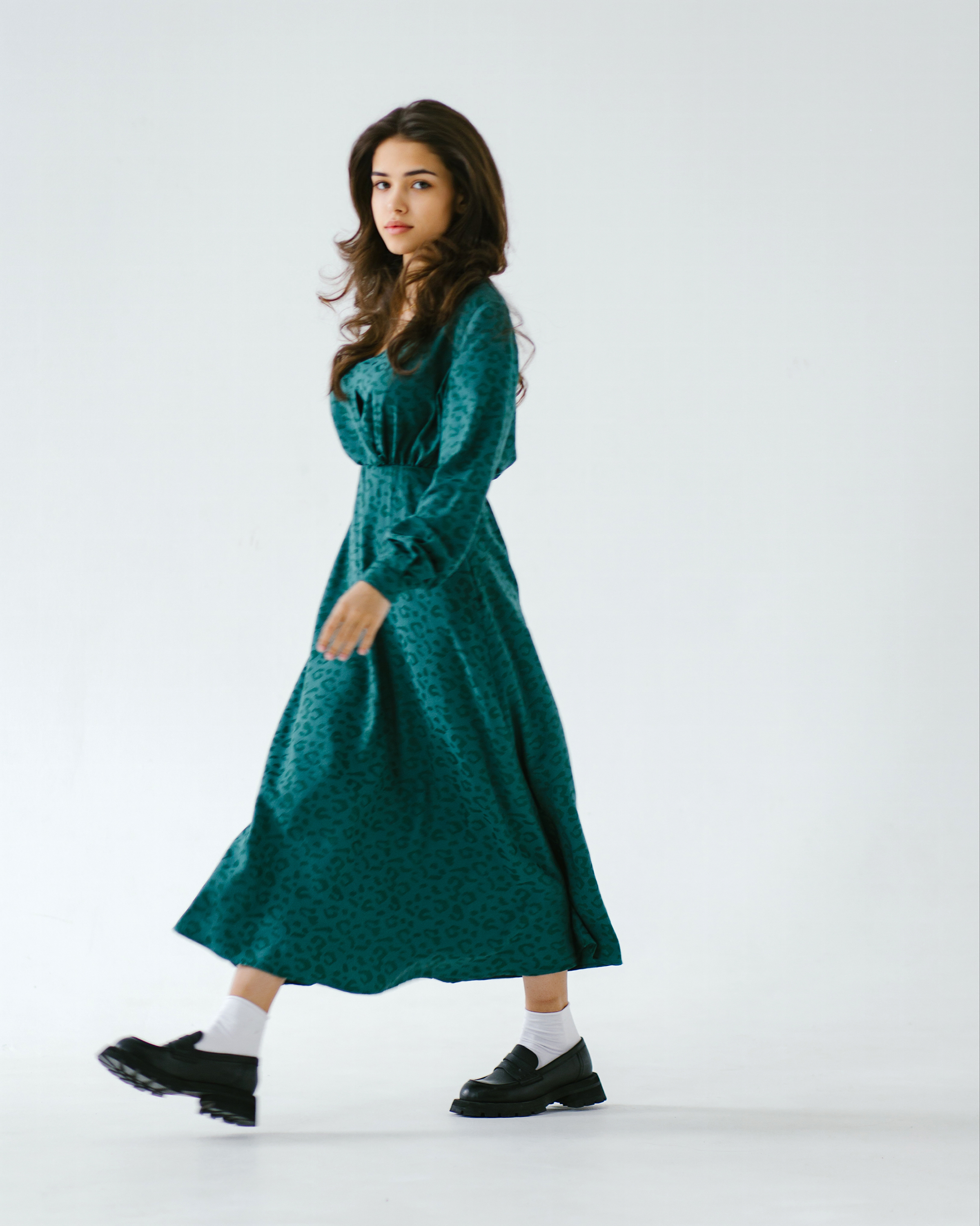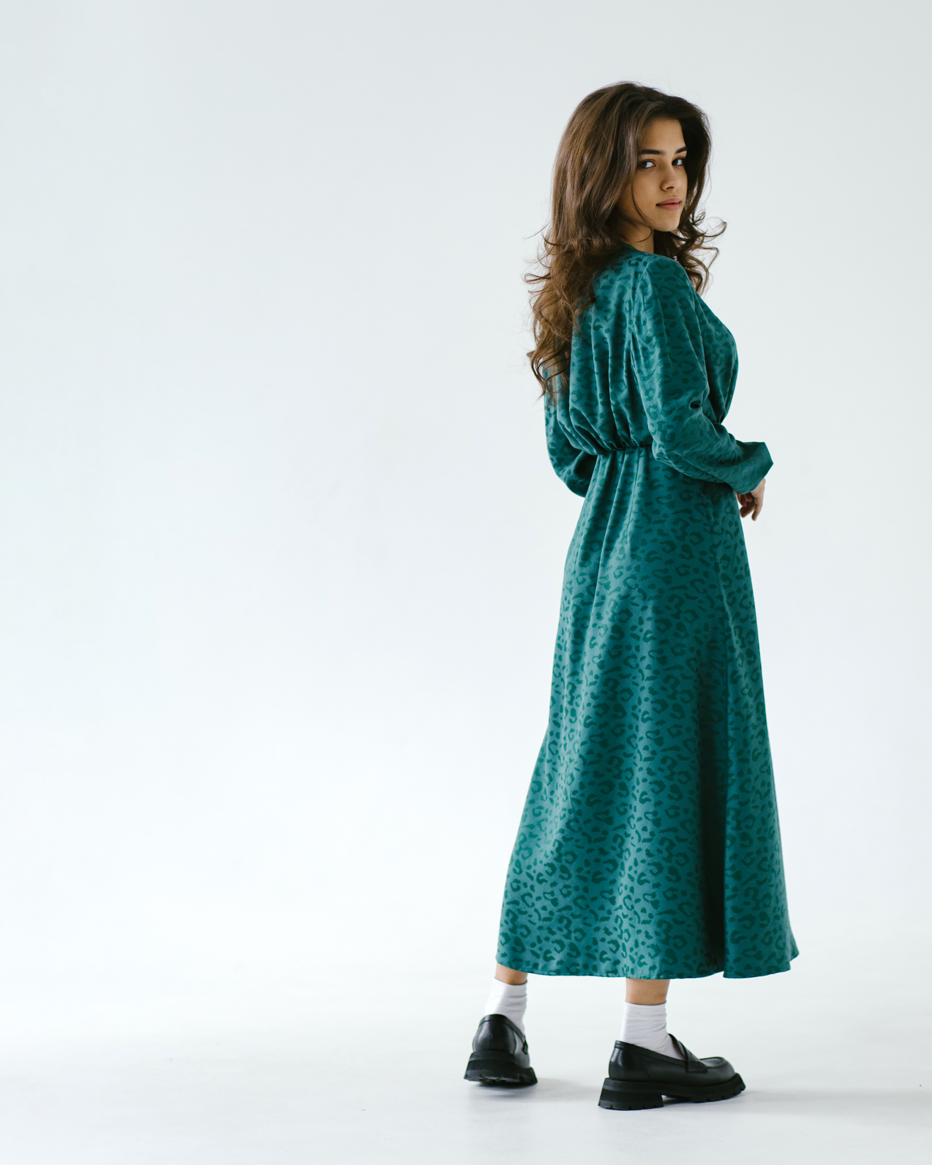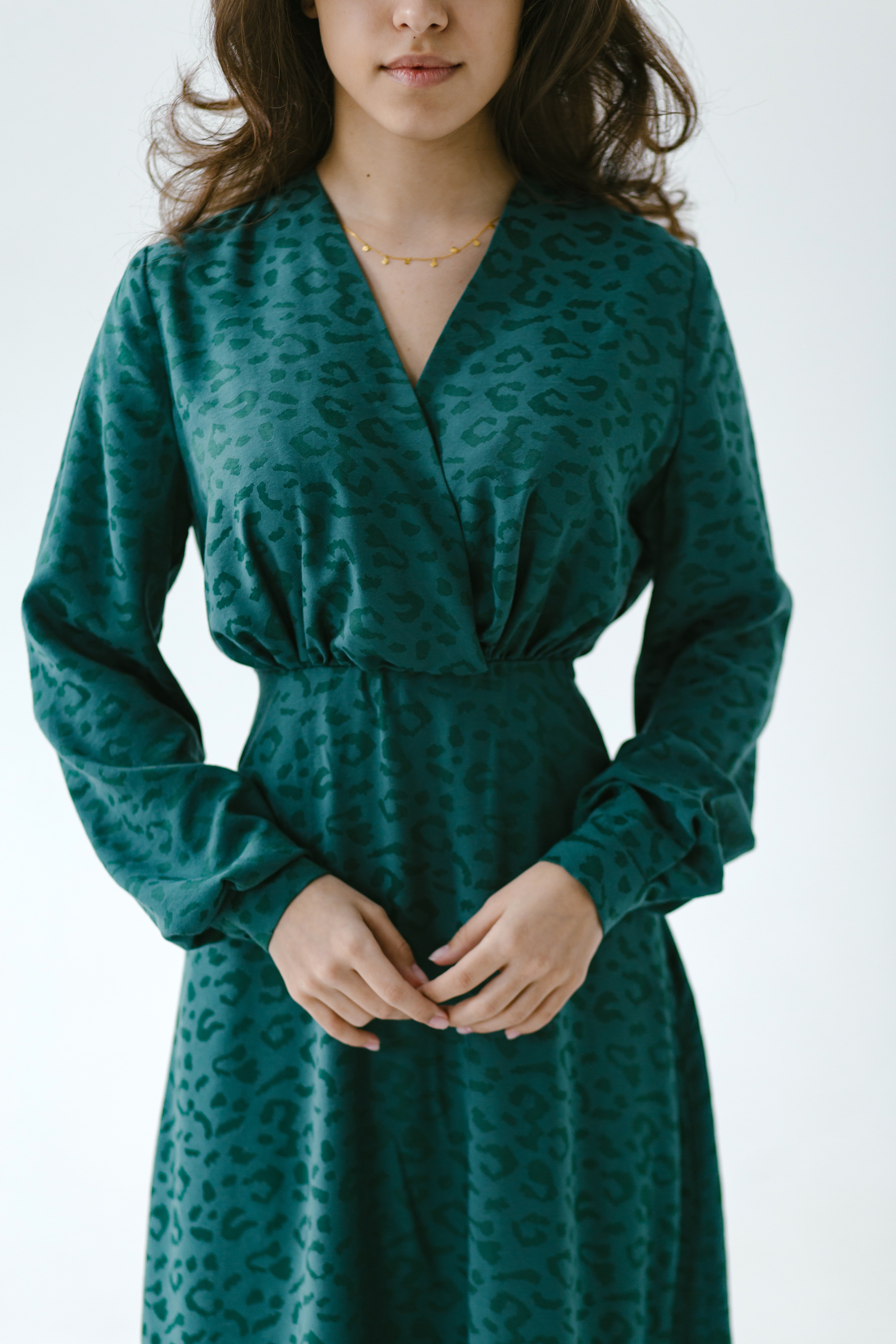 Платье отрезное по талии, расклешённое к низу, длиной до середины щиколотки из вискозного шёлка. Глубокий вырез горловины V–образной формы на запАх. Лиф спереди и сзади присборен по талии. Рукав длинный с двумя складками внизу. Низ рукава на манжете, застёгивающейся на пуговицу. Застёжка–молния в левом боковом шве платья.
