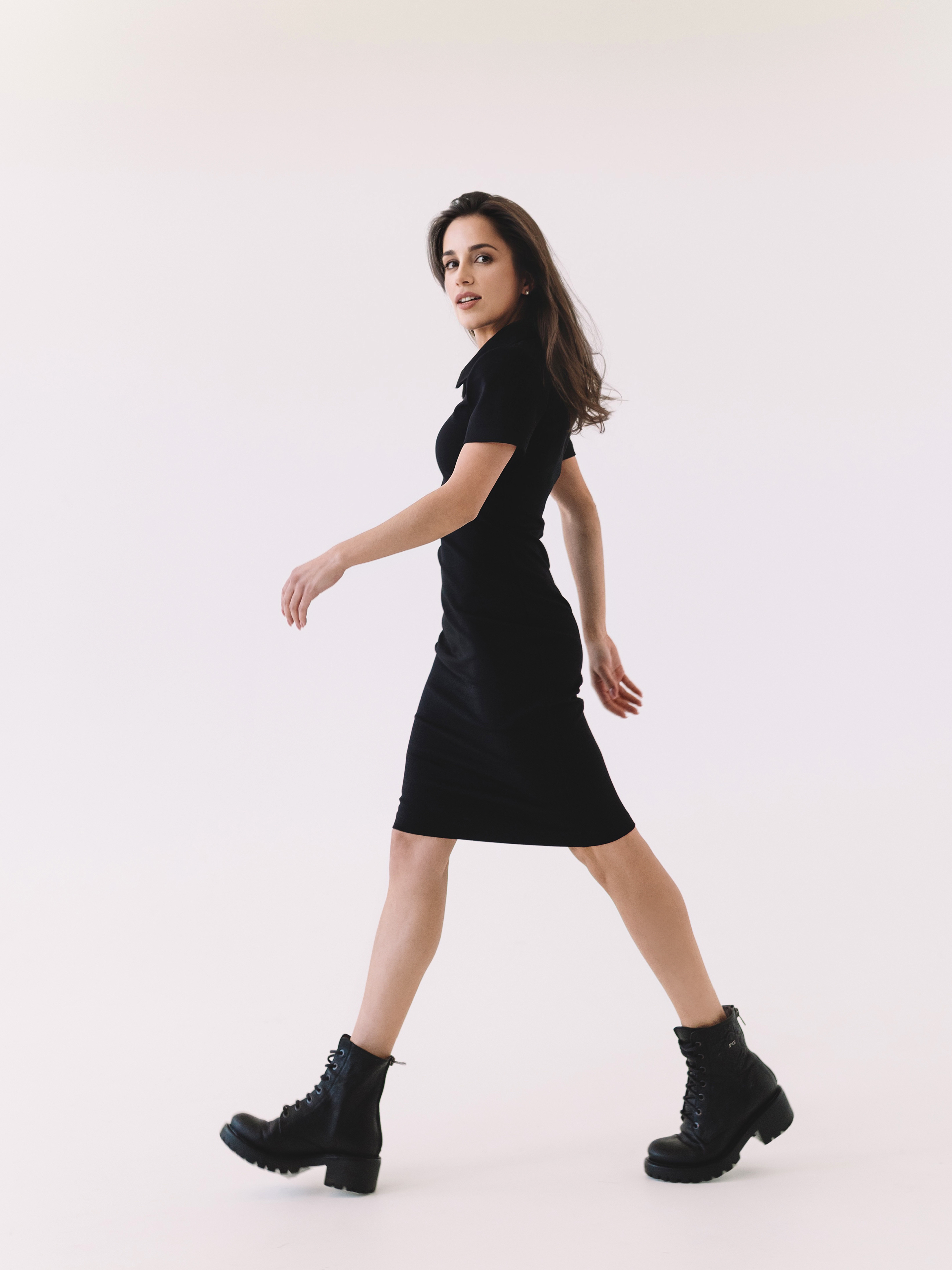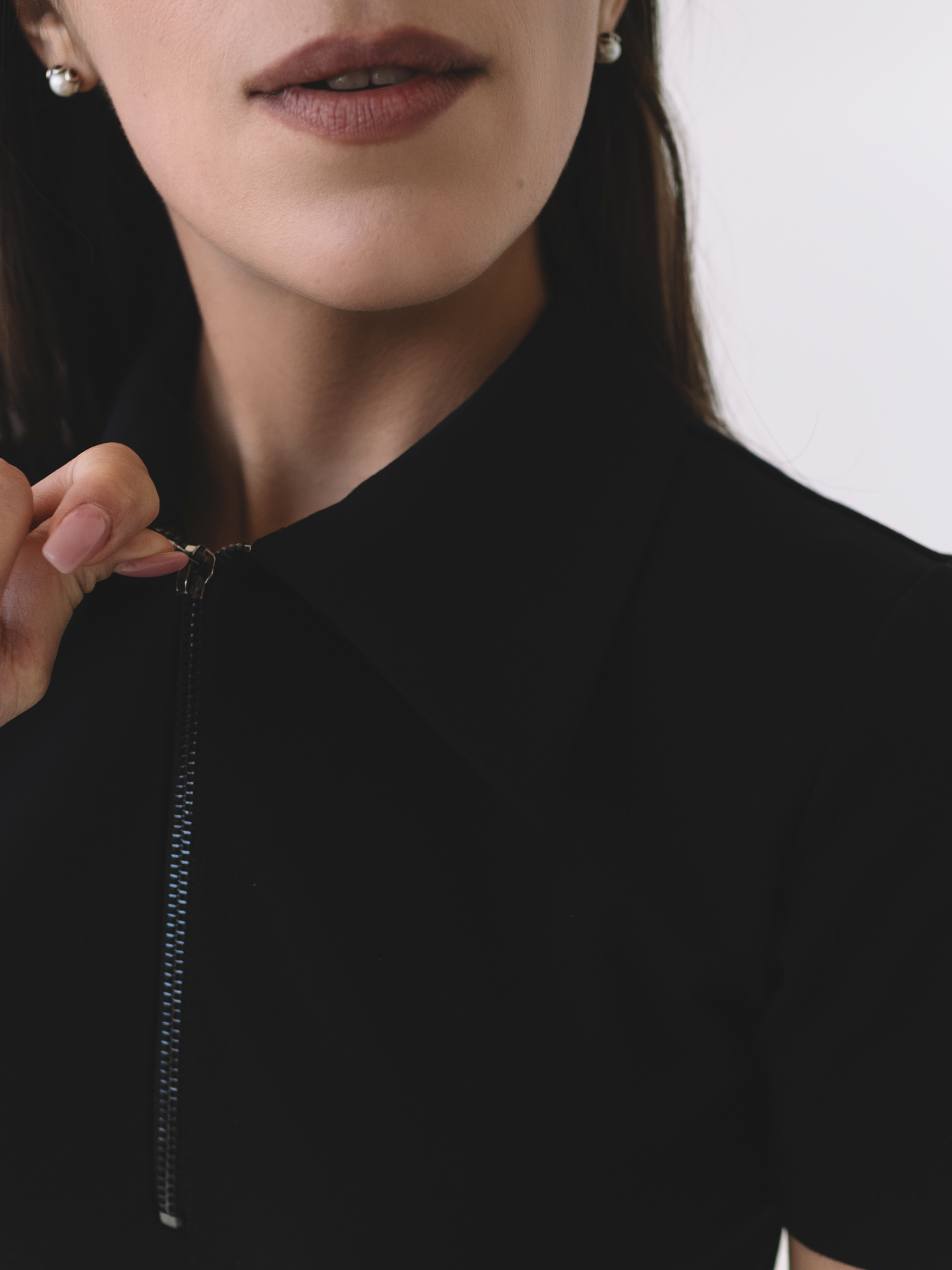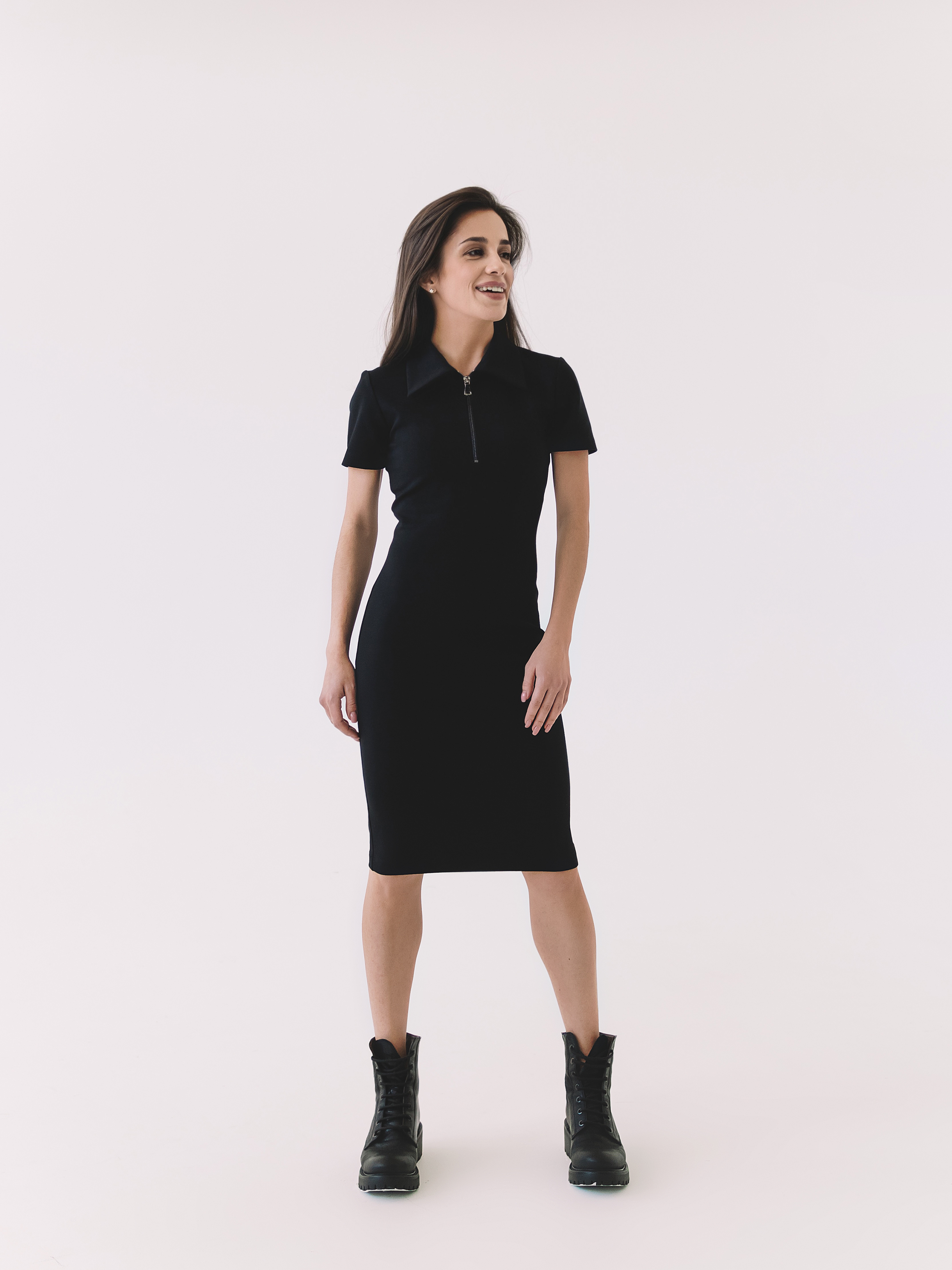 Облегающее платье из джерси, слегка зауженное к низу. Рукав короткий, втачной. Воротник отложной, спереди расположена застежка-молния.