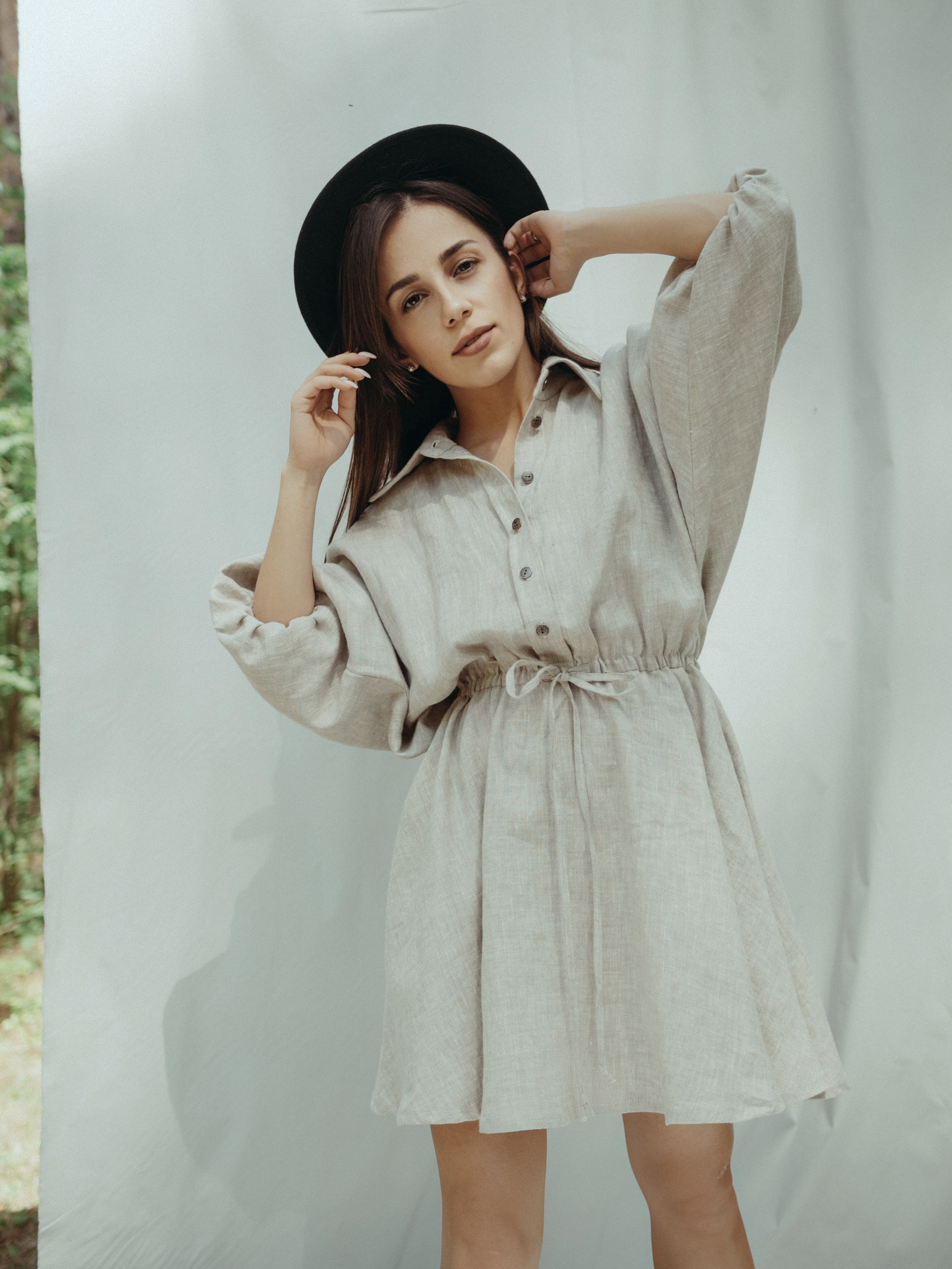 Платье объемной формы с цельнокроеным рукавом, отрезное по линии талии. На талии расположена кулиска с резинкой и декоративными шнурками. Воротник рубашечный. Застежка по переду до талии на планку с пуговицами. Юбка-полусолнце, с карманами в боковых швах. Низ рукава собран на резинку.
