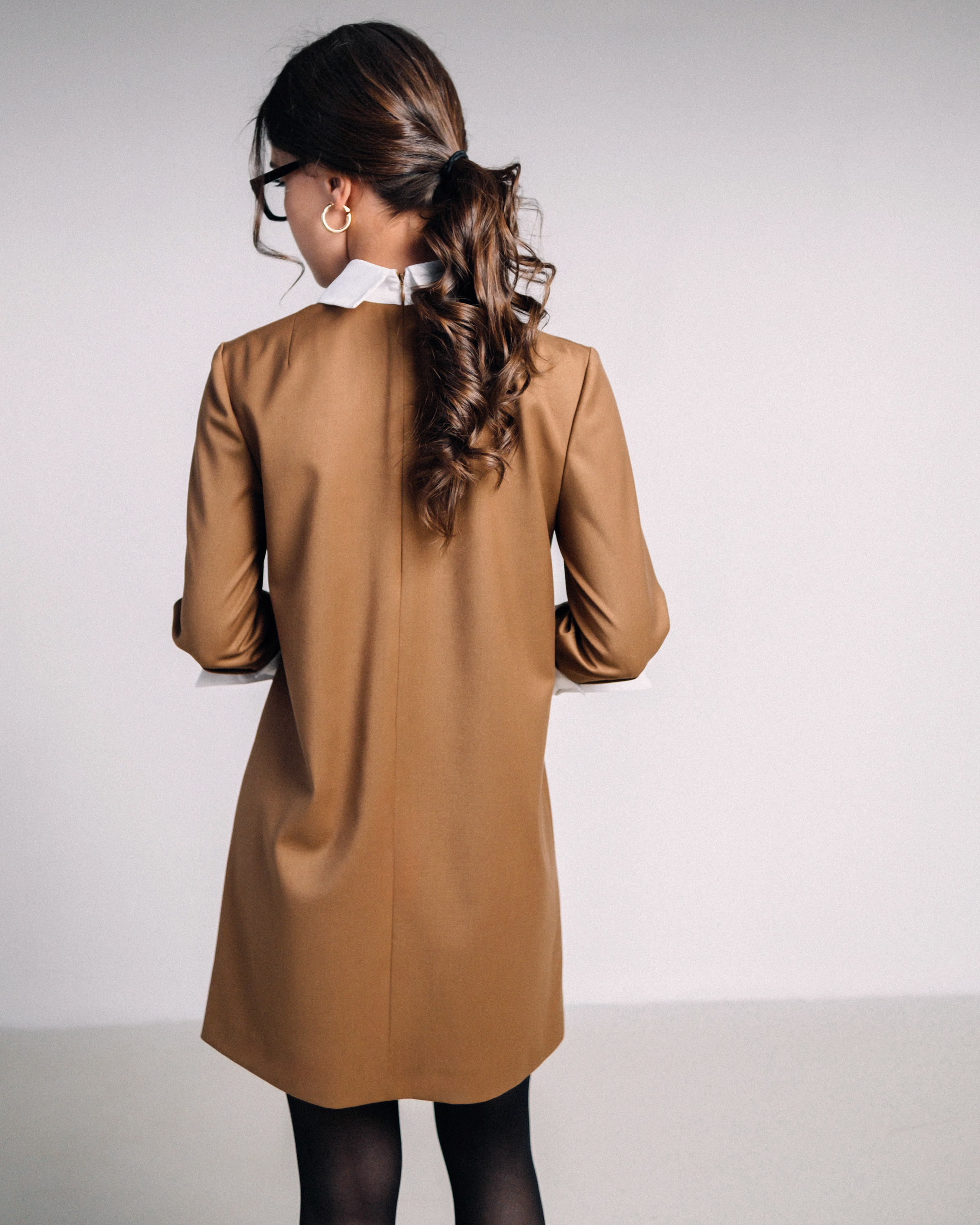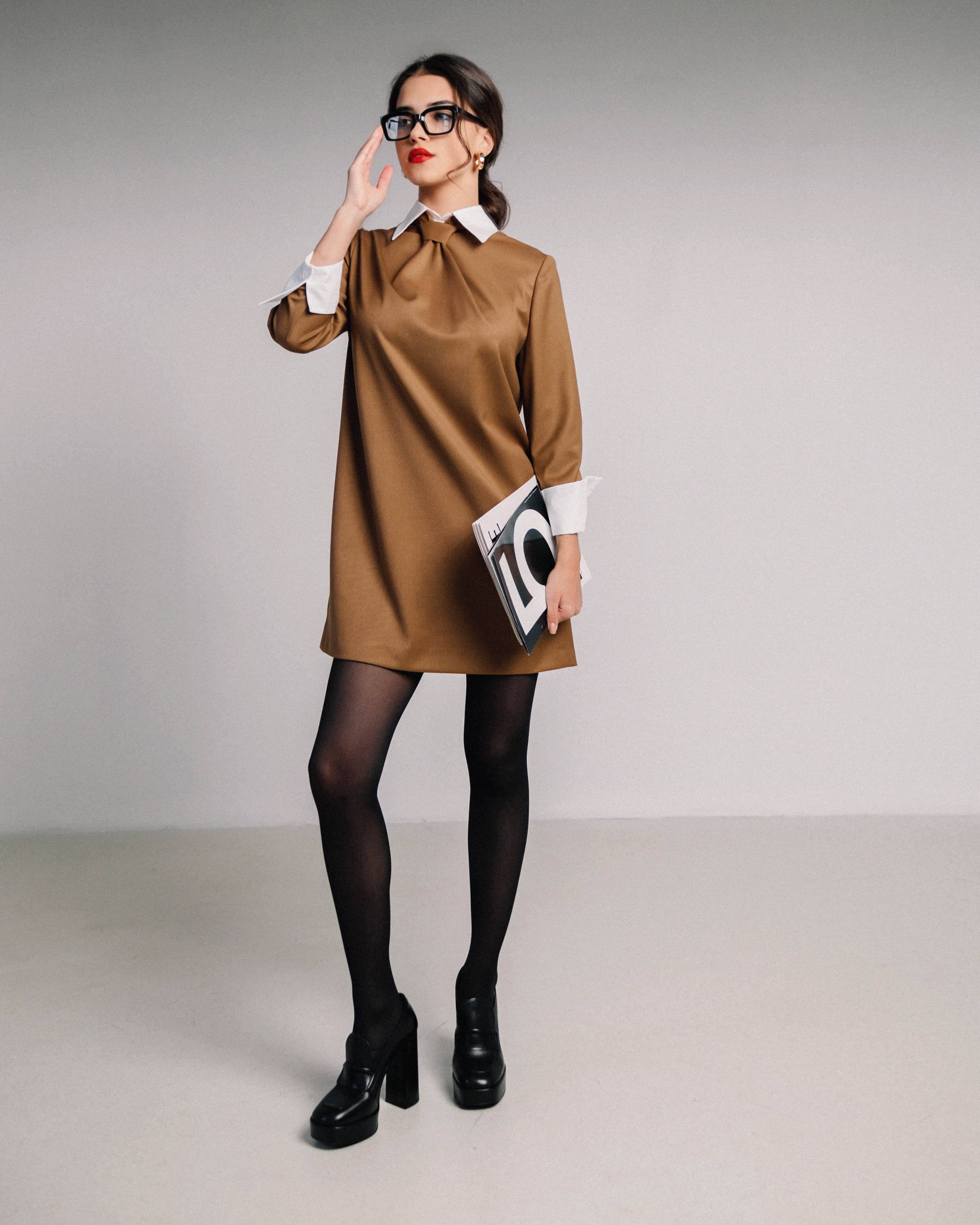Платье умеренного объема прямого силуэта. По переду платья имитация «галстука». Воротник притачной рубашечный. Спинка со средним швом с потайной застежкой-молнией. Рукав втачной, длиной 3/4, с отложной манжетой с одной пуговицей. Длина платья выше колена.