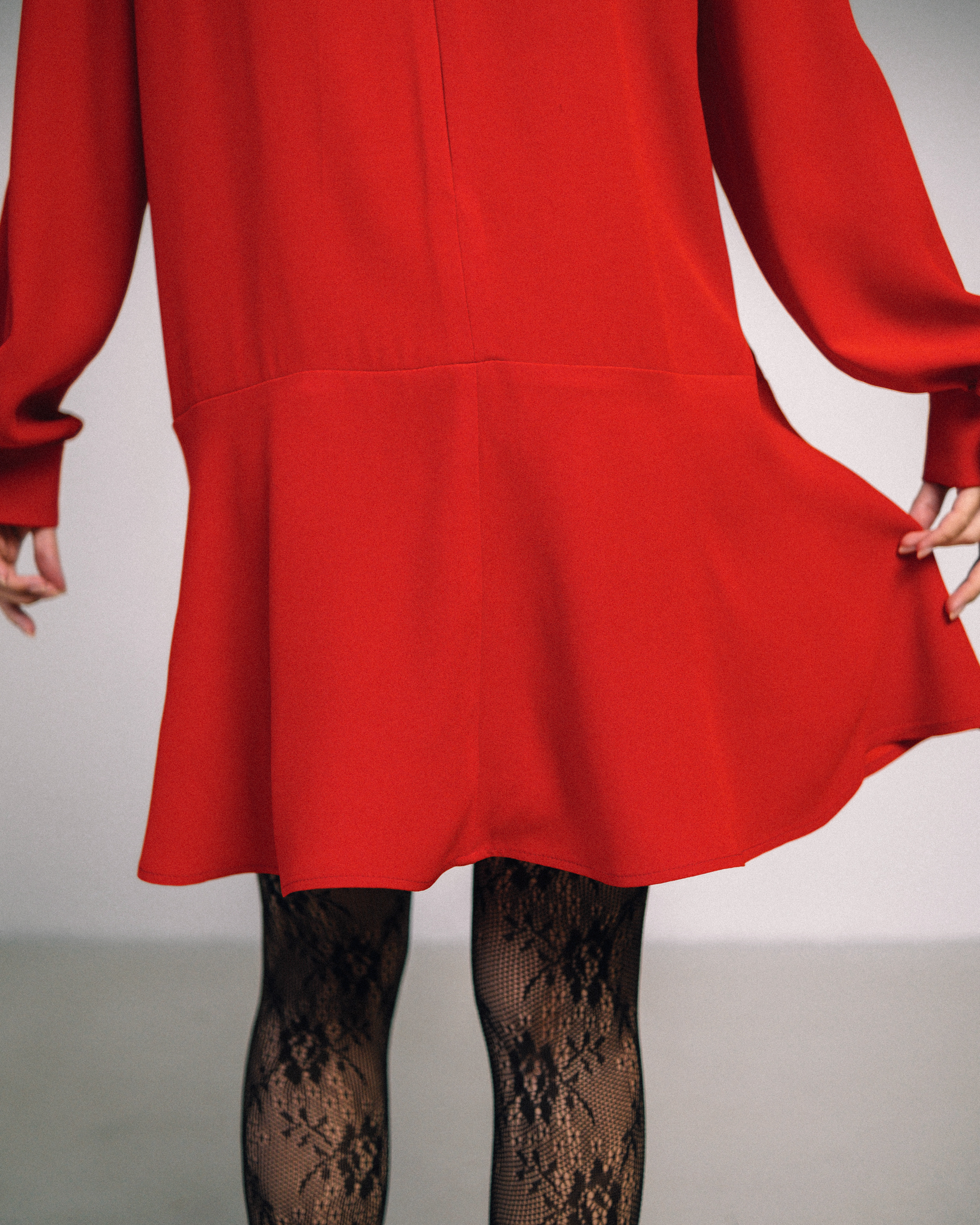 Платье умеренного объема расклешенного силуэта. По переду платья втачной пластрон со складками. Воротник – притачная стойка. Спинка со средним швом с потайной застежкой-молнией. Рукав втачной, длинный, со сборкой по низу и притачной манжетой, застегивающейся на 2 обтяжные пуговицы. На уровне линии бедер притачной широкий волан. Длина платья выше колена.