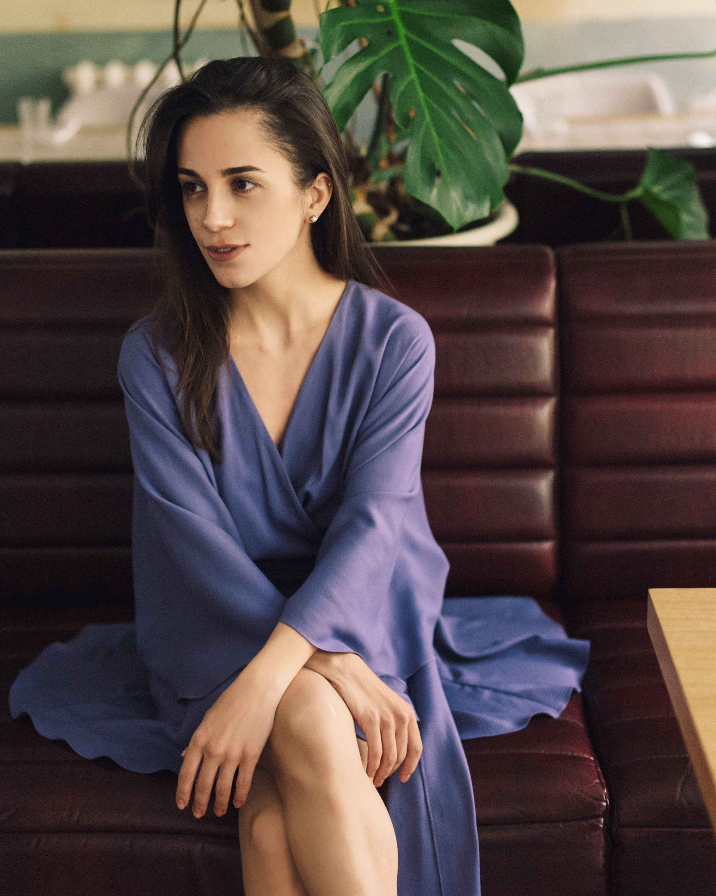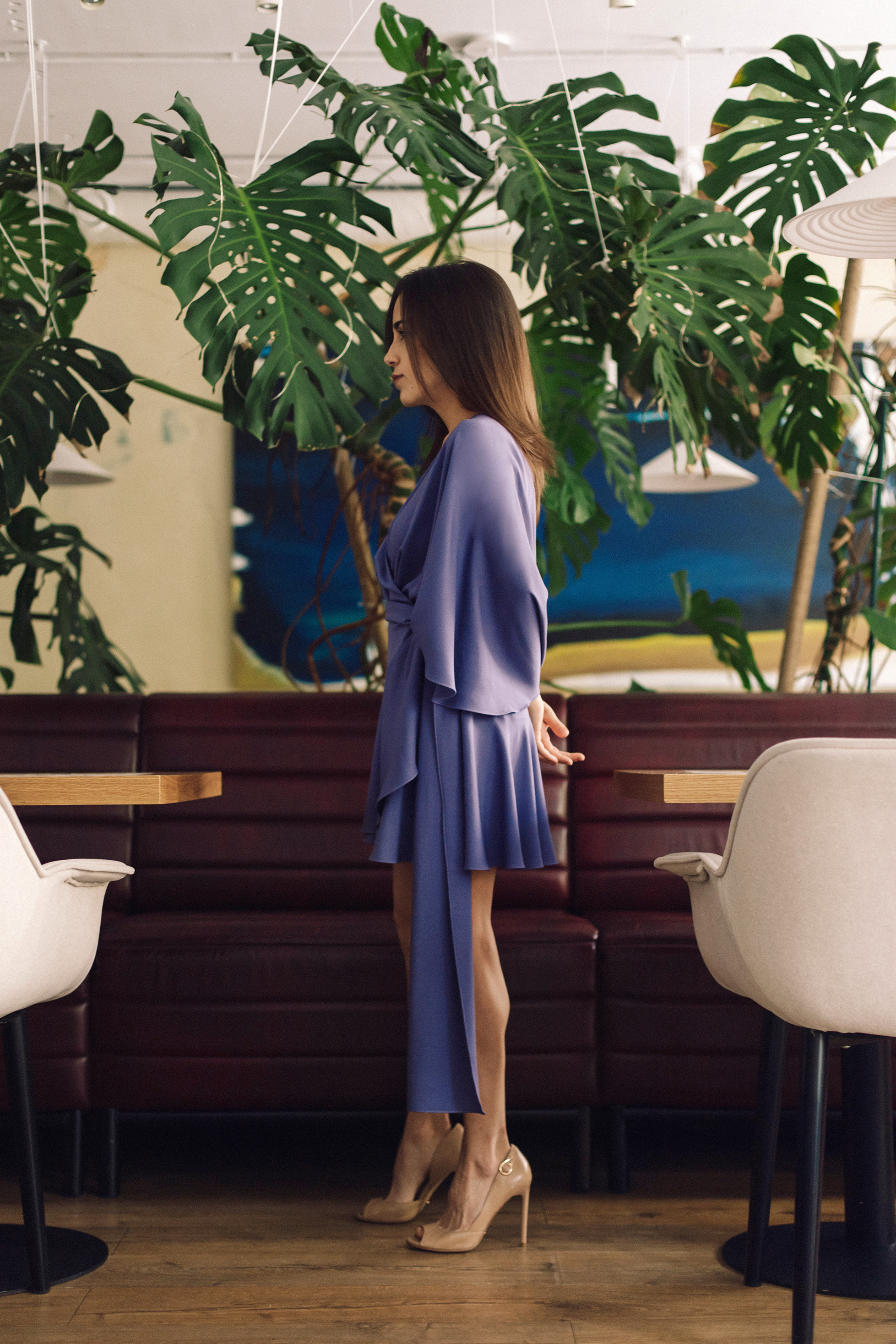 Платье с запАхом из тонкой вискозы, отрезное по линии талии. Лиф платья с длинными цельнокроеными рукавами-крыльями, со складками у талии. Вырез глубокий. Юбка асимметричная, с воланами. Фиксируется платье на фигуре внутренними завязками и длинным поясом вокруг талии.