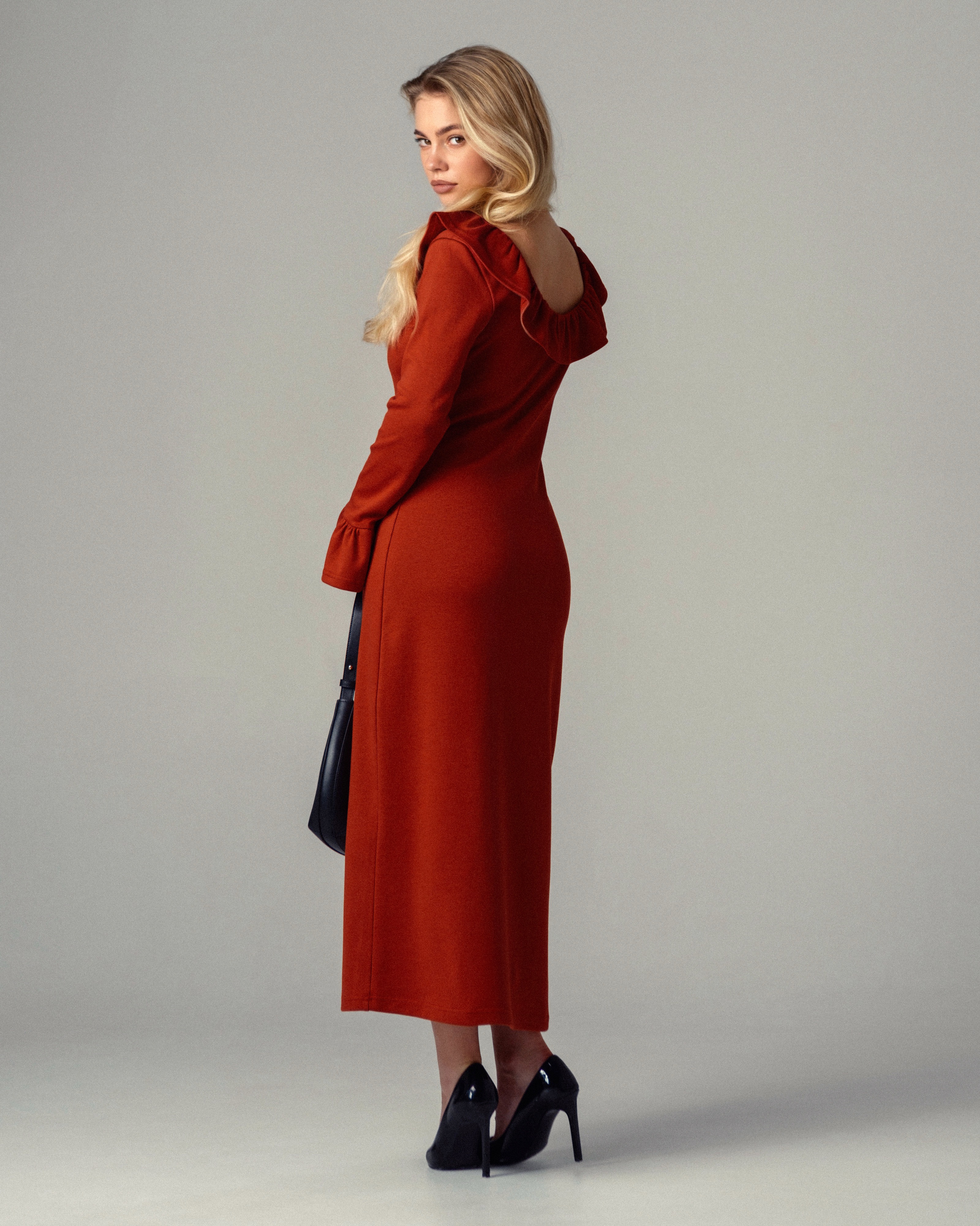 Платье малого объема прилегающего силуэта из трикотажного полотна. Длинный втачной рукав. Круглый вырез спереди, углубленный вырез на спинке. Вырез обработан притачным воланом. По низу рукавов притачные воланы. Длина платья выше щиколотки
