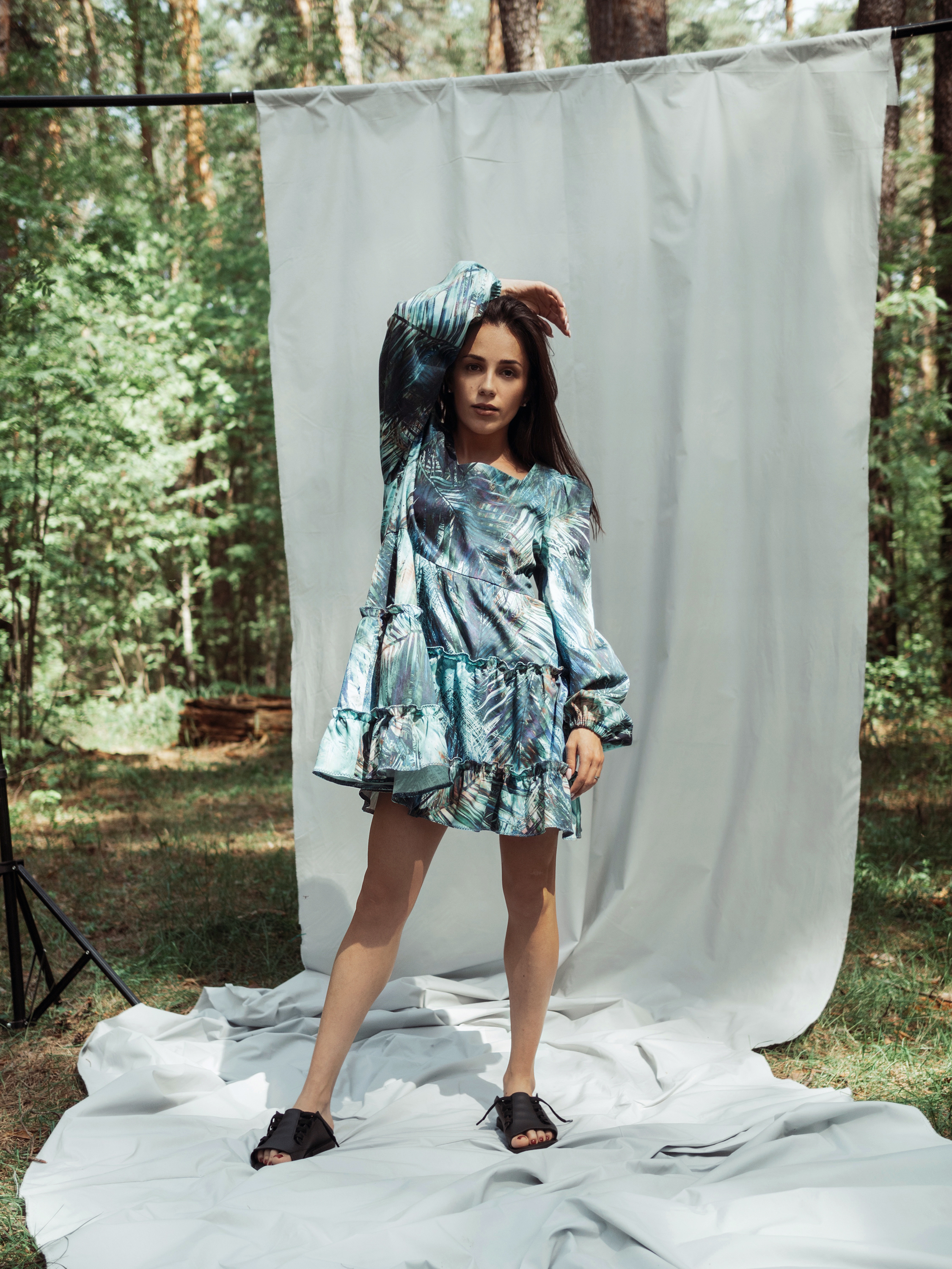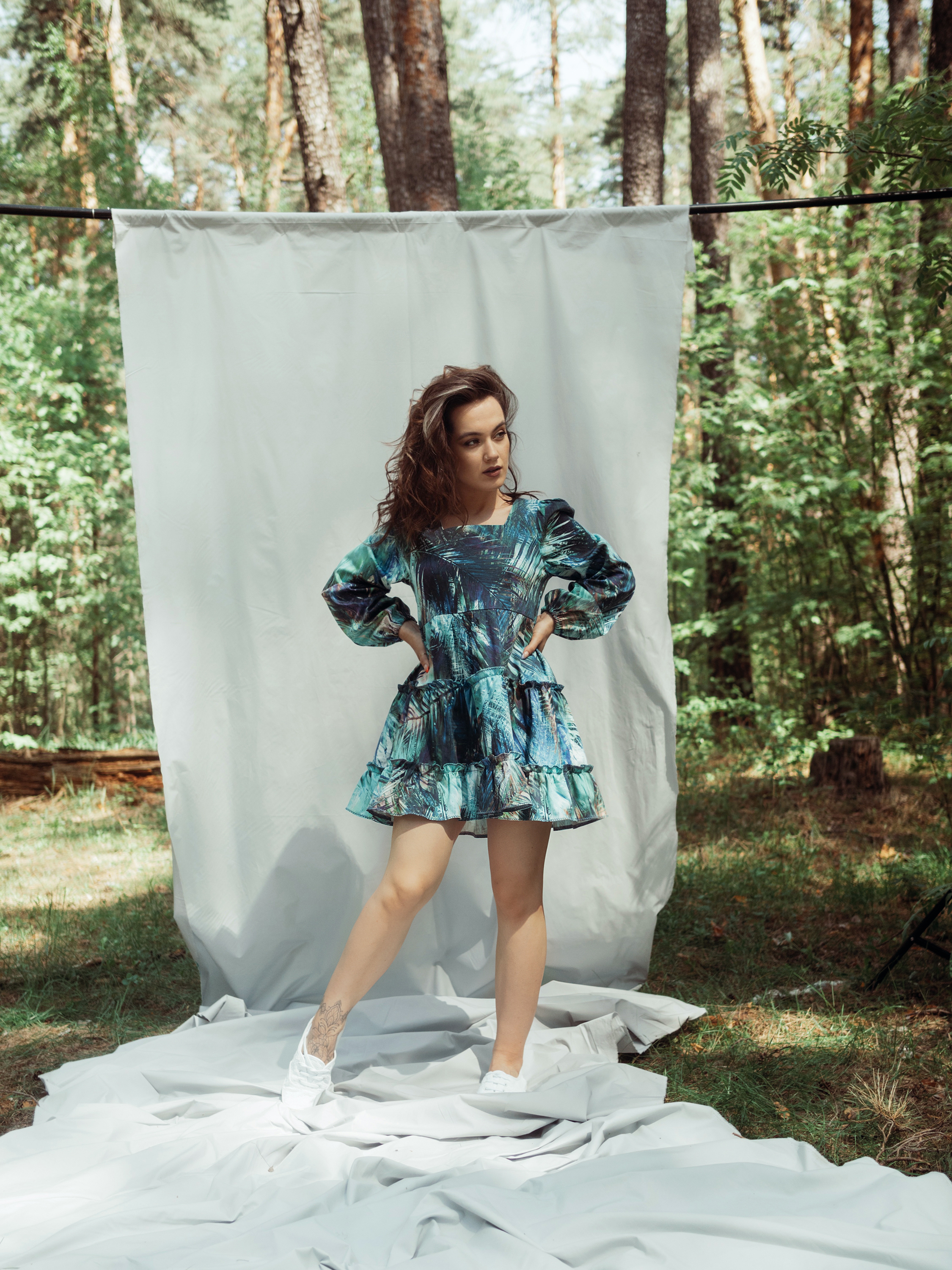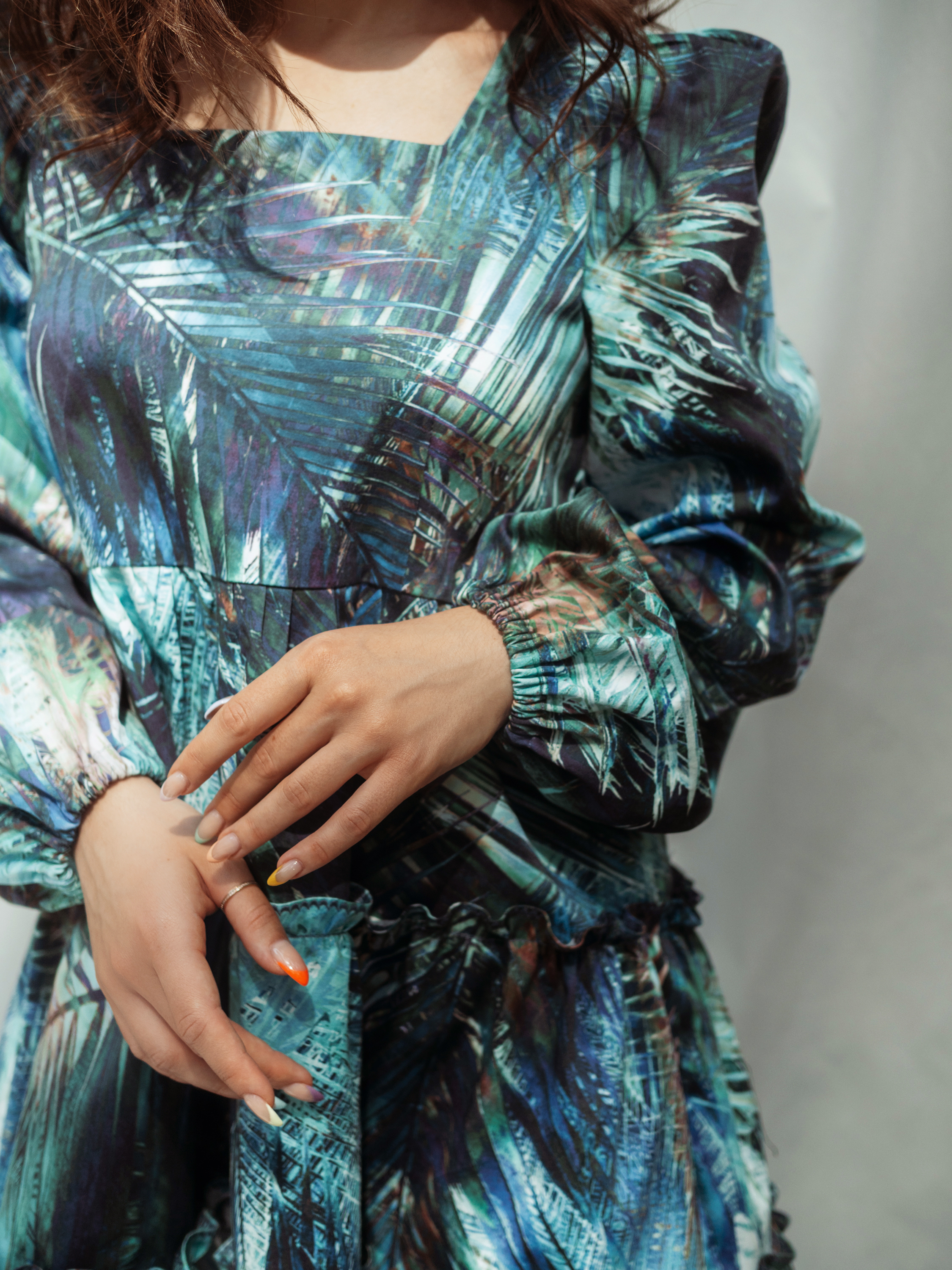 Платье из плотного хлопка, с квадратным вырезом горловины, длинным рукавом и тремя ярусами оборок. Линия талии завышена. На переде расположены талиевые вытачки, на спинке – талиевые вытачки и вытачки на выпуклость лопаток. Застежка на потайную молнию в среднем шве спинки. По окату рукава выполнена сборка, по низу рукава – кулиска с резинкой. Декоративная строчка на оборках сделана на бытовой машинке.