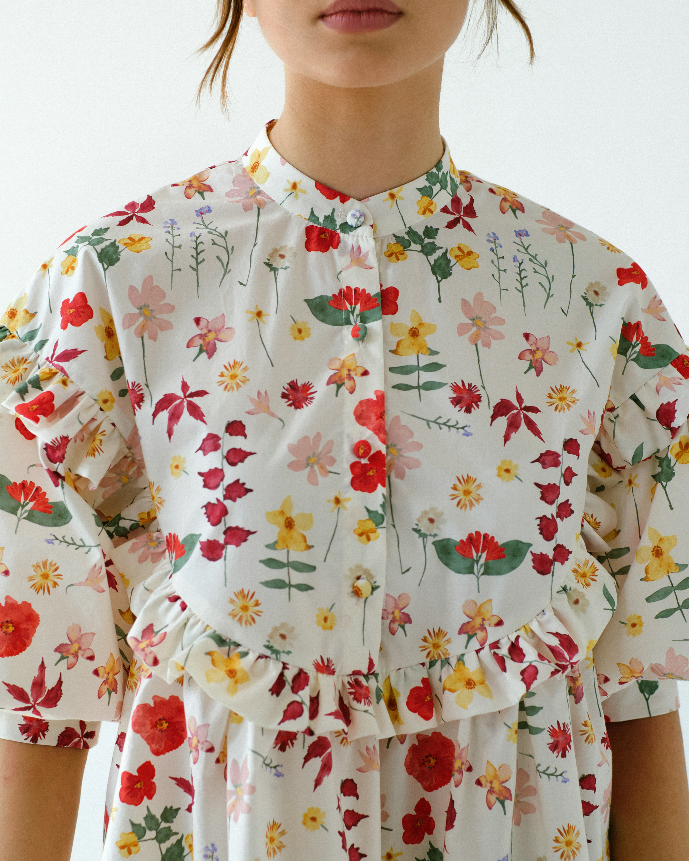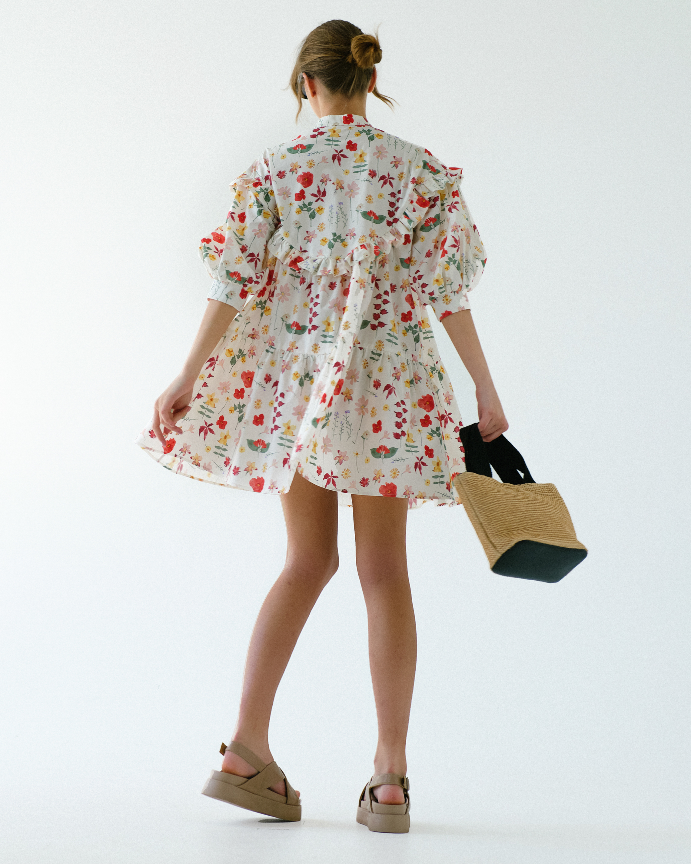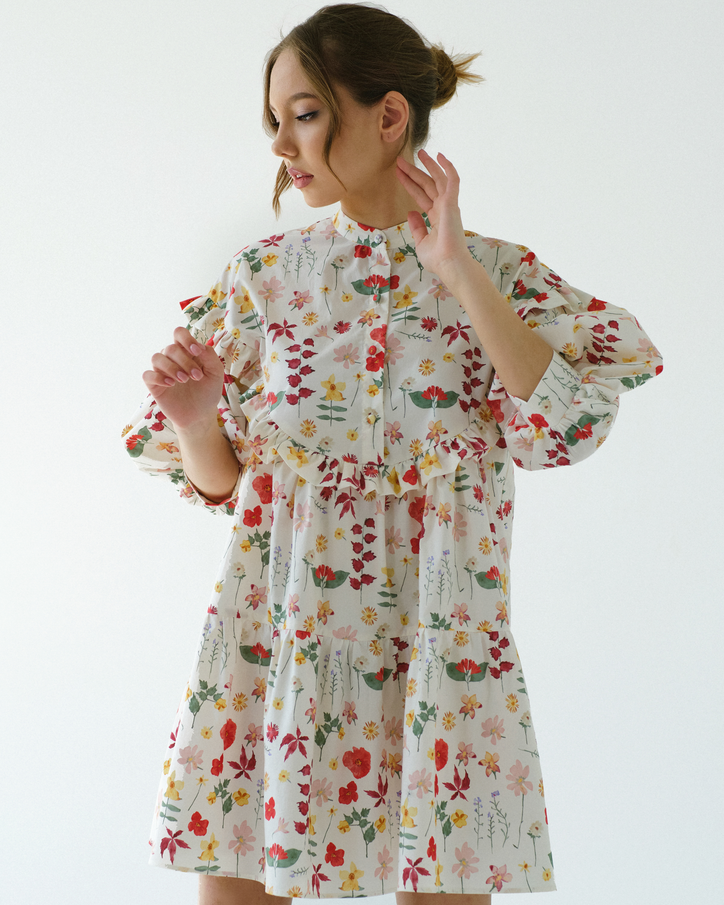 Объемное платье А-силуэта в романтическом стиле из хлопчатобумажного поплина длиной выше колена. Кокетка платья спереди и сзади отделана рюшем по краю. Объёмную, свободную форму платью и рукавам придают сборки, идущие от кокетки. Кокетка переда и воротник-стойка с застёжкой на пуговицы. Рукава по низу собраны на манжеты. По низу платья волан со сборкой.
