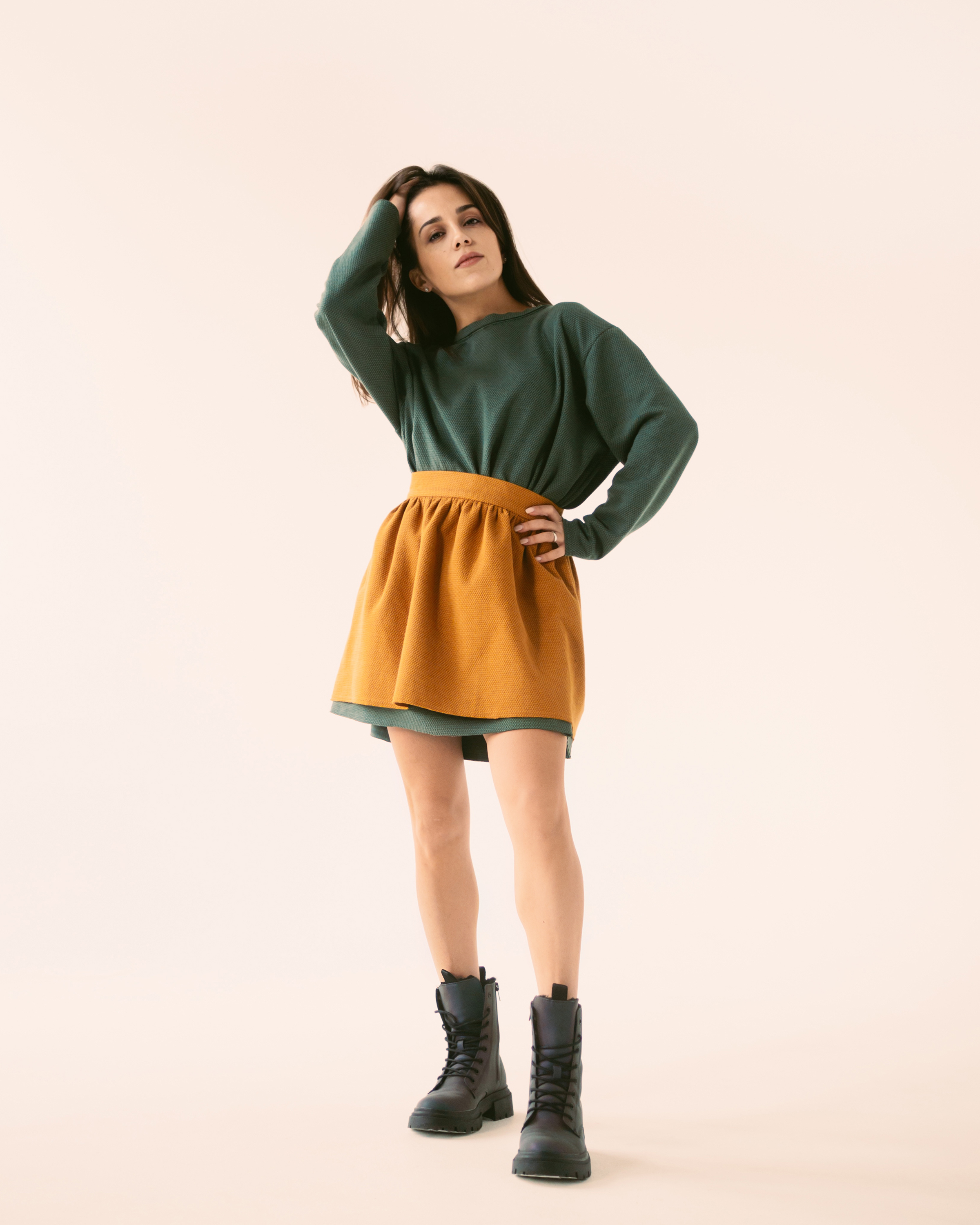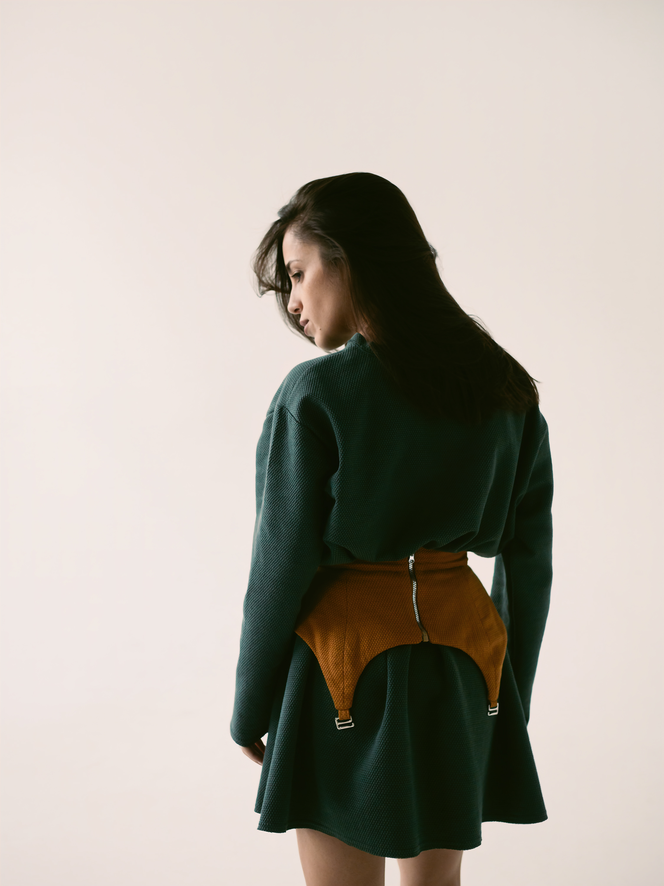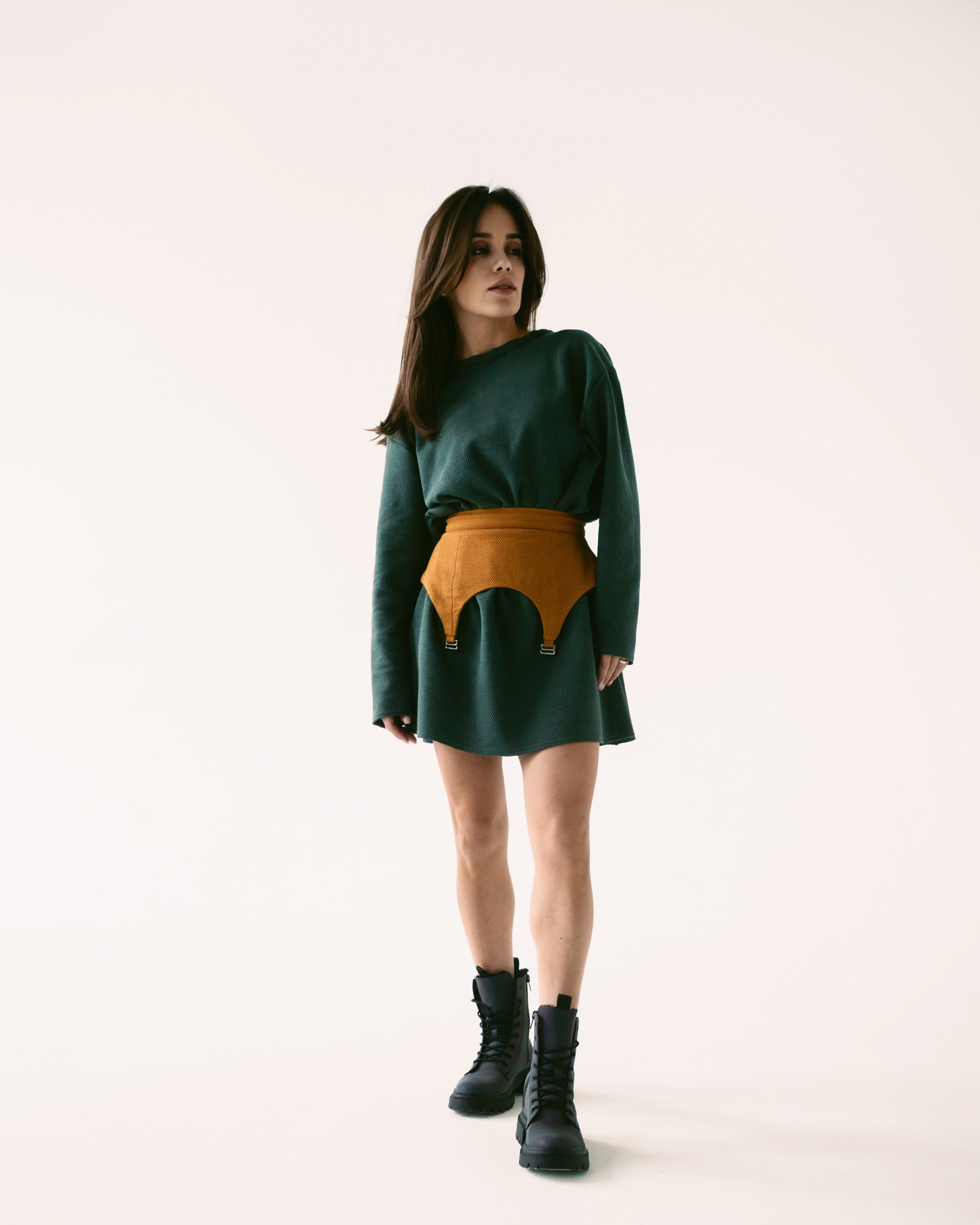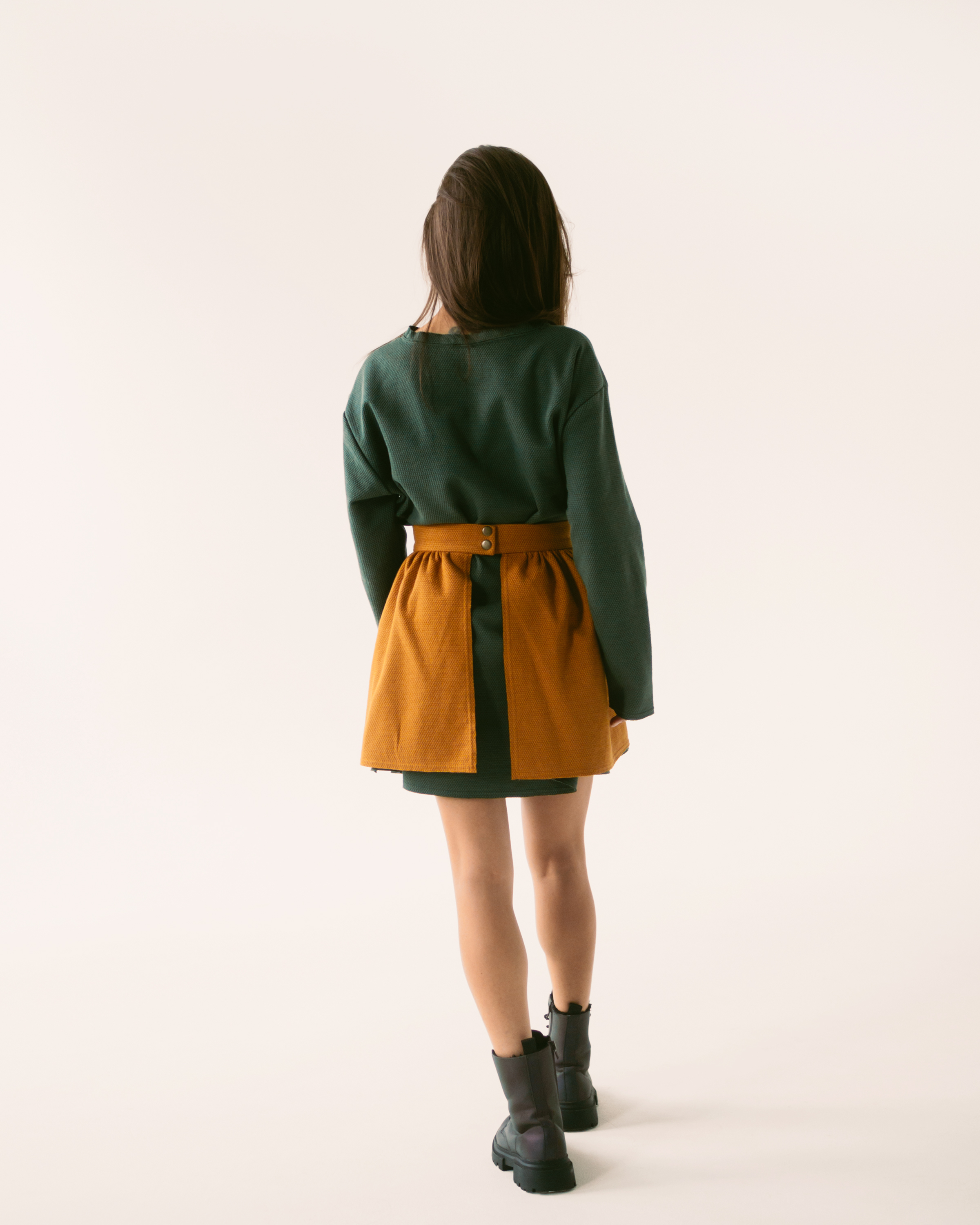 Платье А-силуэта свободного кроя из трикотажа. Рукав со спущенным плечом. Горловина обработана бейкой с открытым срезом. Нижние срезы рукавов и платья отстрочены на распошивальной машине без подгибки. Платье дополняют съемные пояс-корсаж и юбка-фартук. Пояс-корсаж на подкладке, на притачном поясе, застегивается на молнию сзади. Фигурная линия низа дополнена крючками. Юбка – фартук с открытыми срезами, на притачном поясе, застегивающемся на кнопки.
