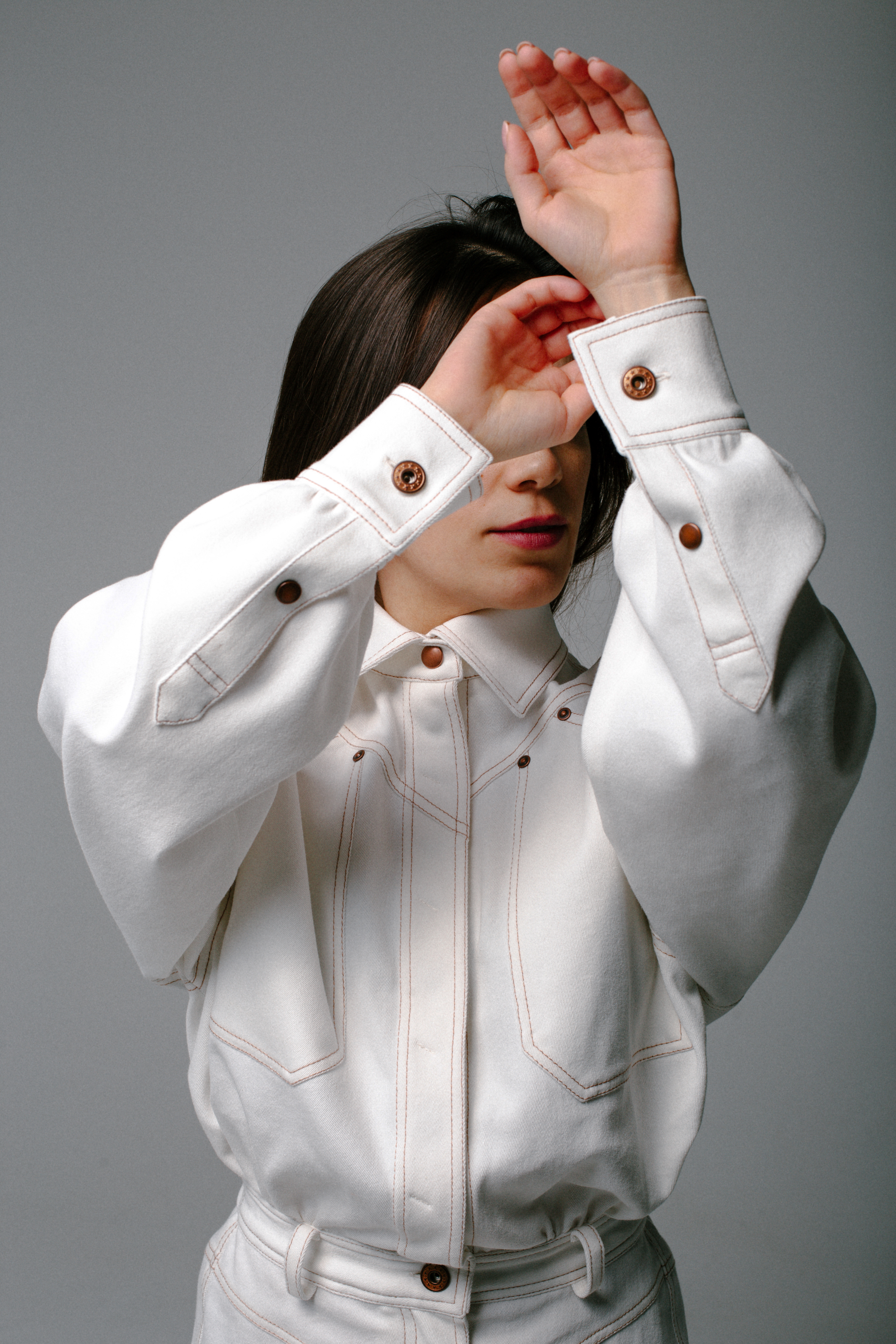 Рукав спущенный рубашечный, на манжетах. Застежка супатная на кнопки, воротник рубашечный.