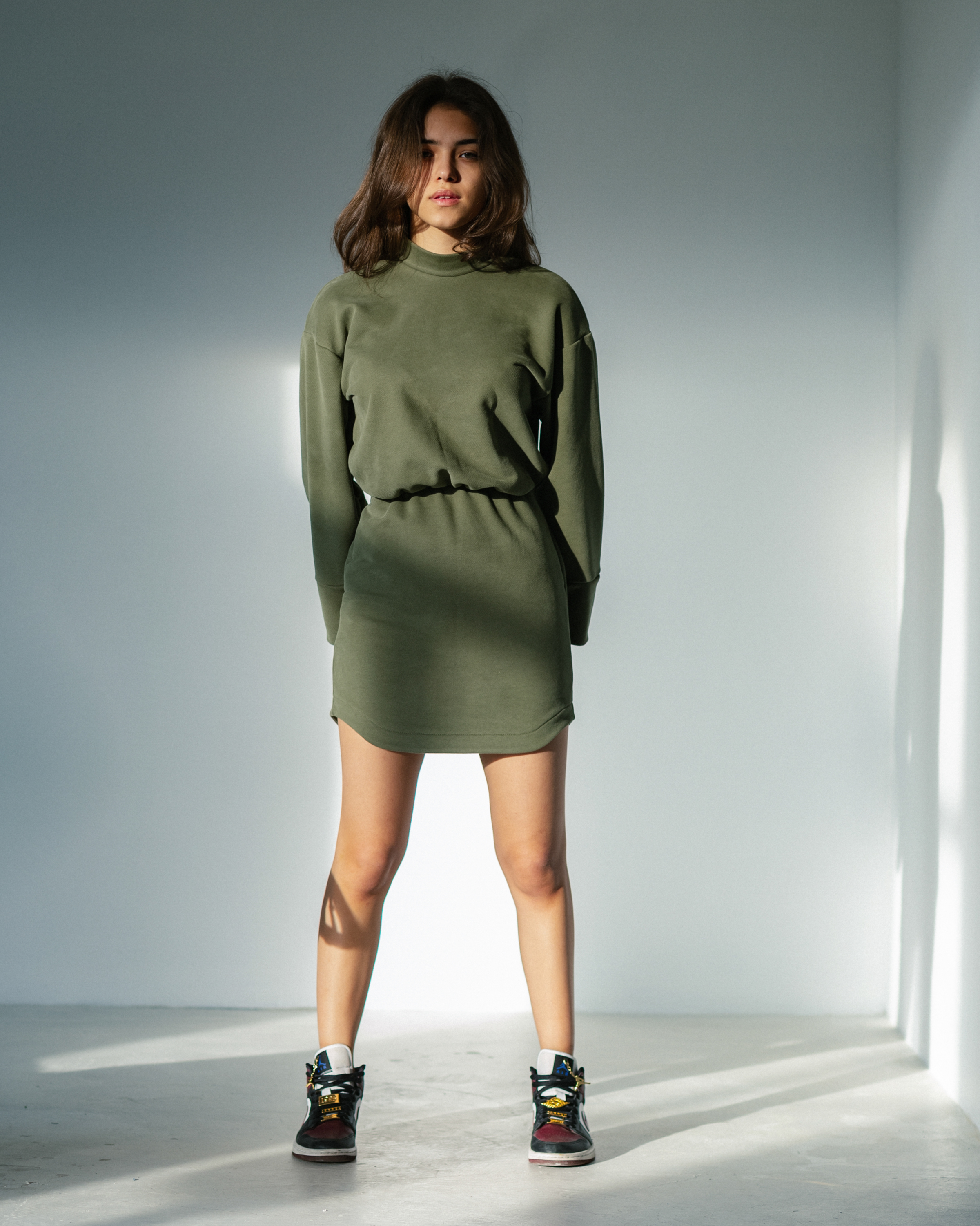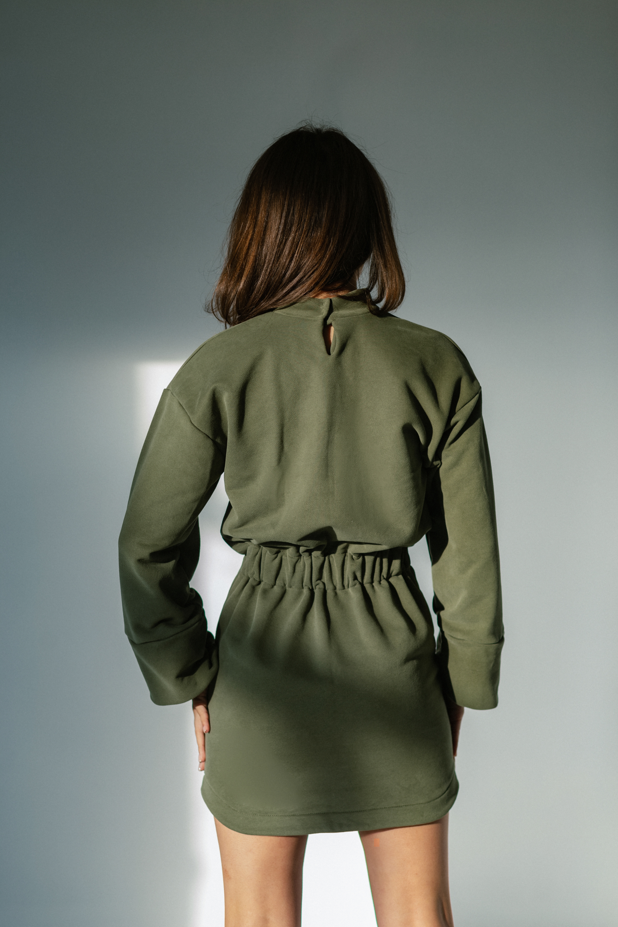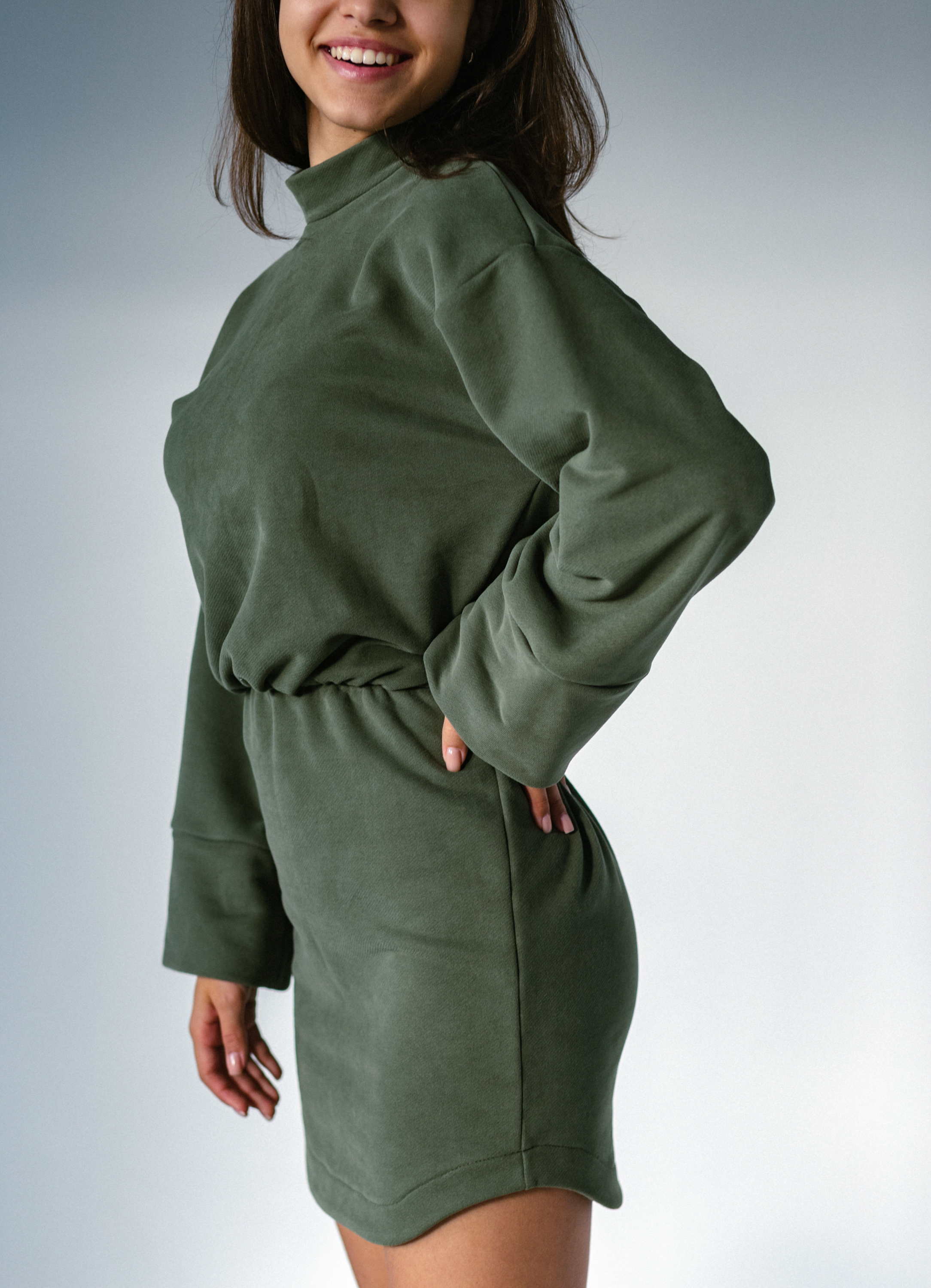 Платье из футера трехниточного с велюровым эффектом. Перед платья отрезной по линии талии, в шов втачана резинка. Спинка цельнокроеная с притачной кулиской по линии талии с продернутой резинкой. Линия проймы спущена, рукав рубашечный, широкий, прямой, с притачной широкой манжетой. Воротник стойка, с застежкой на спинке на 2 пришивные кнопки. Низ платья фигурный, завышенный у боковых швов.