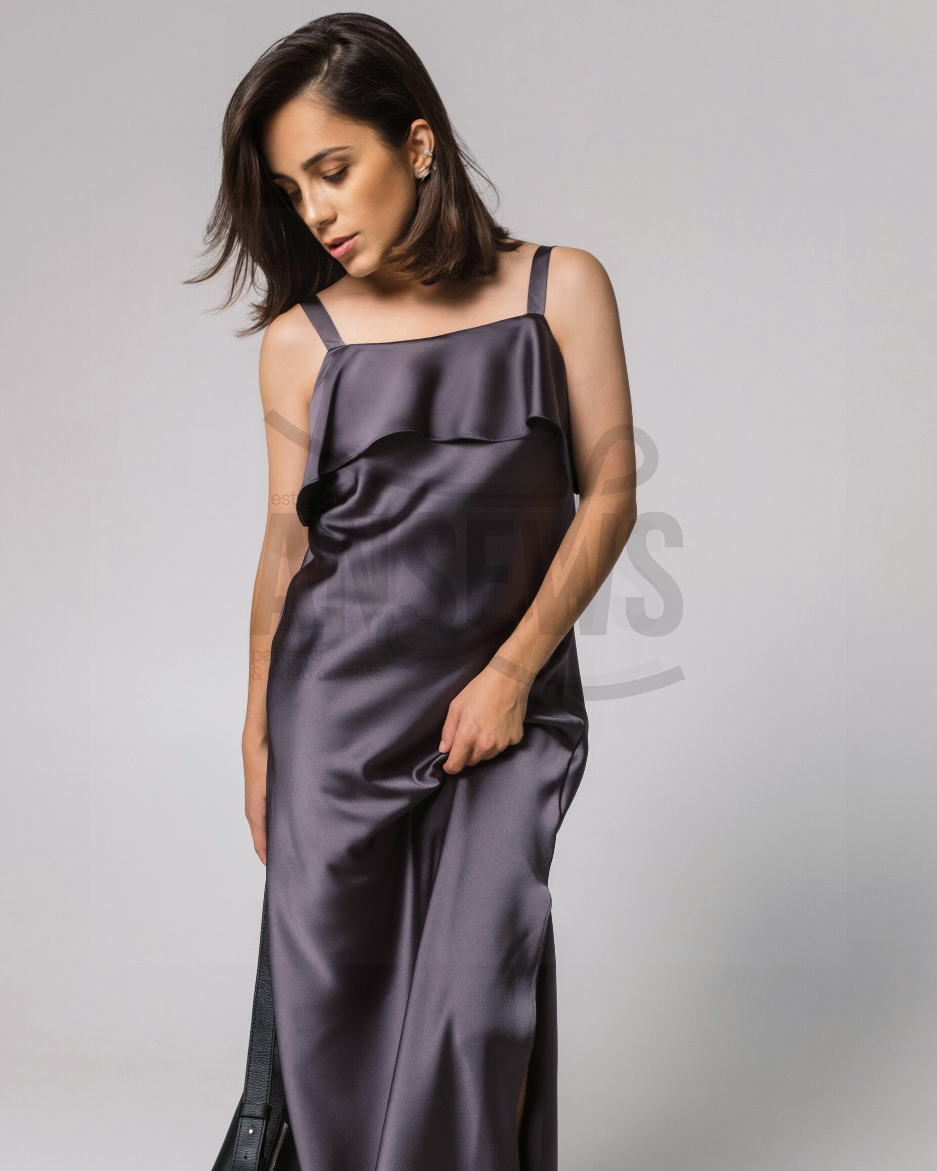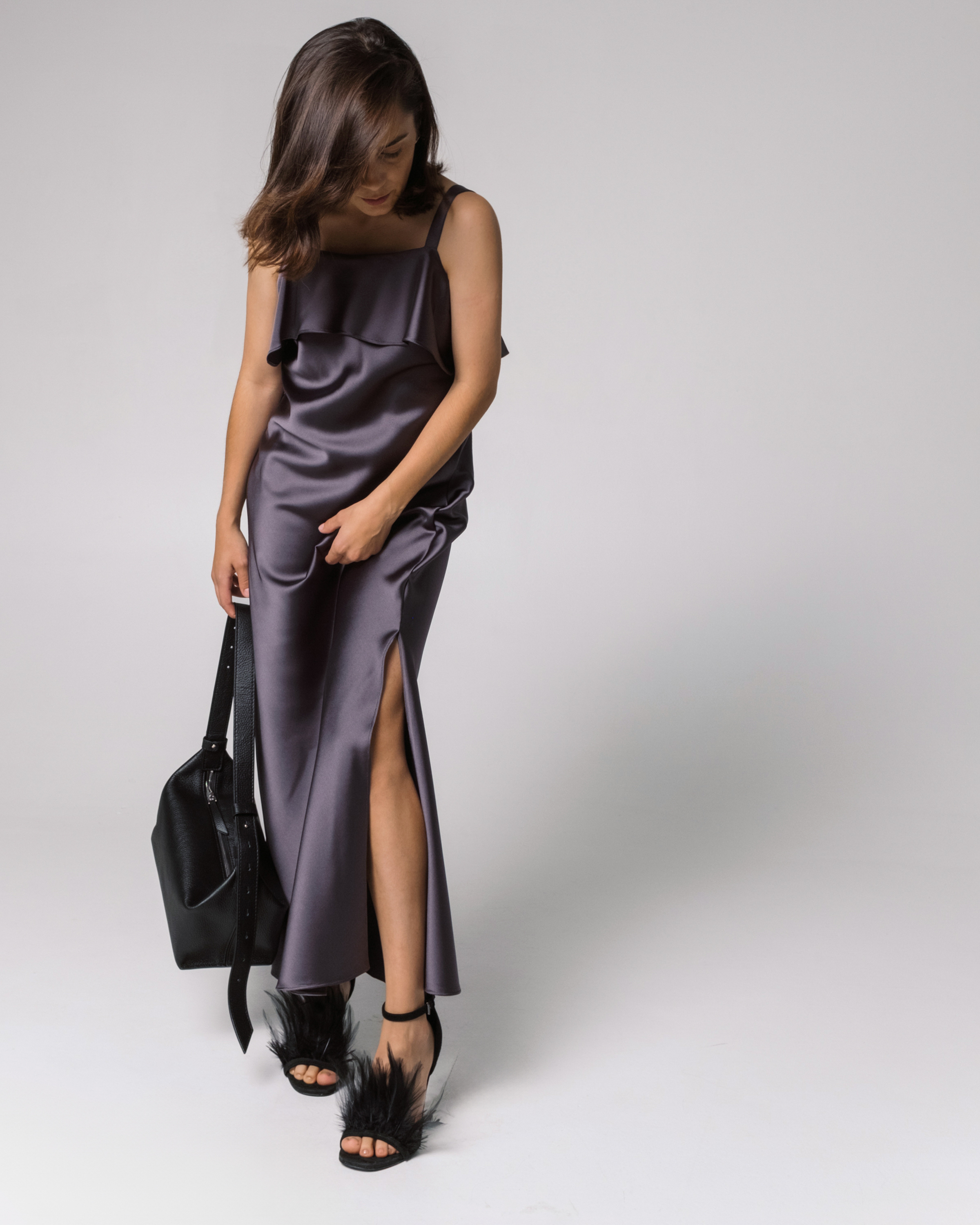 Платье малого объема, А-силуэта, на тонких бретелях. Платье выкроено по косой нити. Верхний срез платья обработан притачными воланами. В боковых швах расположены высокие разрезы.