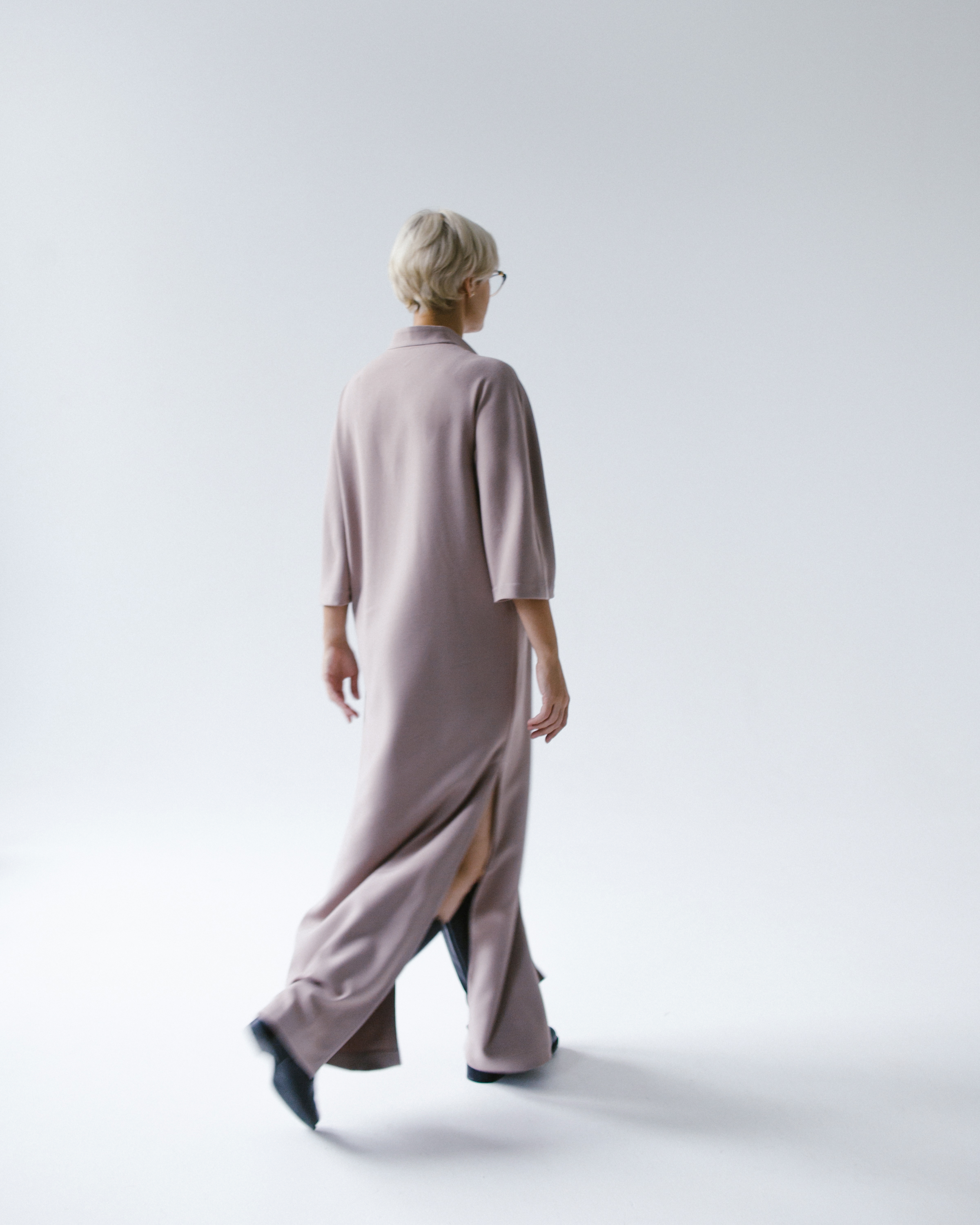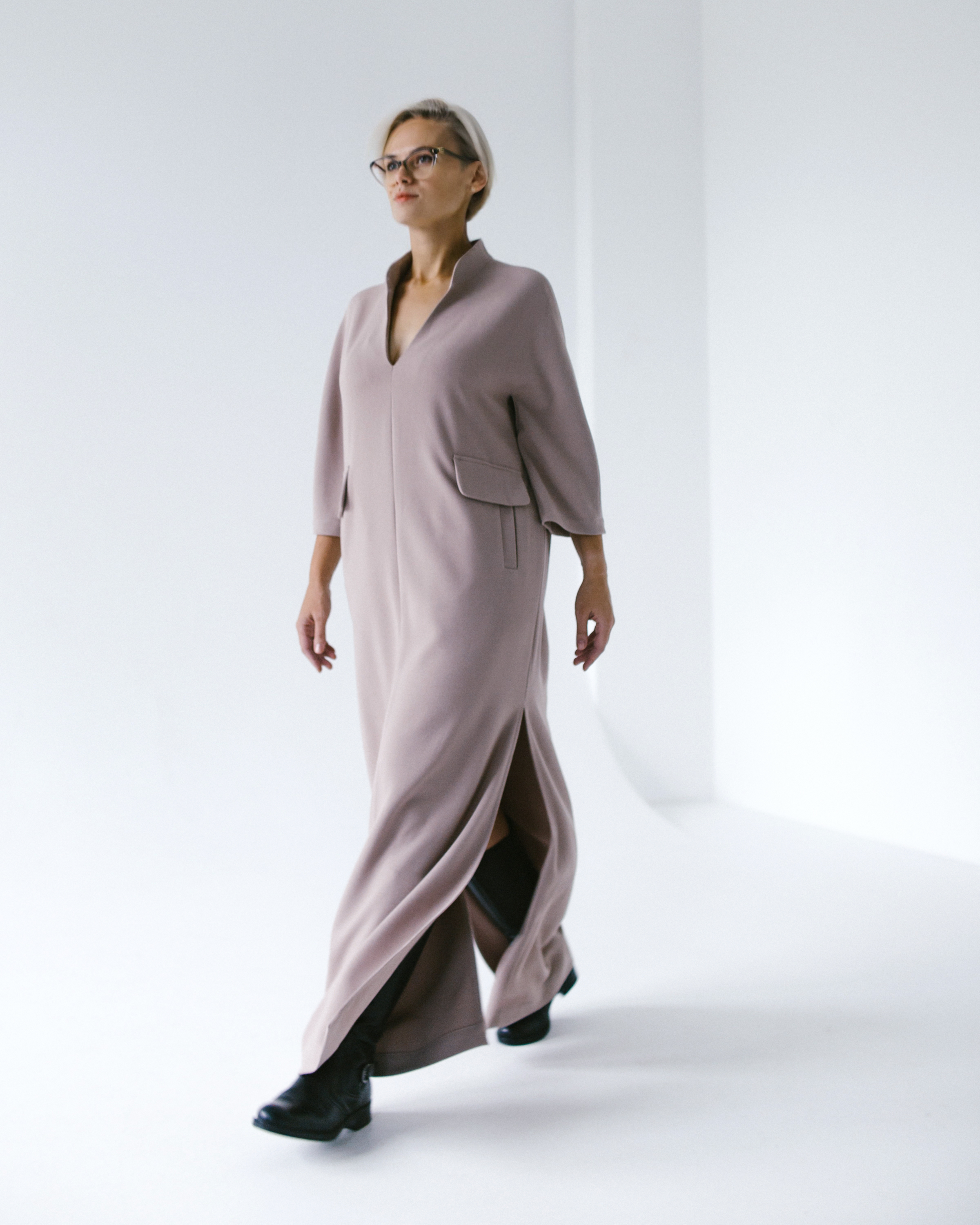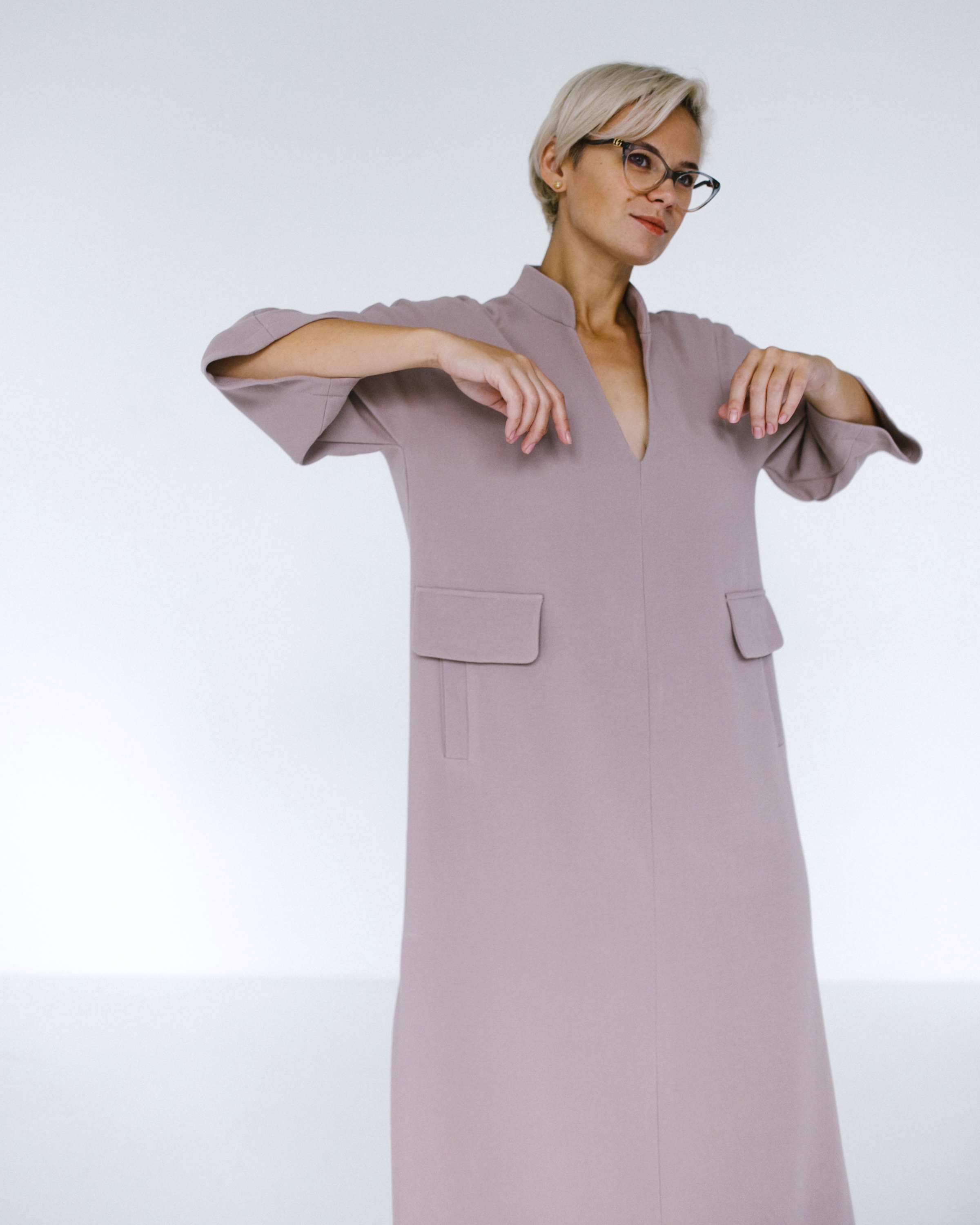 Платье из костюмной ткани прямого силуэта. Воротник стойка, V-образный вырез. Рукав длиной ¾, цельнокроеный, с ромбовидной ластовицей. Спереди расположены вертикальные прорезные карманы с листочкой и горизонтальным клапаном. В боковых швах – высокие разрезы.