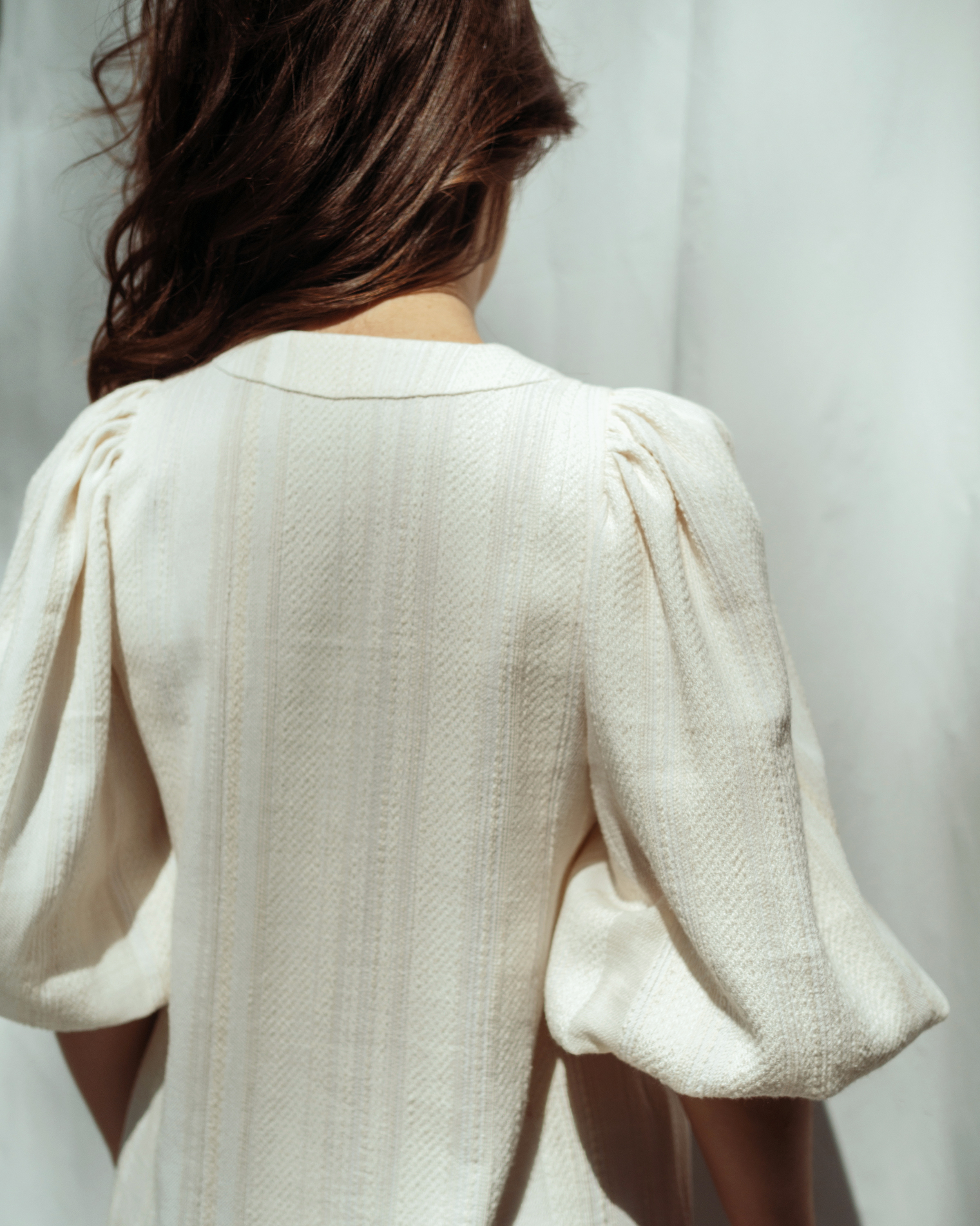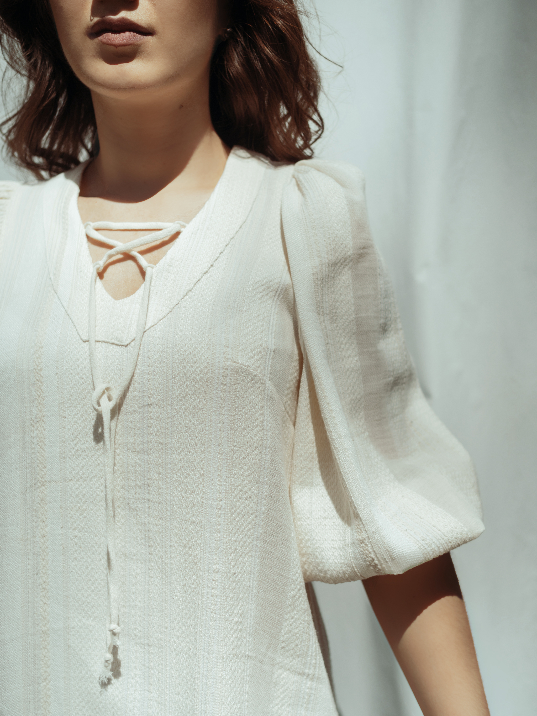 Короткое платье из льняного фактурного полотна с очень объемным рукавом. V-образный вырез горловины оформлен декоративной обтачкой со шнуровкой. Платье немного расширено к линии низа. Низ платья обработан широкой подгибкой. Рукав длиной до локтя, сосборен по окату и собран на резинку по низу.